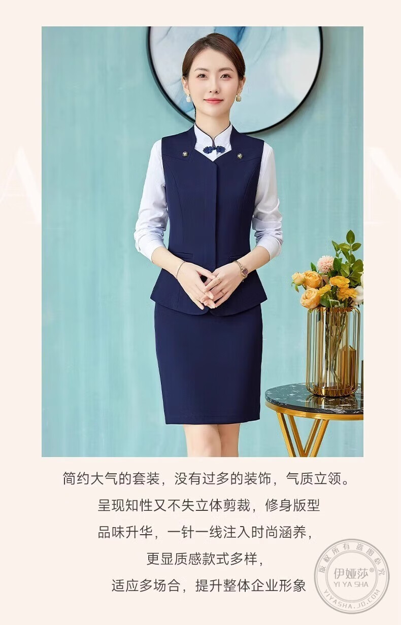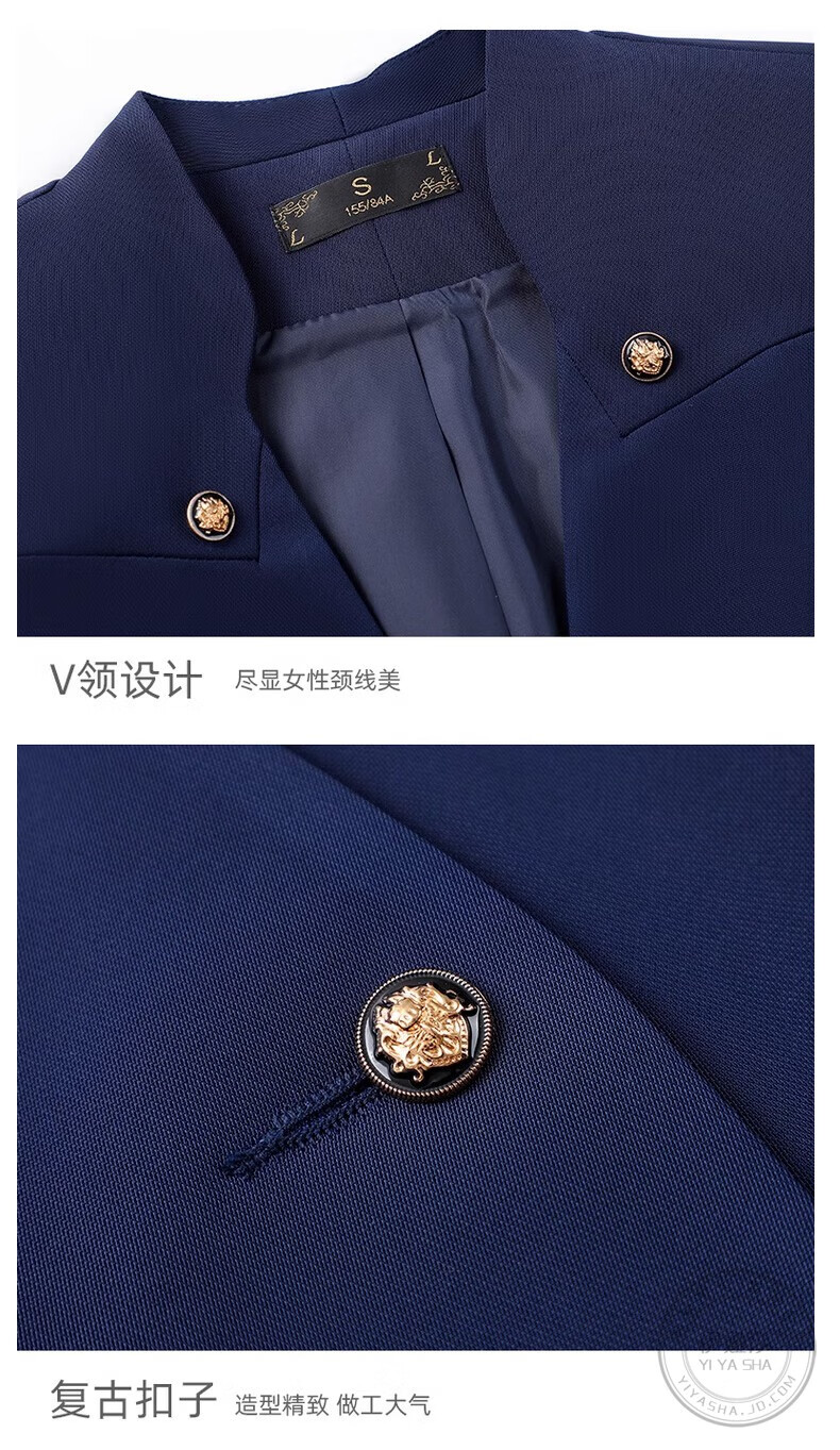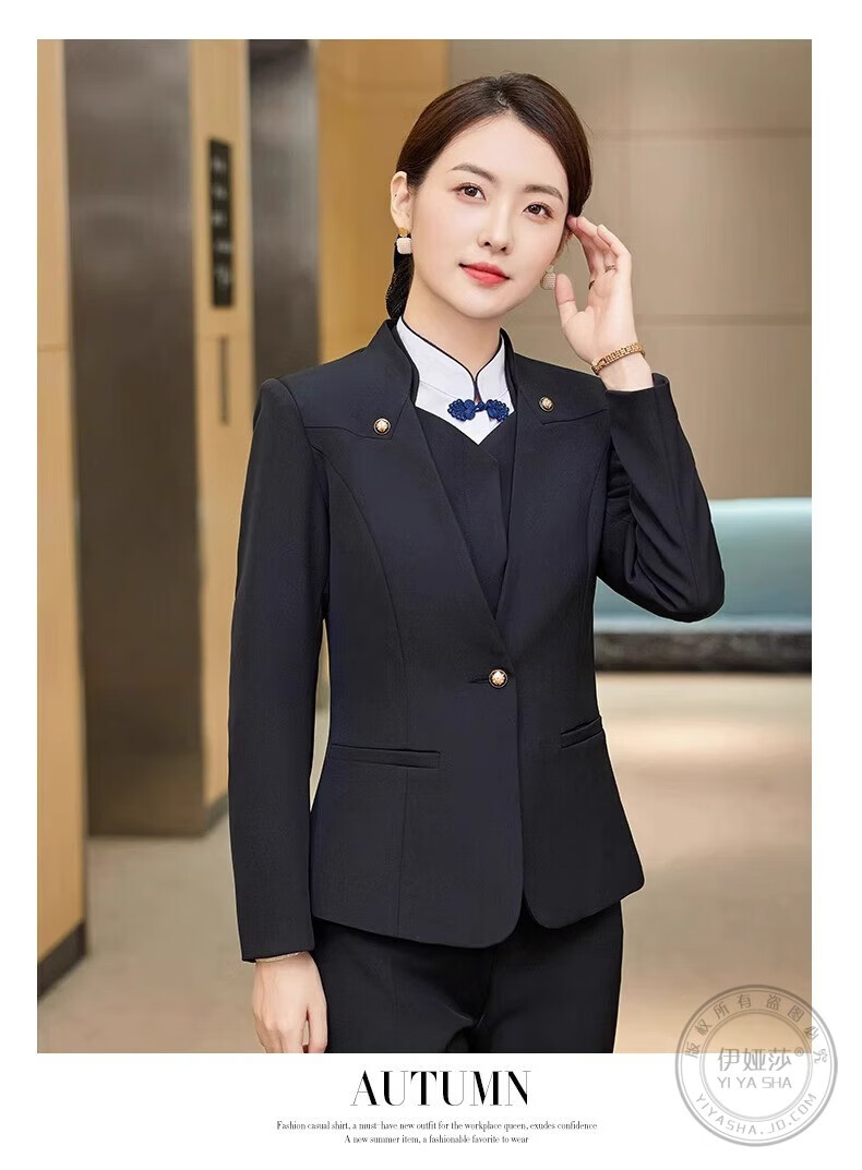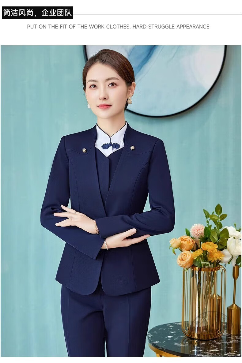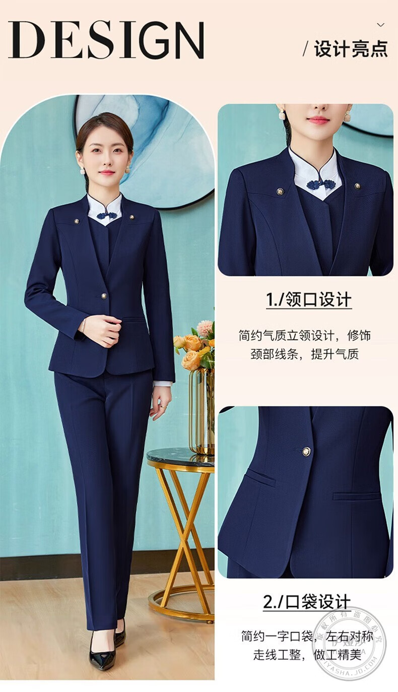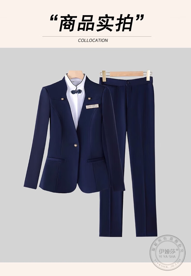 Iyasha hotel front desk reception work clothes for women high-end temperament professional suit suit Chinese catering waiter work clothes blue suit + shirt + pants XL recommended 110-120 Jin Jin equals 0.5 kg