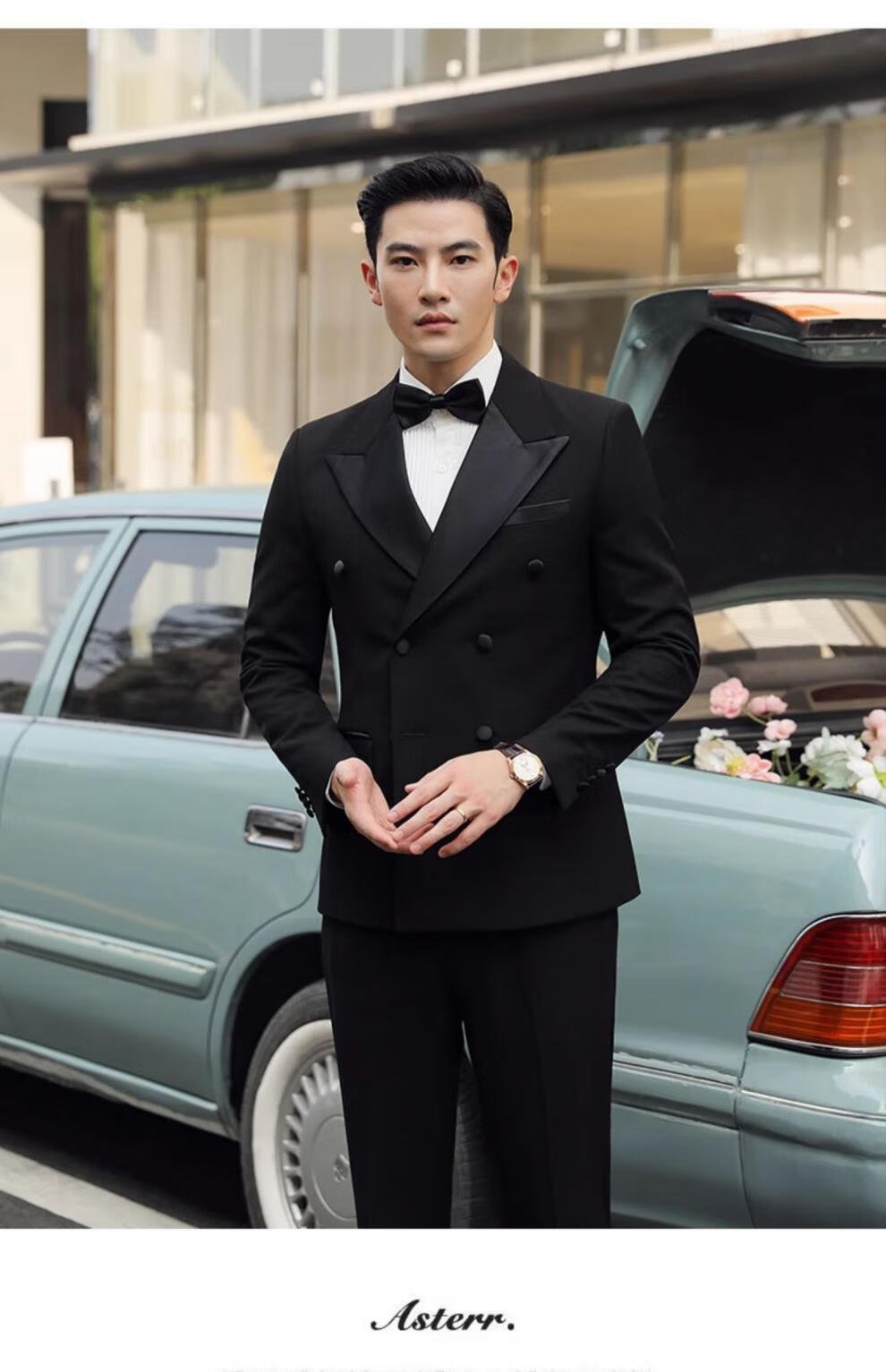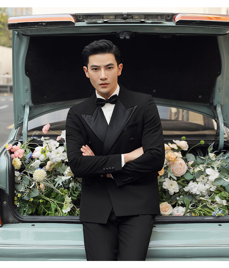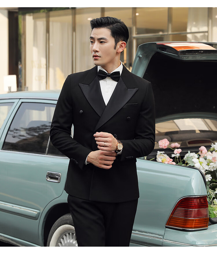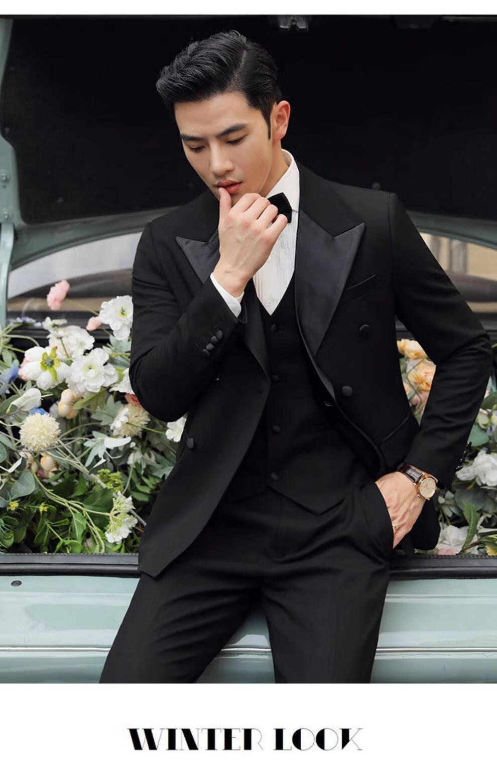 ROMON Tuxedo Dress Groom Wedding Suit Men's British Double-breasted Slim Suit Men's Three-piece Suit 2503 Double-breasted Black (Suit+Vest+Trousers XL