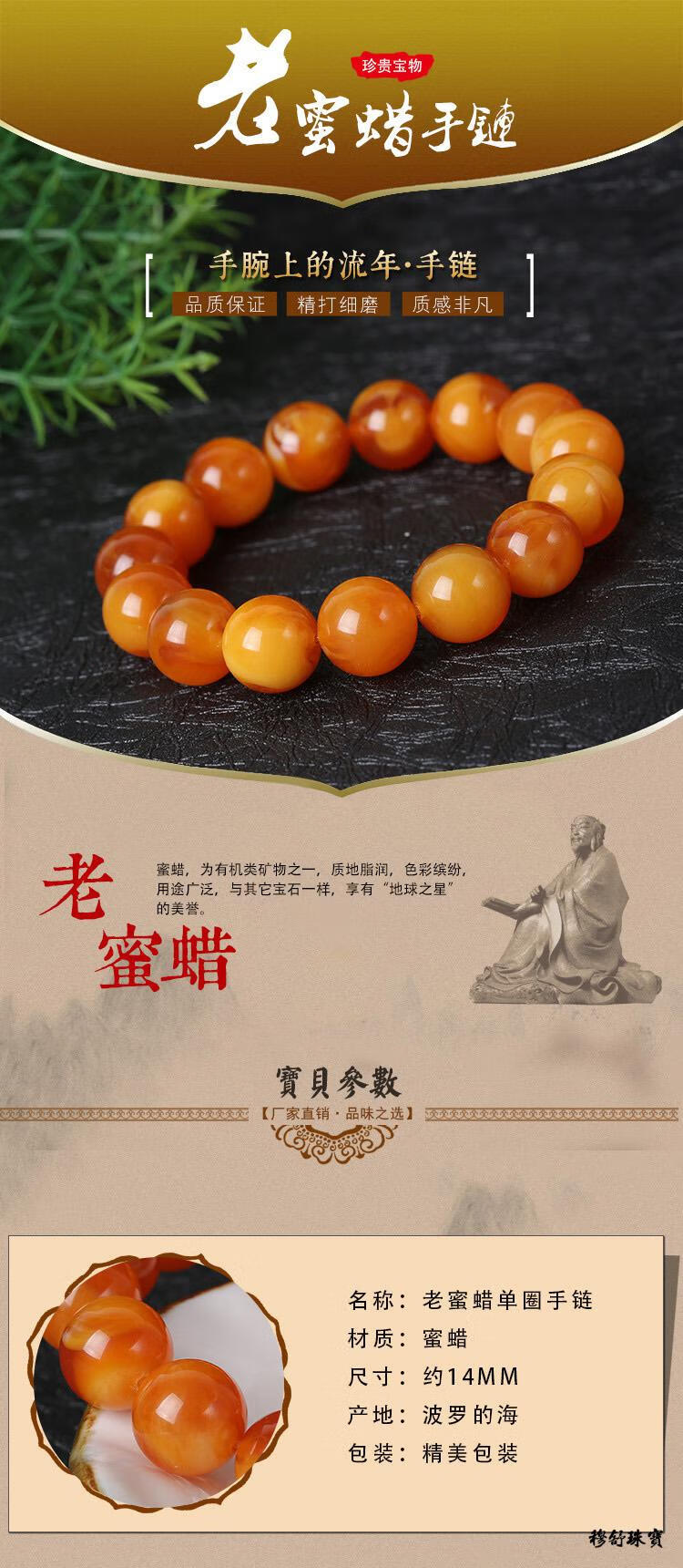 Mushu natural chicken fat yellow old beeswax amber round bead bracelet, unoptimized raw stone old beeswax bucket bead bracelet for men and women, collection grade 14mm (men and women)