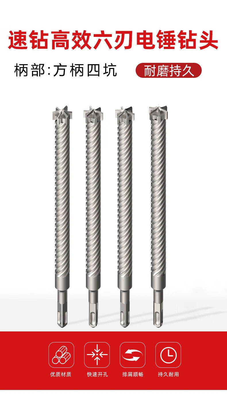 Yipeng six-edged electric hammer drill bit reinforced concrete stone through wall floor drilling six-edged impact drill square handle four pits square handle six-edged 19*250