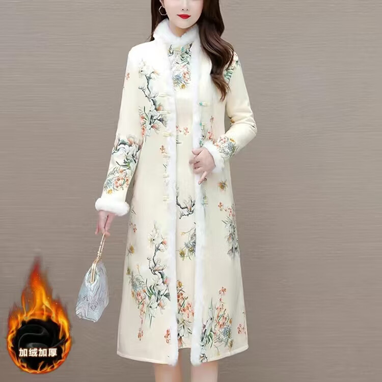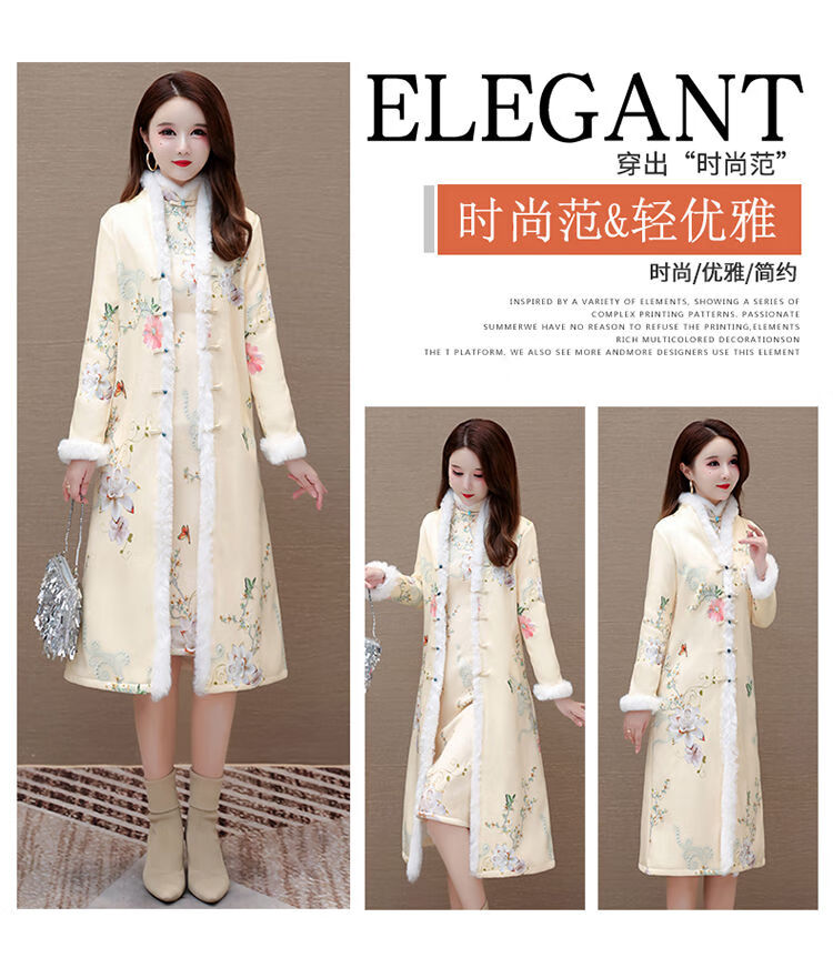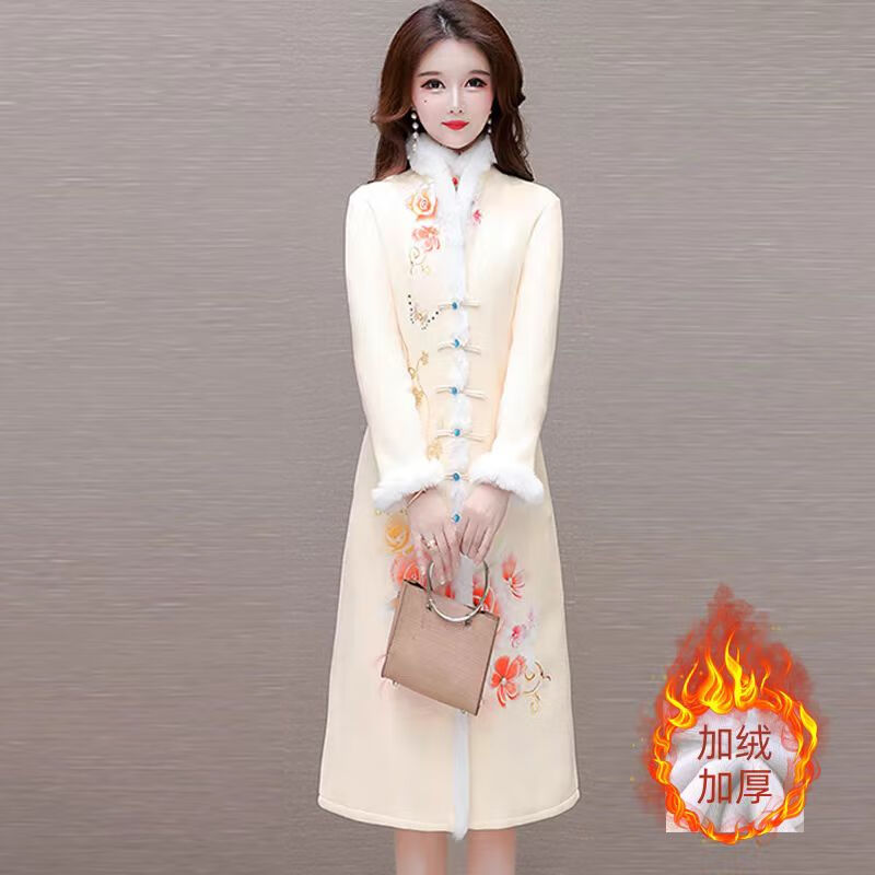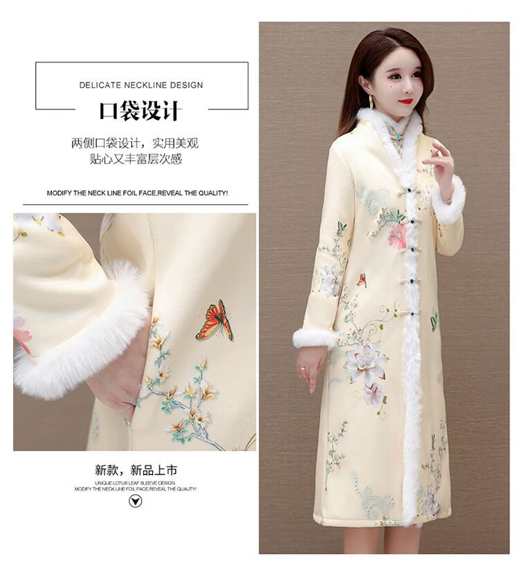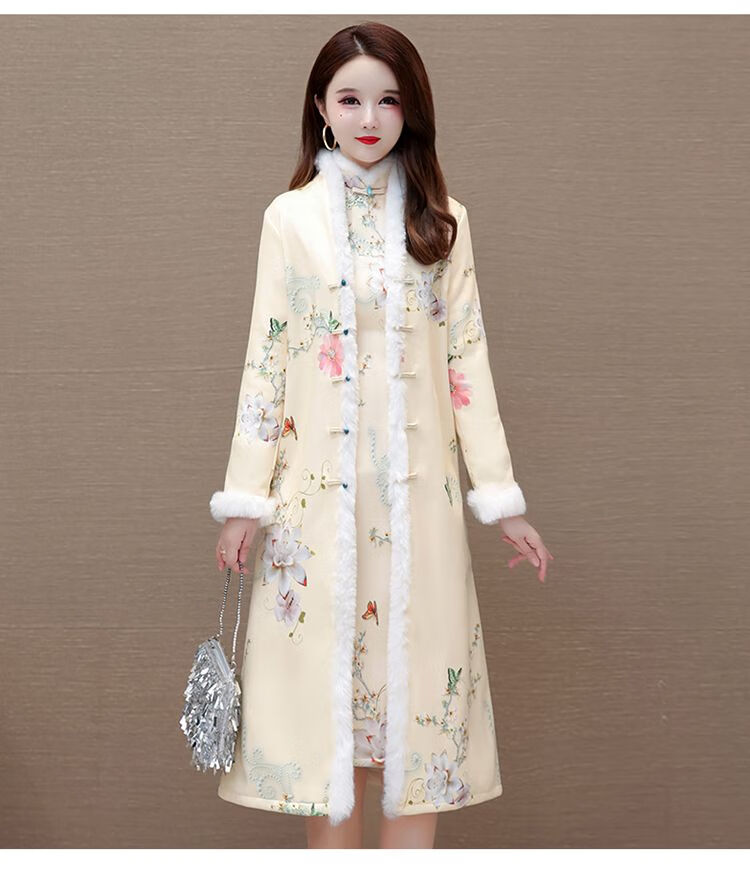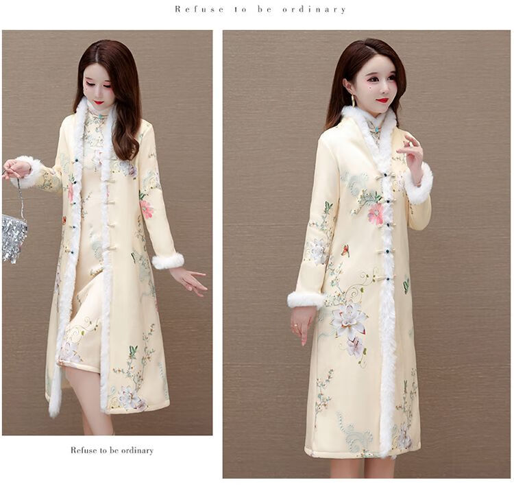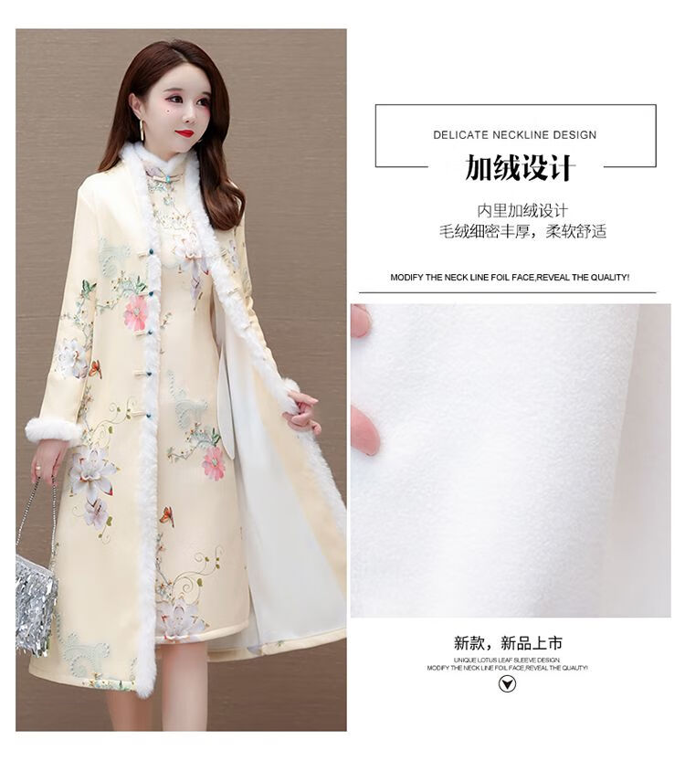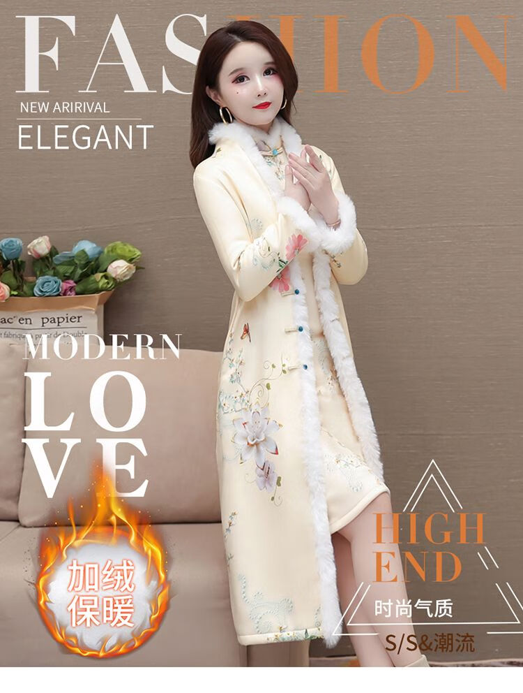 NUKM new Chinese style improved cheongsam plus velvet thickened long cotton coat for women winter new style Chinese style suit skirt 781 champagne two-piece set non-velvet cheongsam + jacket 2XL recommended 115-130Jin Jin equals 0.5 kg