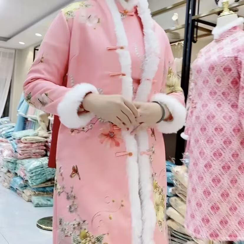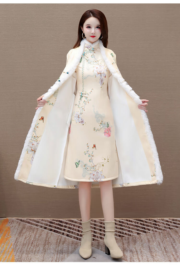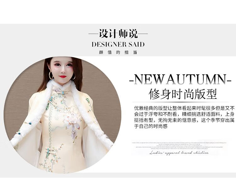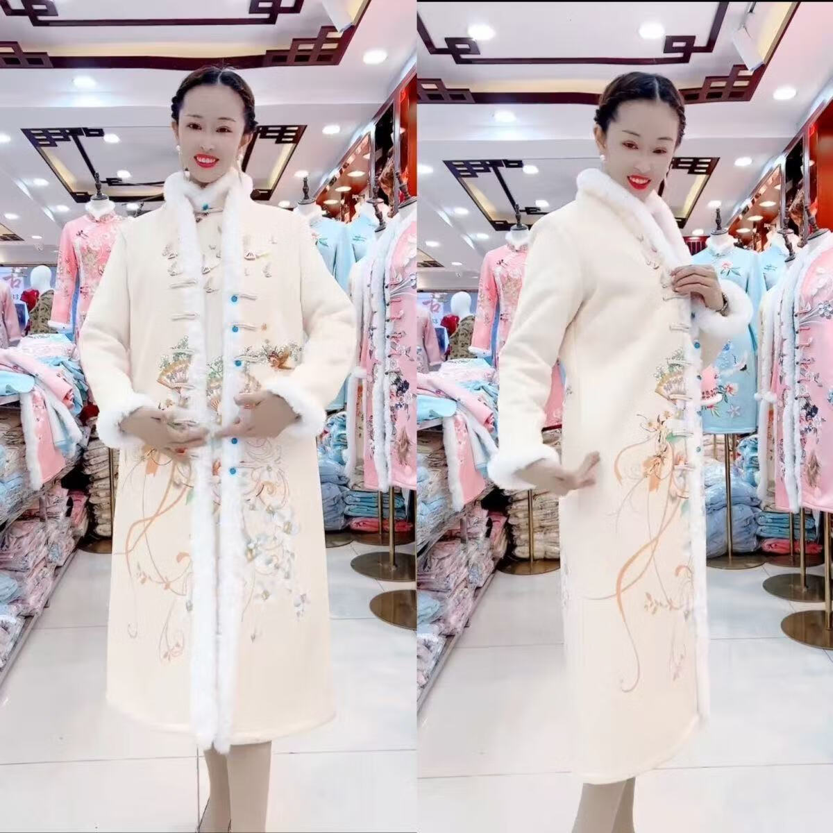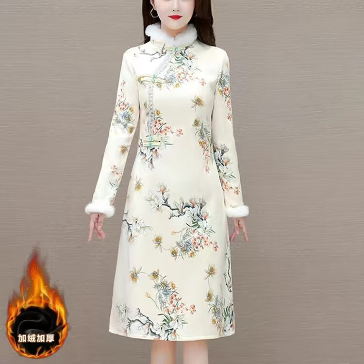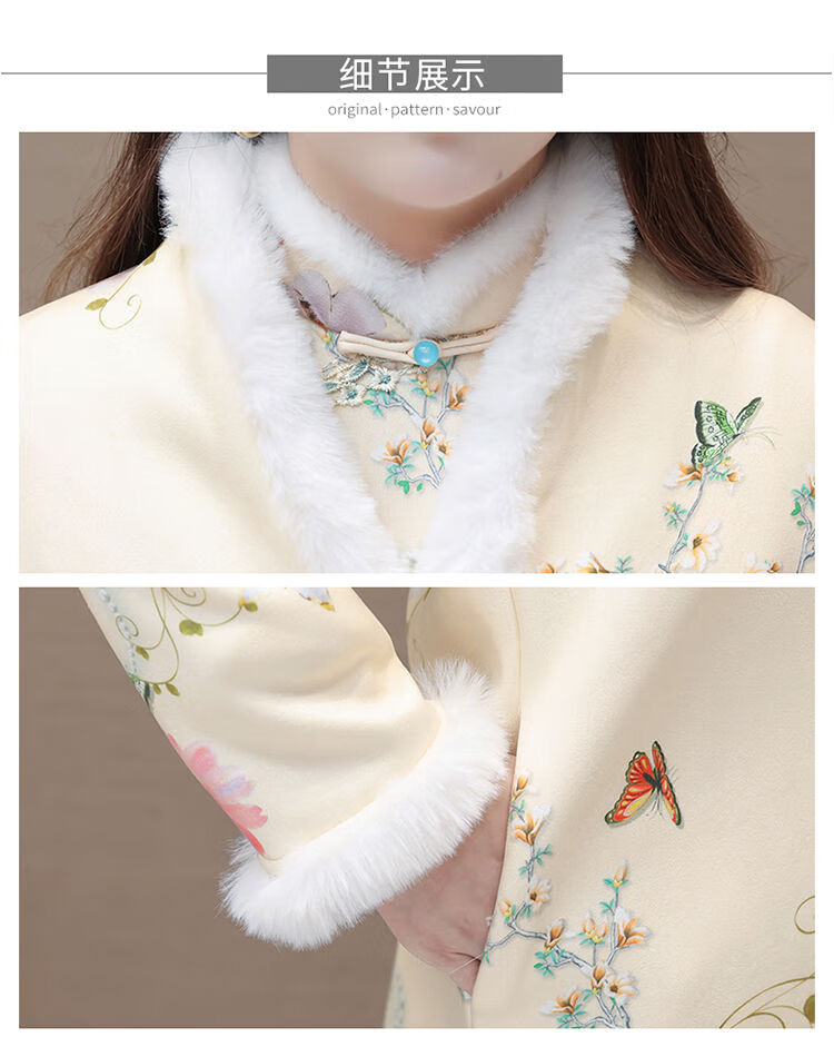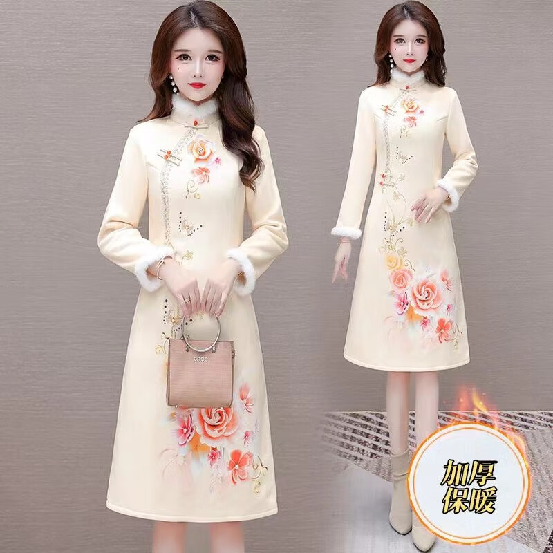 NUKM new Chinese style improved cheongsam plus velvet thickened long cotton coat for women winter new style Chinese style suit skirt 781 champagne two-piece set non-velvet cheongsam + jacket 2XL recommended 115-130Jin Jin equals 0.5 kg