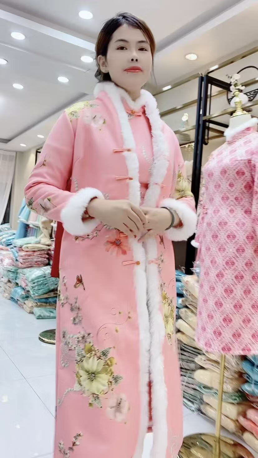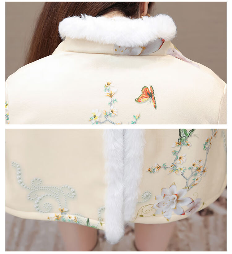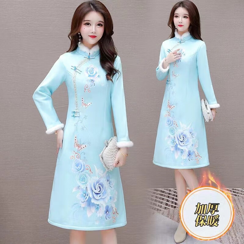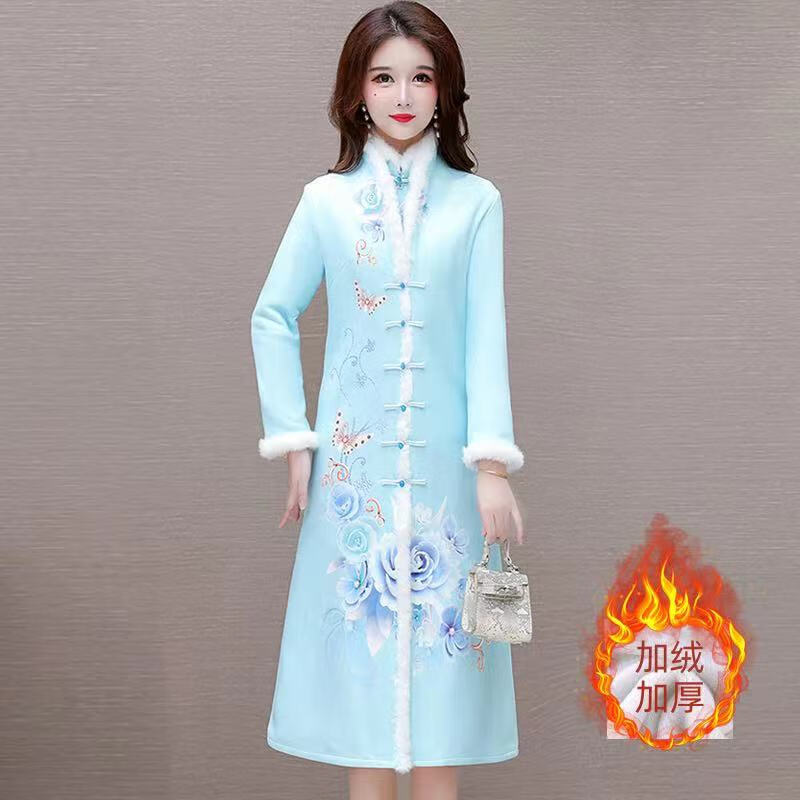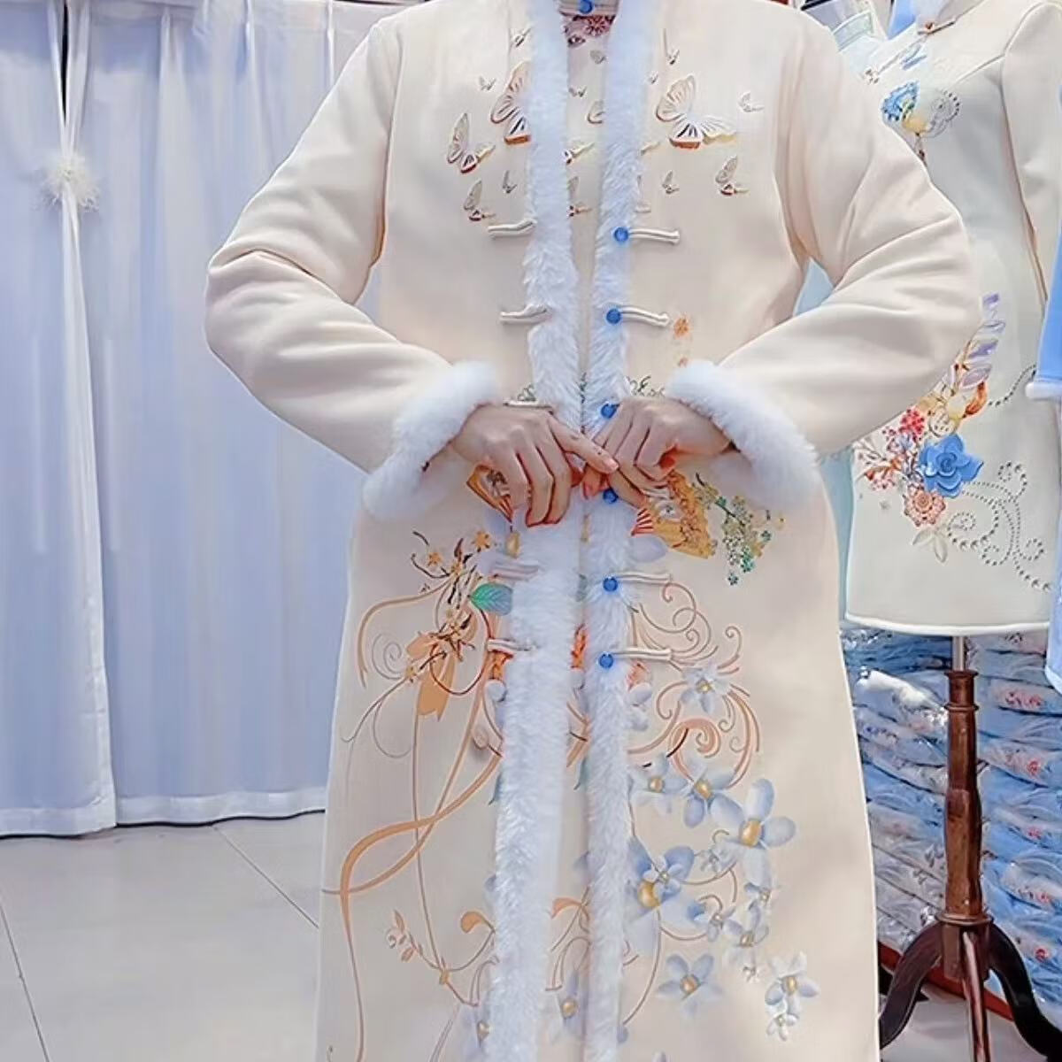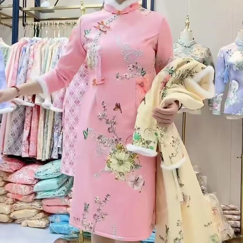 NUKM new Chinese style improved cheongsam plus velvet thickened long cotton coat for women winter new style Chinese style suit skirt 781 champagne two-piece set non-velvet cheongsam + jacket 2XL recommended 115-130Jin Jin equals 0.5 kg