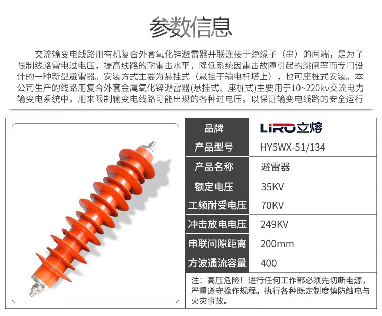 35KV line zinc oxide arrester HY5WX-51/134 composite jacket suspended HY5WZ power station type HY5WZ-51/134 round base