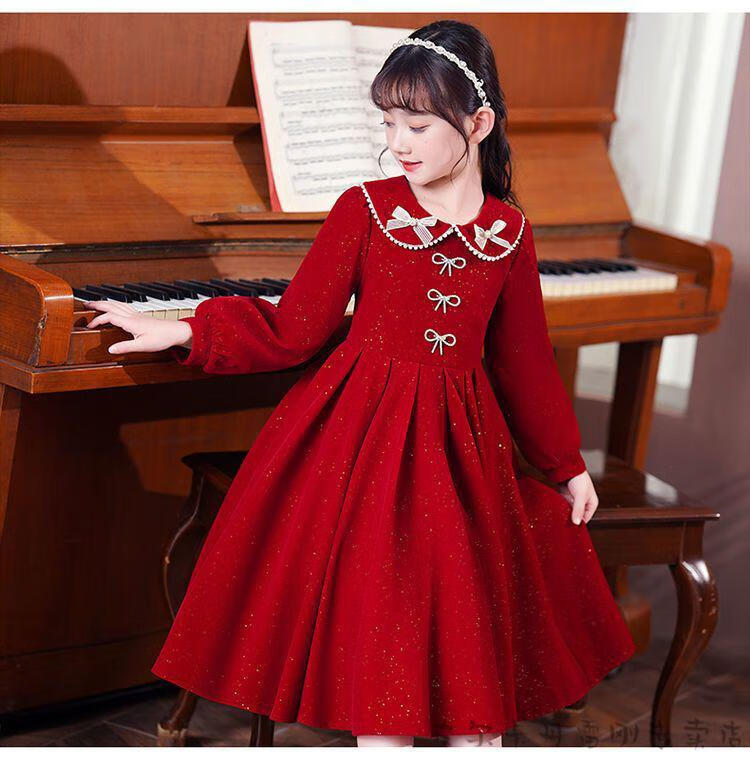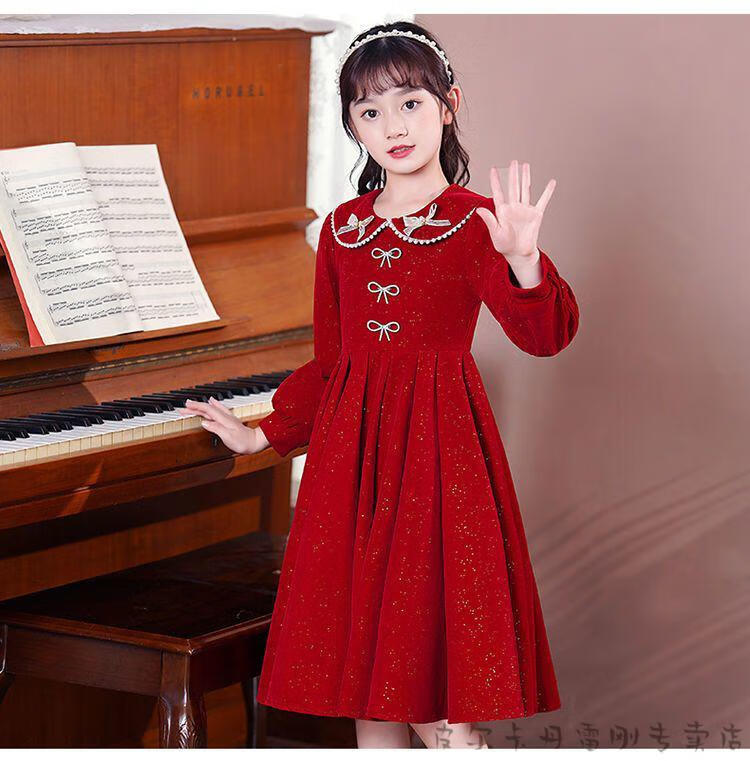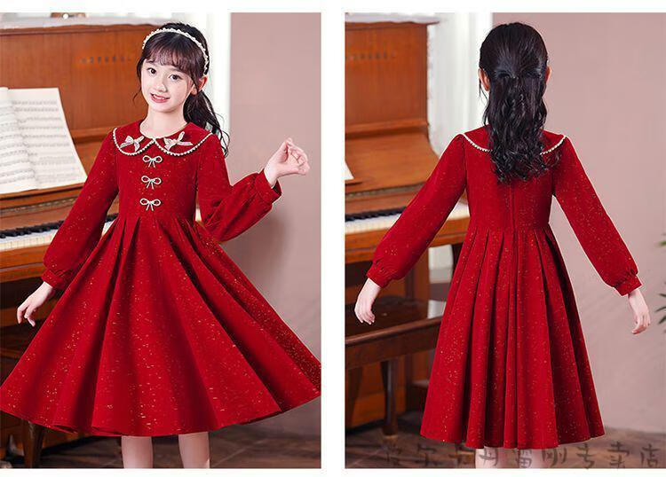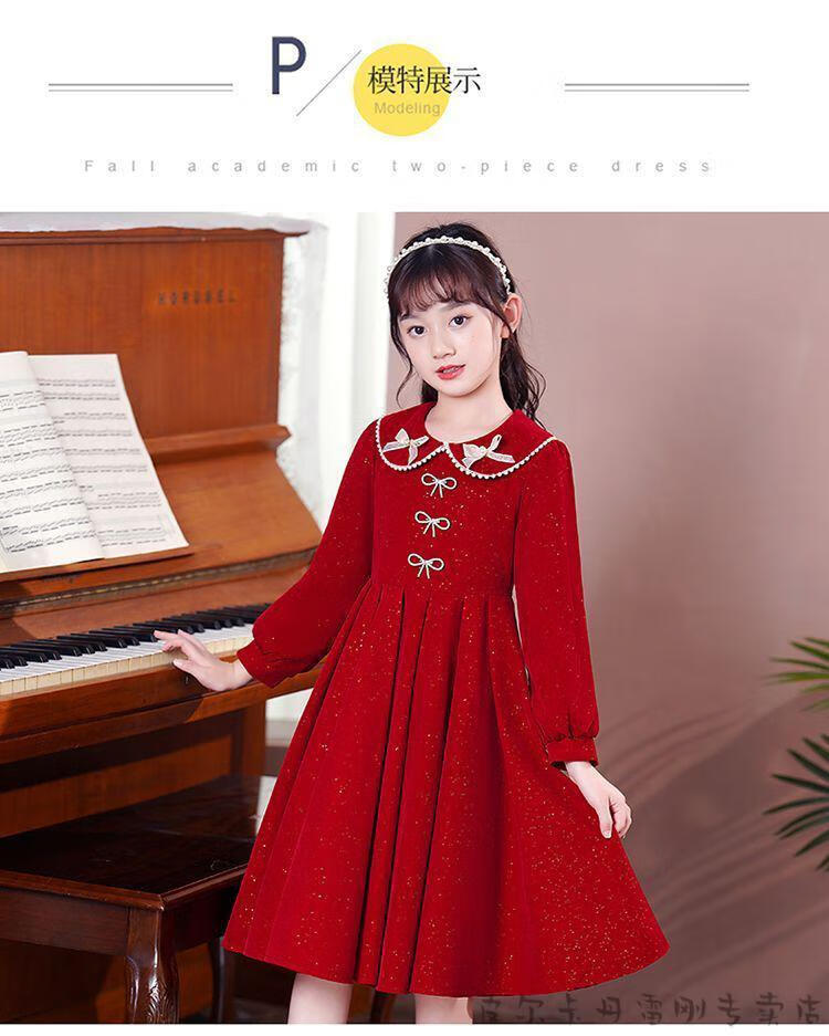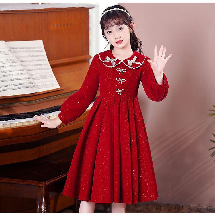 Pierre Cardin girls' dress autumn and winter 3~14 years old girls fashionable red princess dress autumn velvet children's dress red L1051# 160