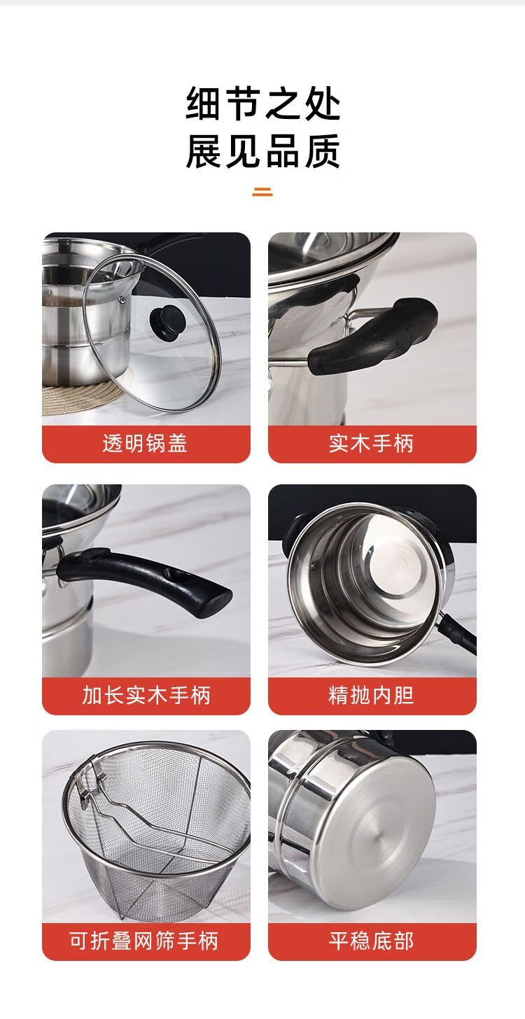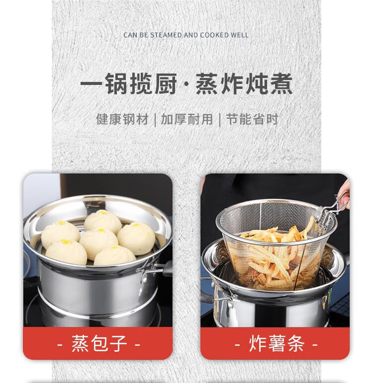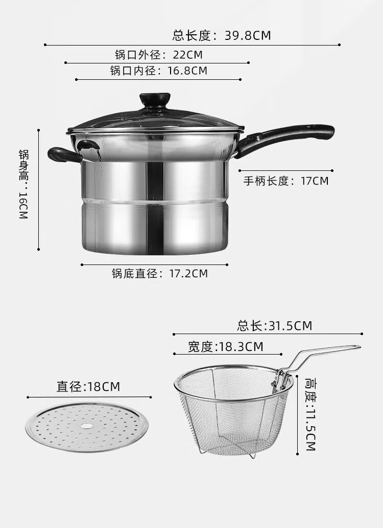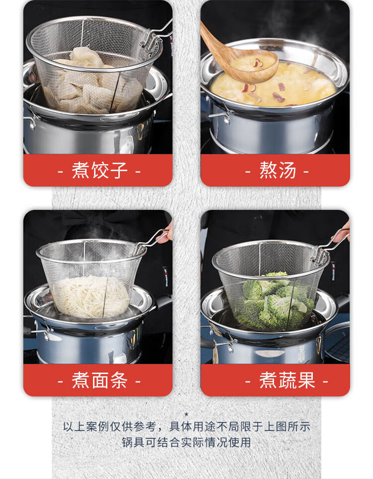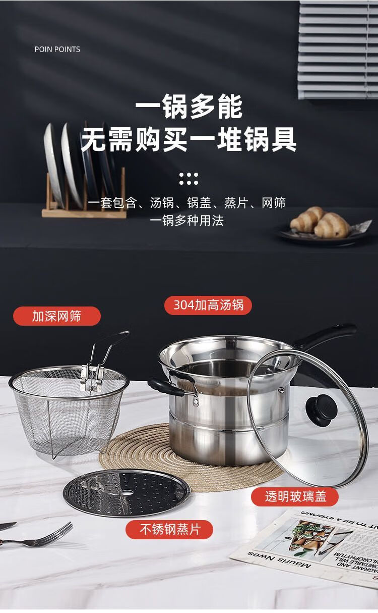 CLCEY304 stainless steel multifunctional noodle pot, milk pot, small frying pot, soup pot, steamer, household cooking pot, induction cooker, universal pot, 22cm 304 antibacterial steel, four-piece set with double bottom