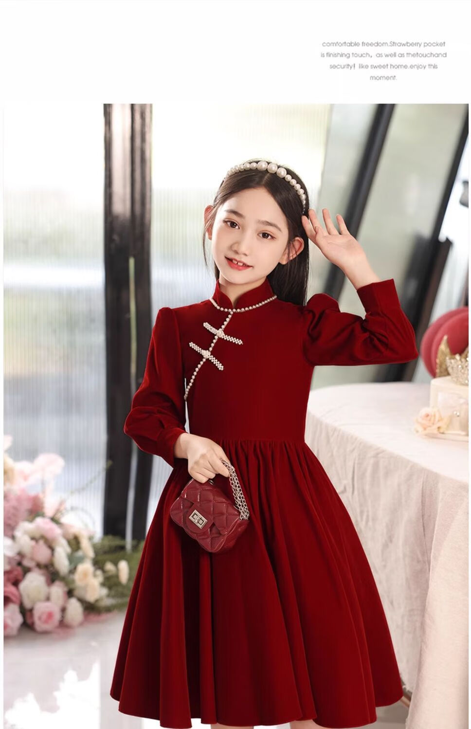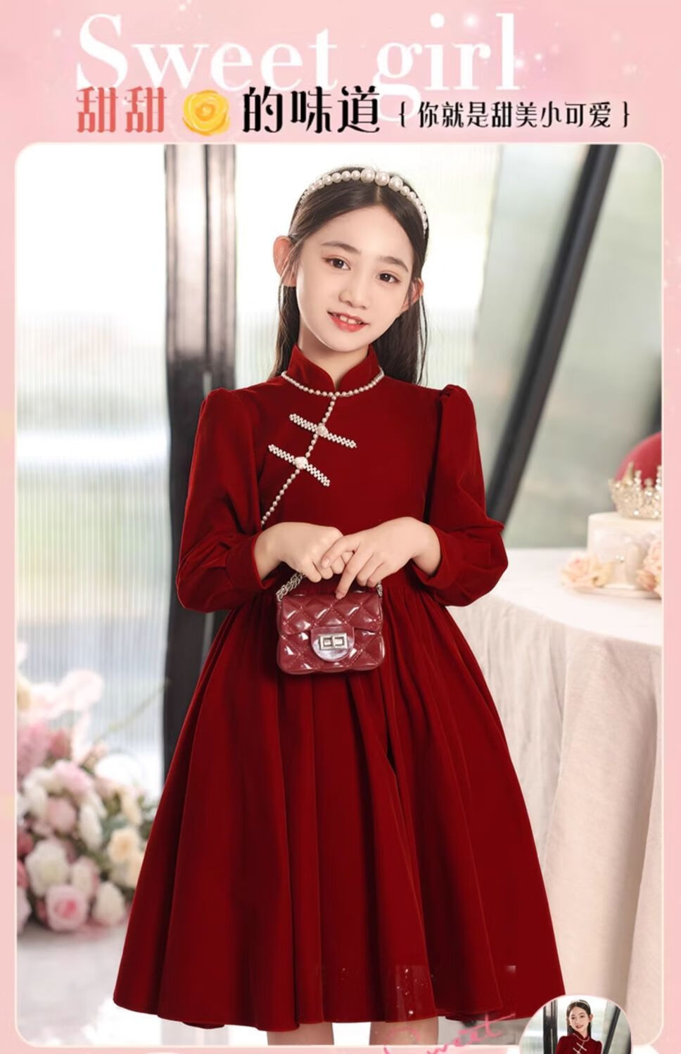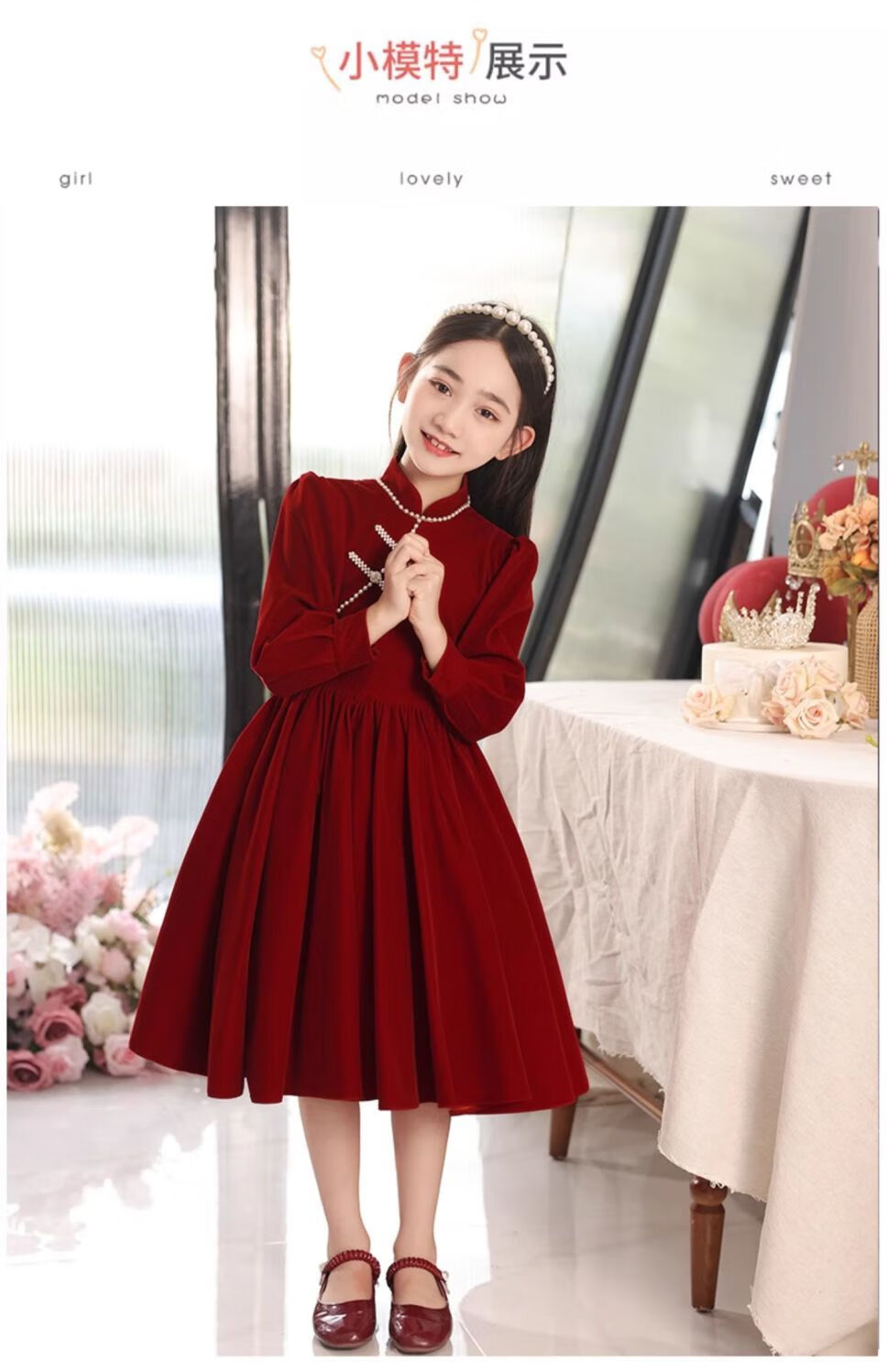 Girls' winter dress, new Chinese style dress, velvet children's skirt, red New Year's greeting dress, girl princess dress, red velvet style, velvet lining 150