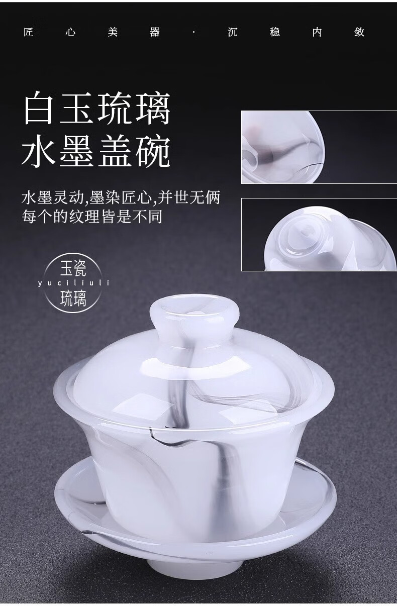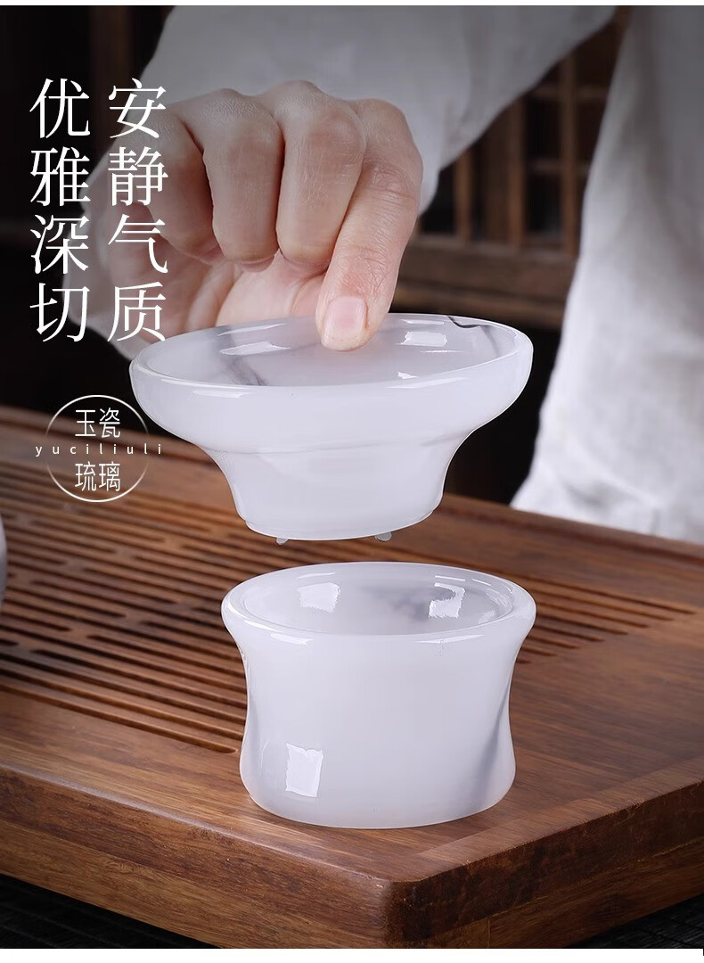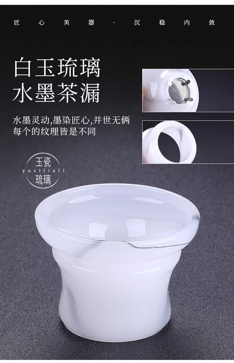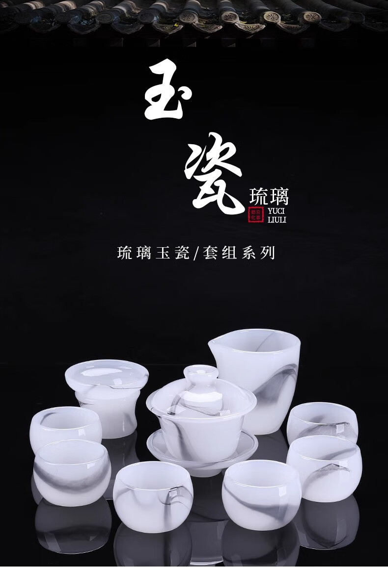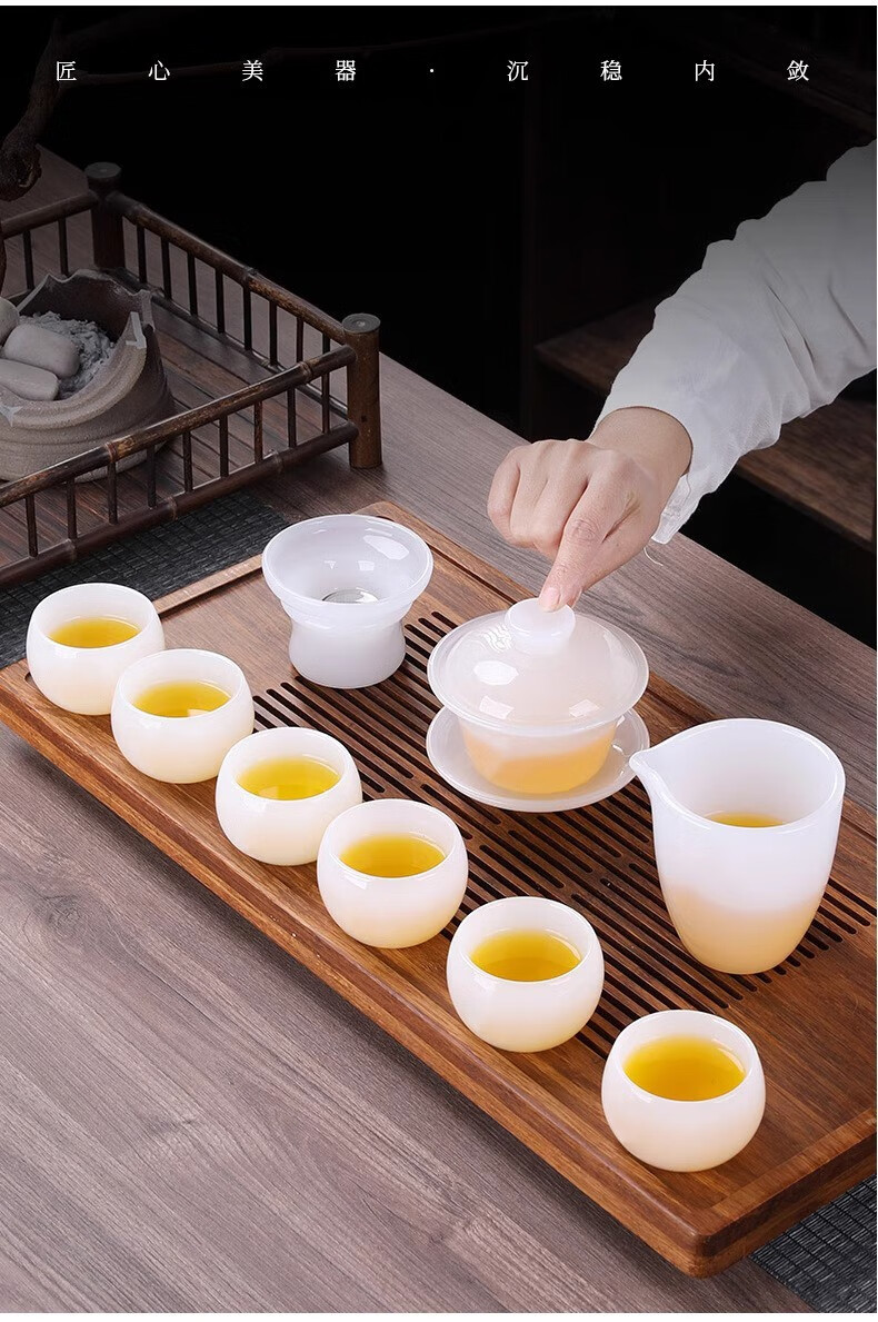 Glaze tea set combination, white jade tea cup, home gift, jade porcelain kung fu tureen teapot, complete gift box gift, pure white glazed jade porcelain set, safe packaging, 1 tureen + 1 fair + 1 tea drain set + 6 tea cups