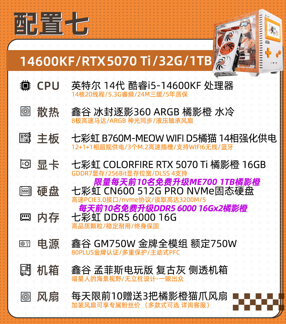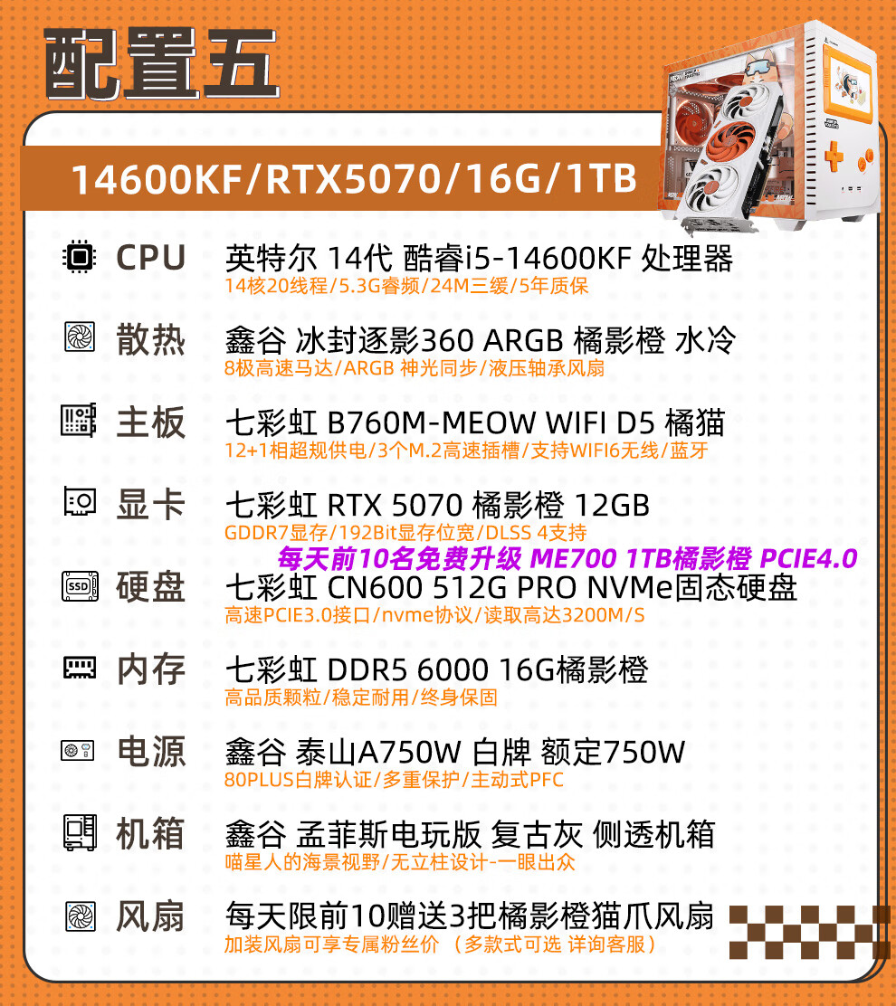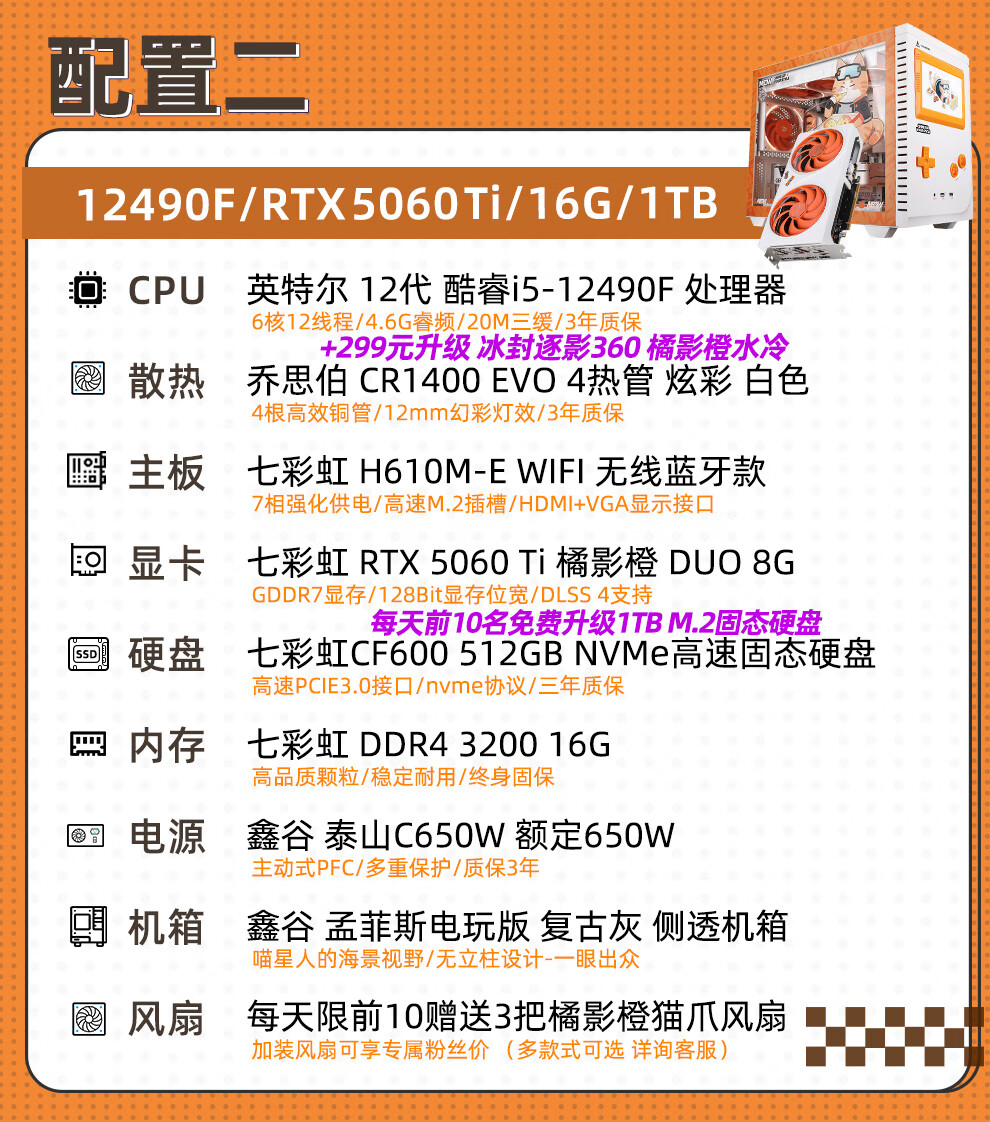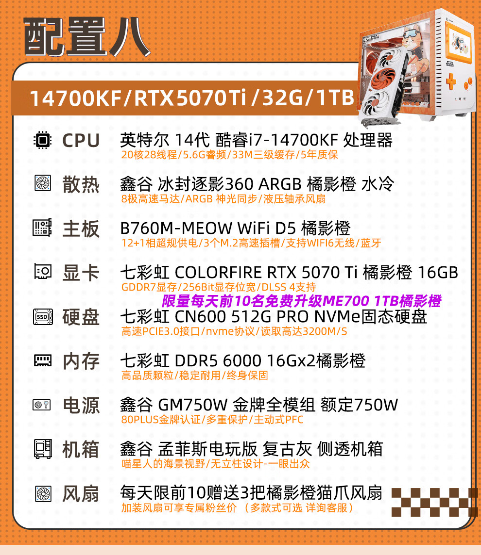 Colorful i5 14600KF/RTX 5060TI/5070TI 5080 graphics card Orange Shadow Orange Orange Cat customized game live broadcast design computer host desktop assembly machine with two 12490F丨16G丨1TB丨5060TI