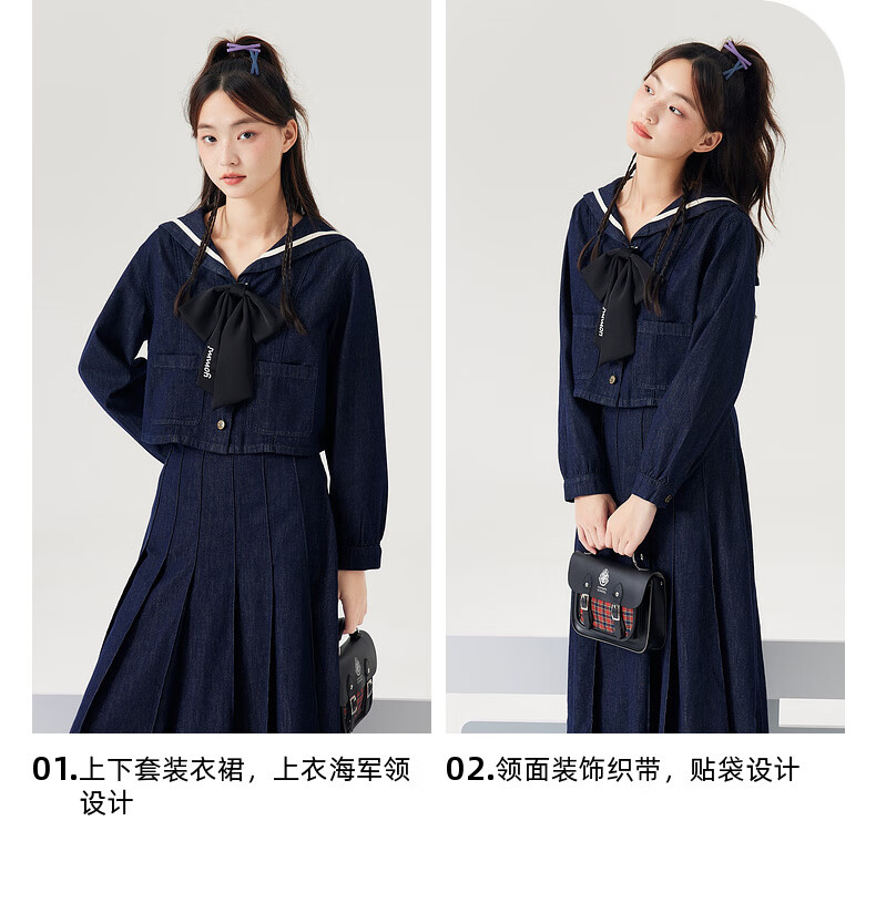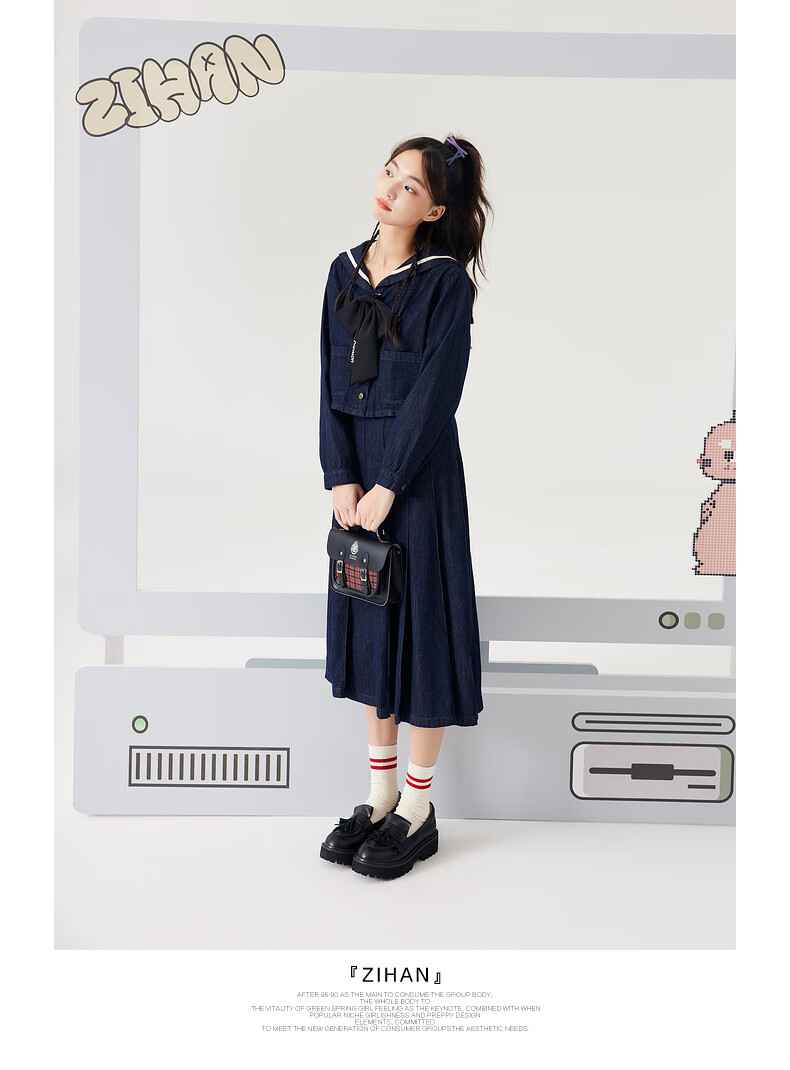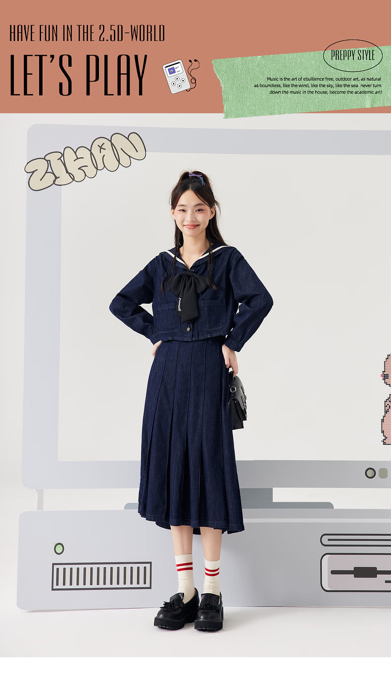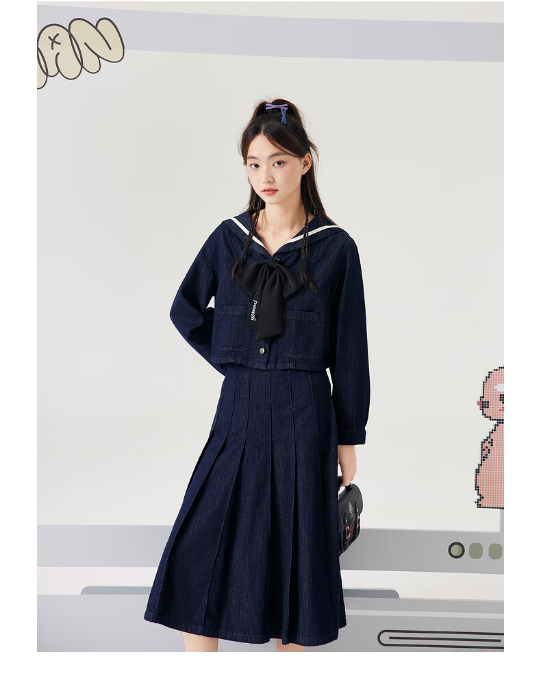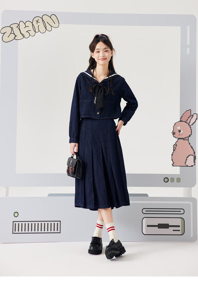 Zihan (ZIHAN) Zihan navy collar top + pleated high waist mid-length skirt for women spring college style fashion suit denim blue S