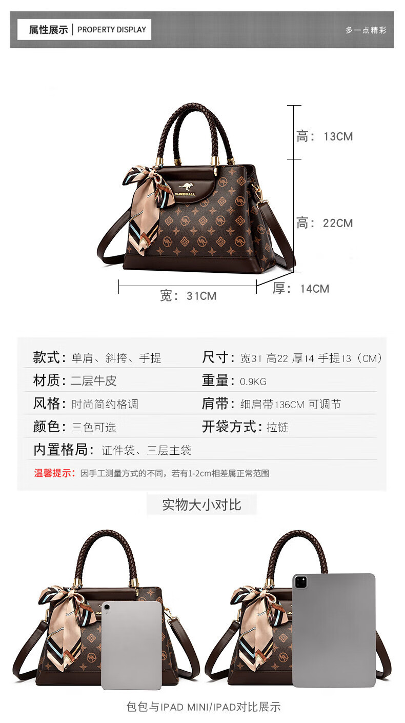 Kangaroo Kara brand genuine leather bag for women 2025 new style stylish handbag for mother on Mother's Day, fashionable middle-aged crossbody bag, brown (gift box + hand bag, card bag and silk scarf)