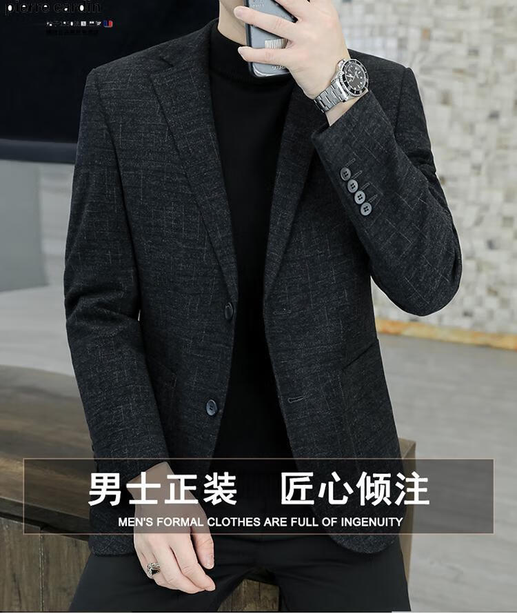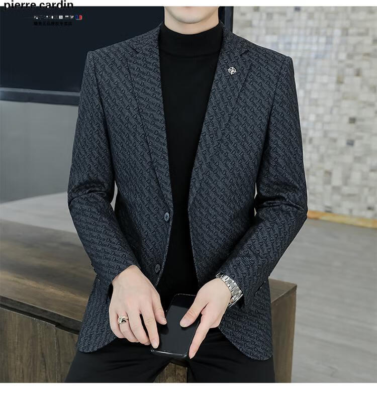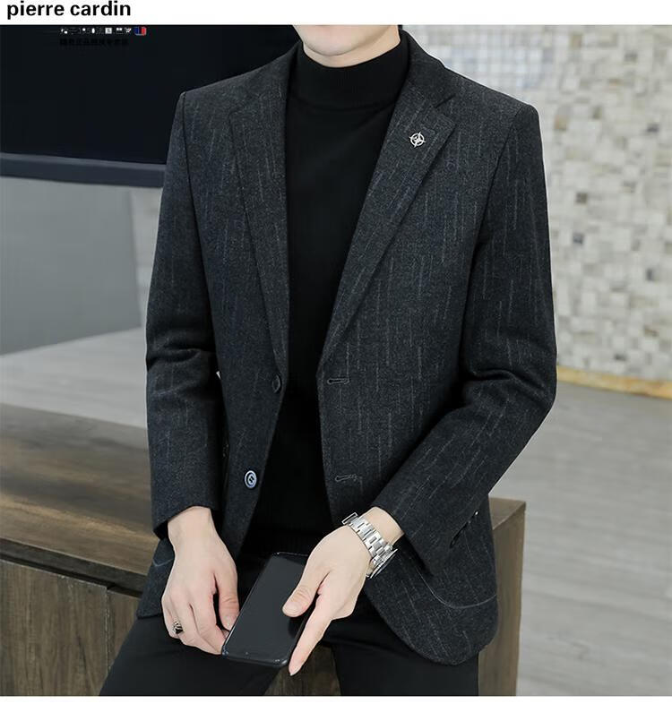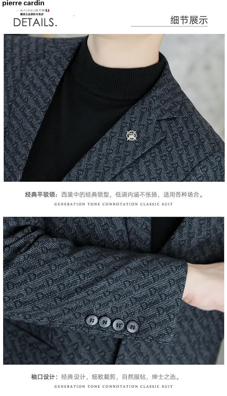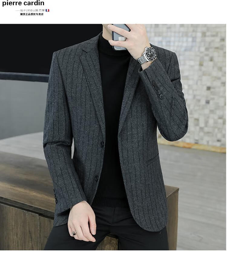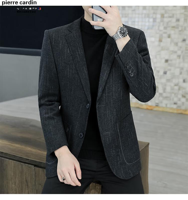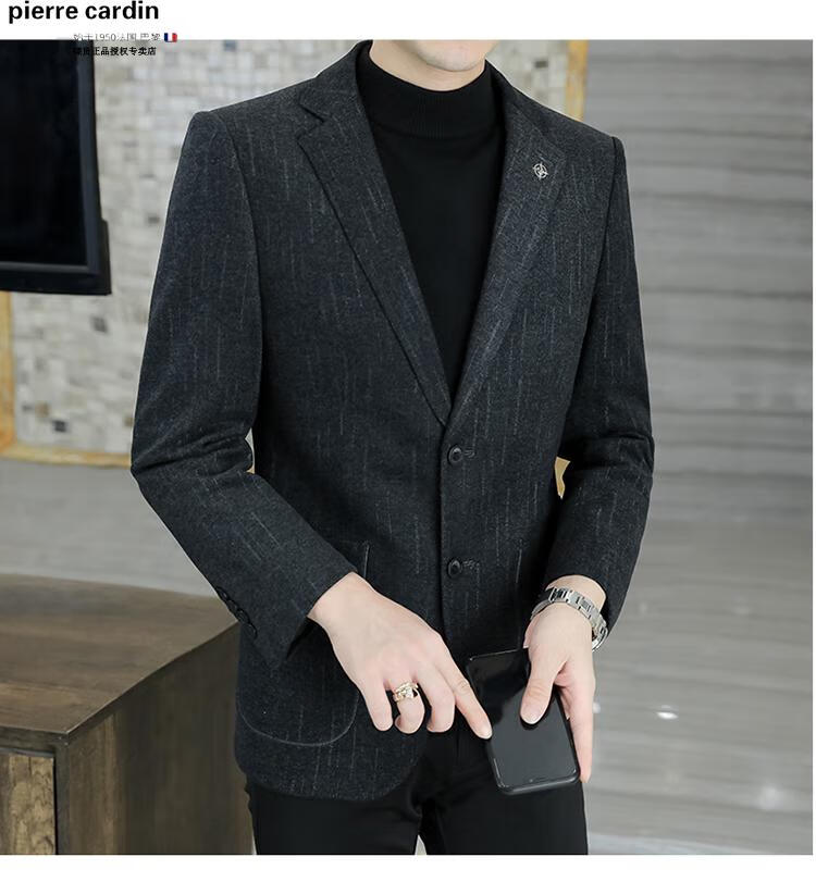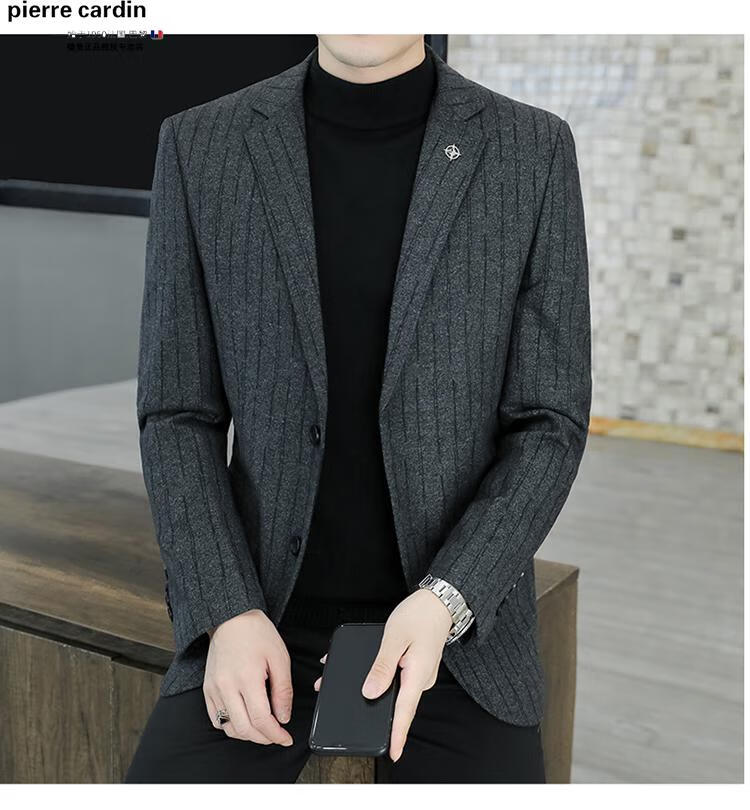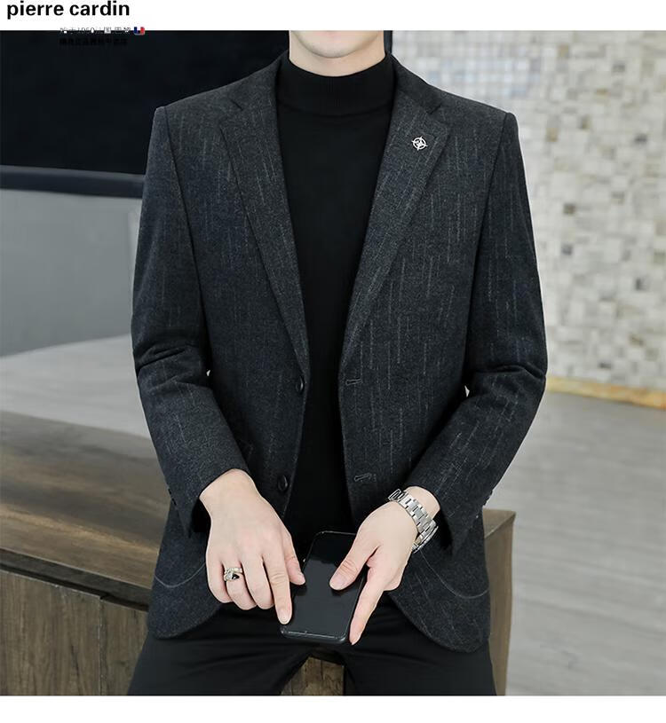 Pierre Cardin small blazer men's business casual tops high-end brand woolen striped suit commuting drape single suit black dark pattern 6001-1 2XL 185 recommended 150-165Jin Jin equals 0.5 kg