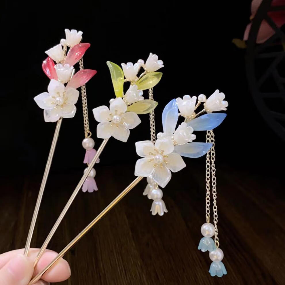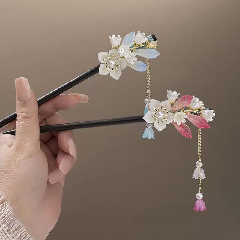 Clan ancient bell orchid tassel hairpin for women summer cheongsam and Hanfu hairpin new Chinese style step rocking hairpin headdress winding wooden hairpin blue 5004 B01-101