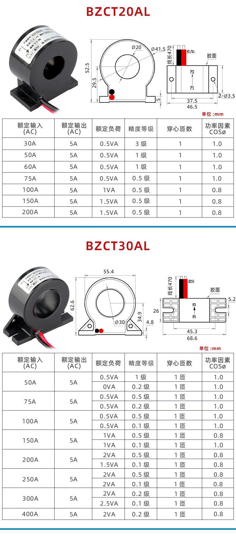 Current transformer through-core high-precision 0.2S level 0.1 level AC three-phase electricity meter 20a/30A/50A/5A BZCT20AL 20A/5A