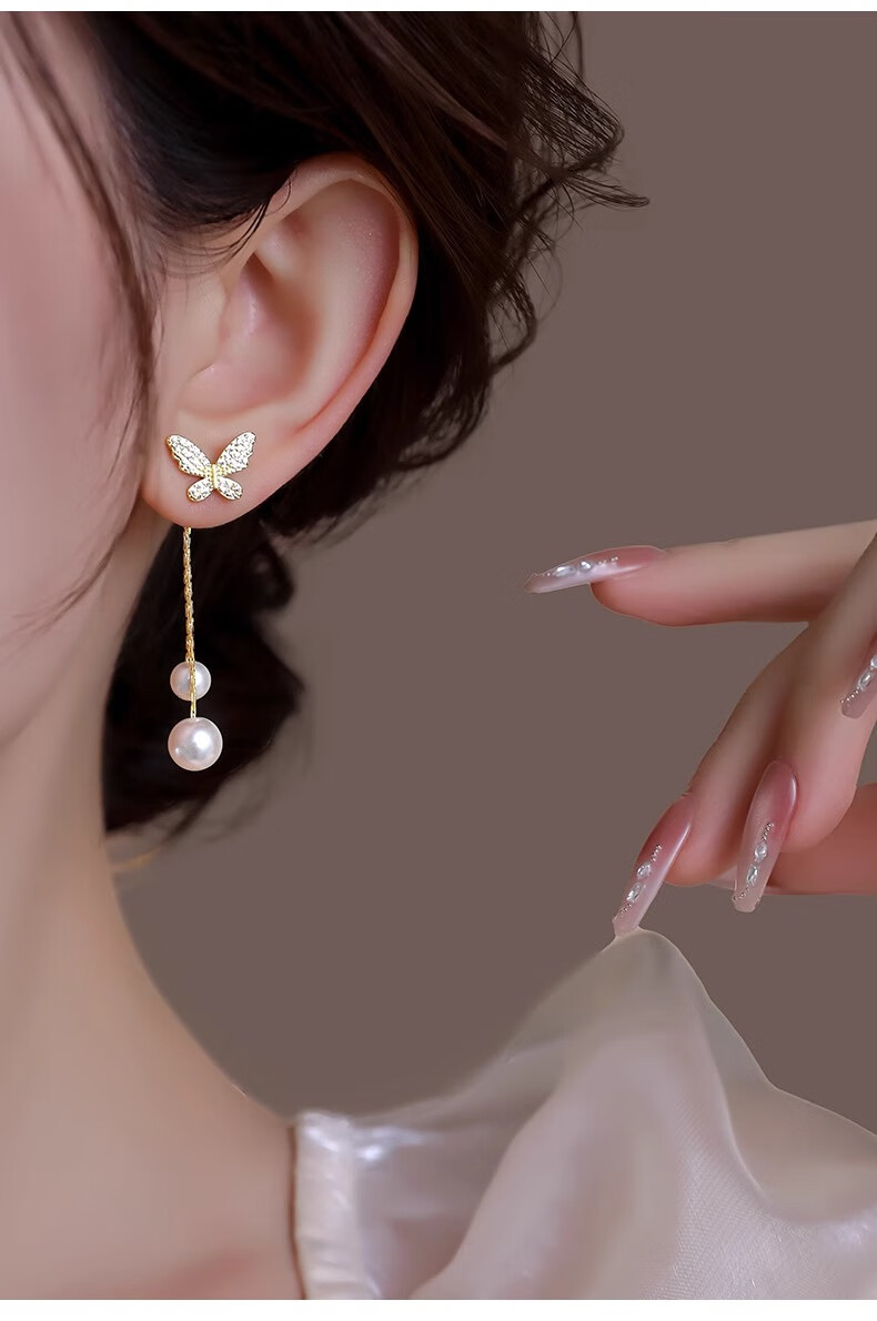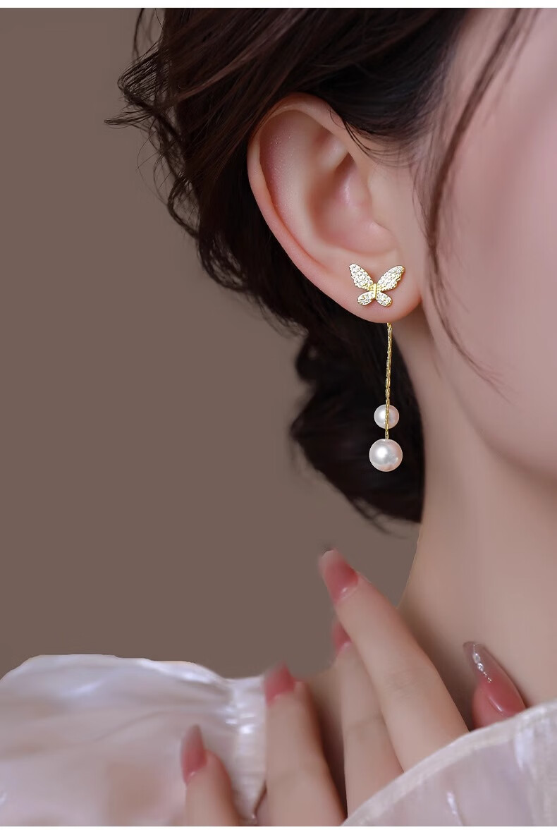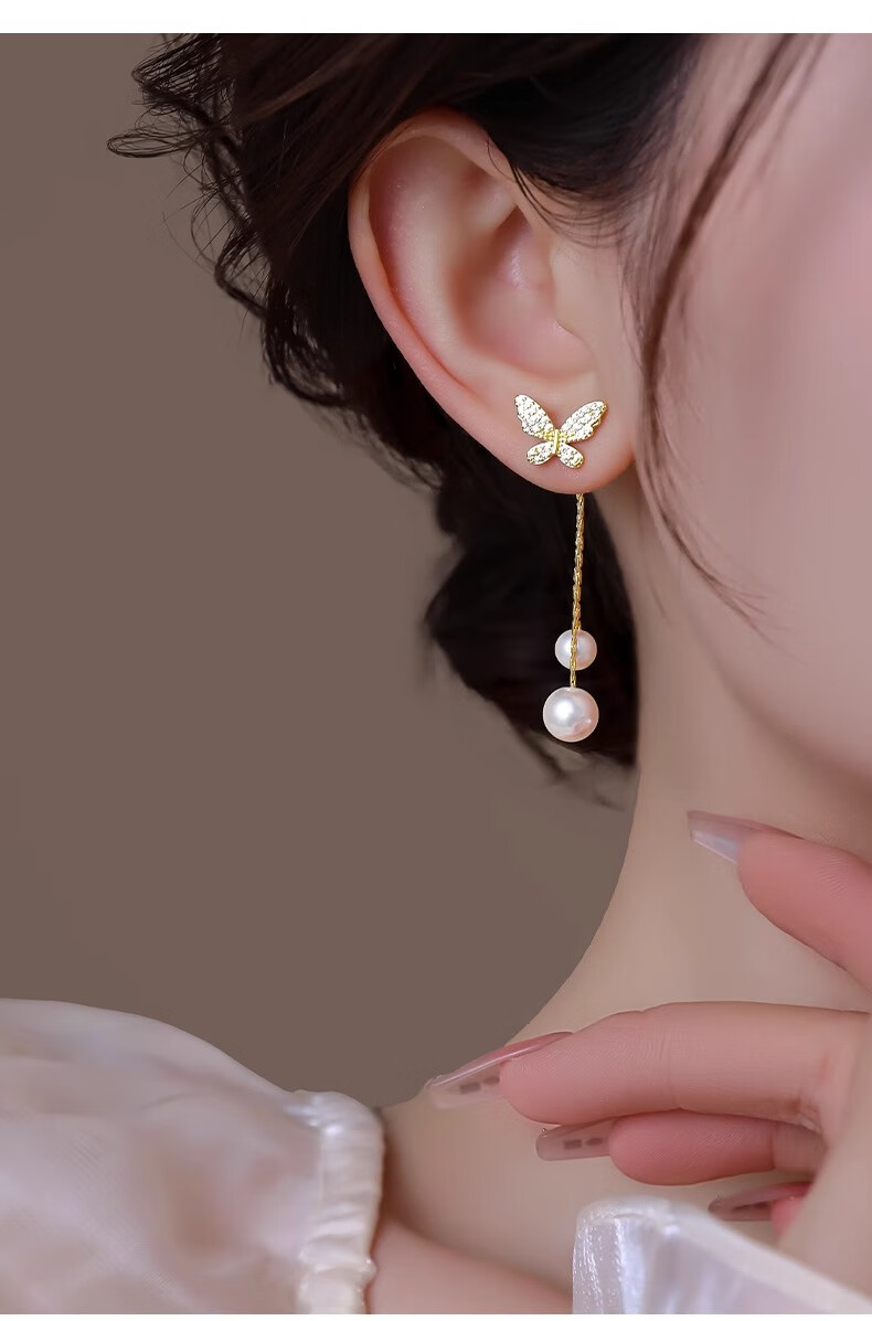 Mondele brand earrings S925 silver needle material butterfly pearl women's 2025 new light luxury and high-end temperament earrings golden butterfly pearl earrings