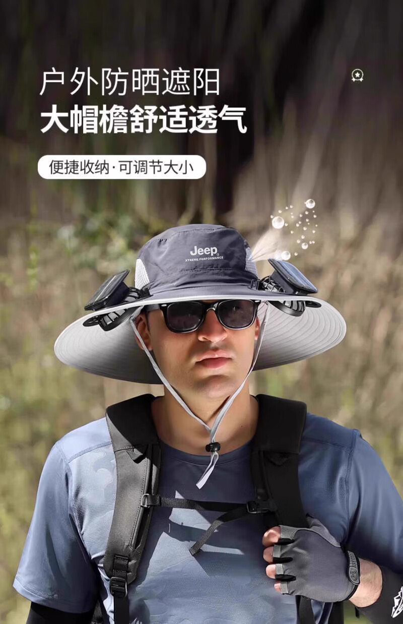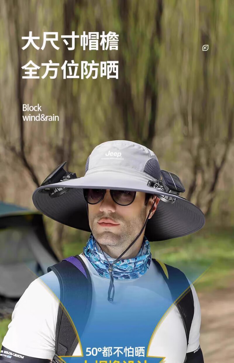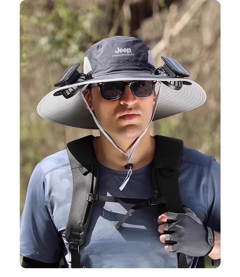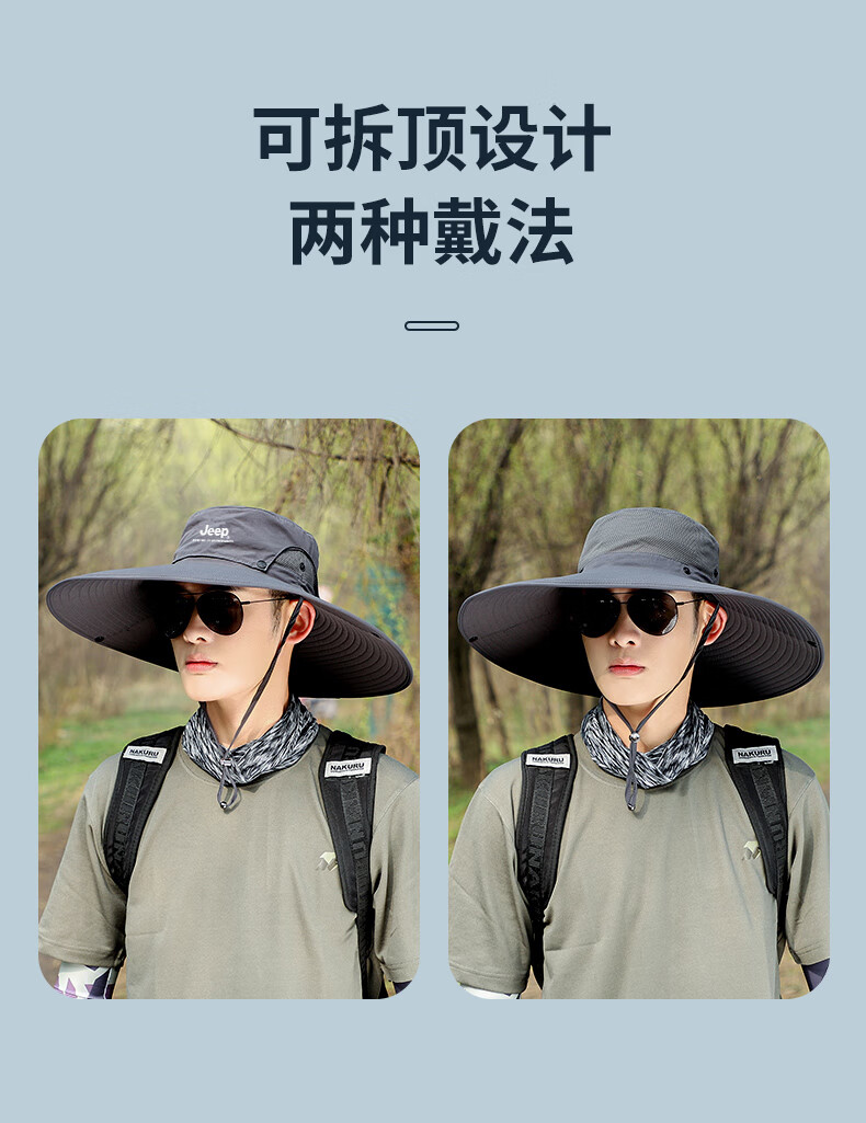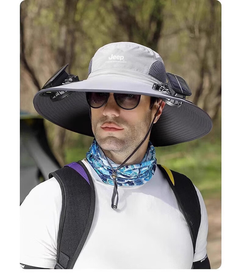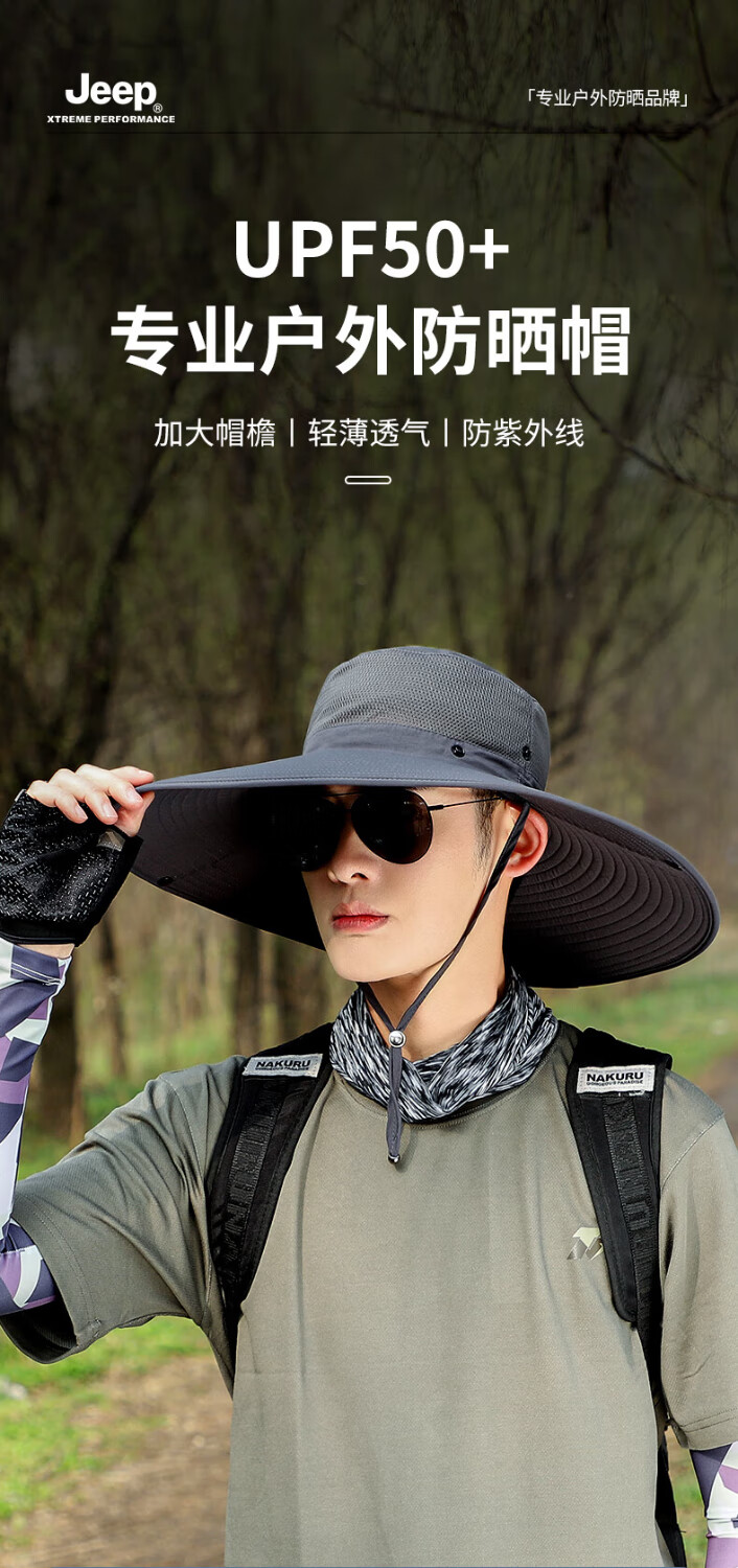 JEEP Jeep sun hat men's summer fishing hat outdoor mountaineering sunshade anti-UV men's large brim fisherman hat light gray