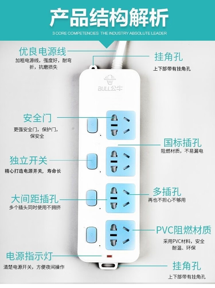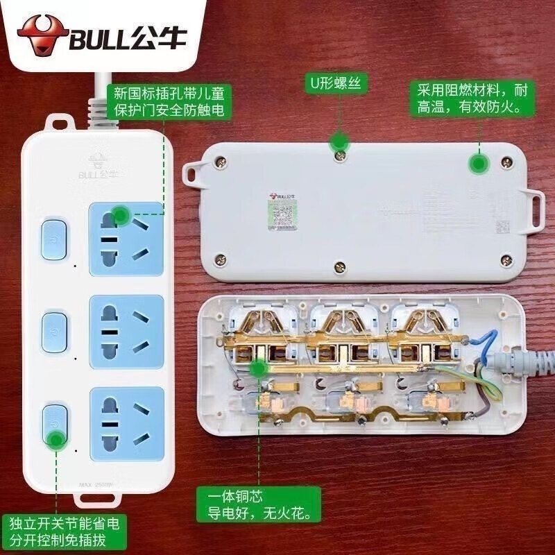 Bull (BULL) household socket long-line plug-in strip with wire terminal board plug-in board dormitory drag line board Bull B09-two-position plug, full length 3 meters thick line