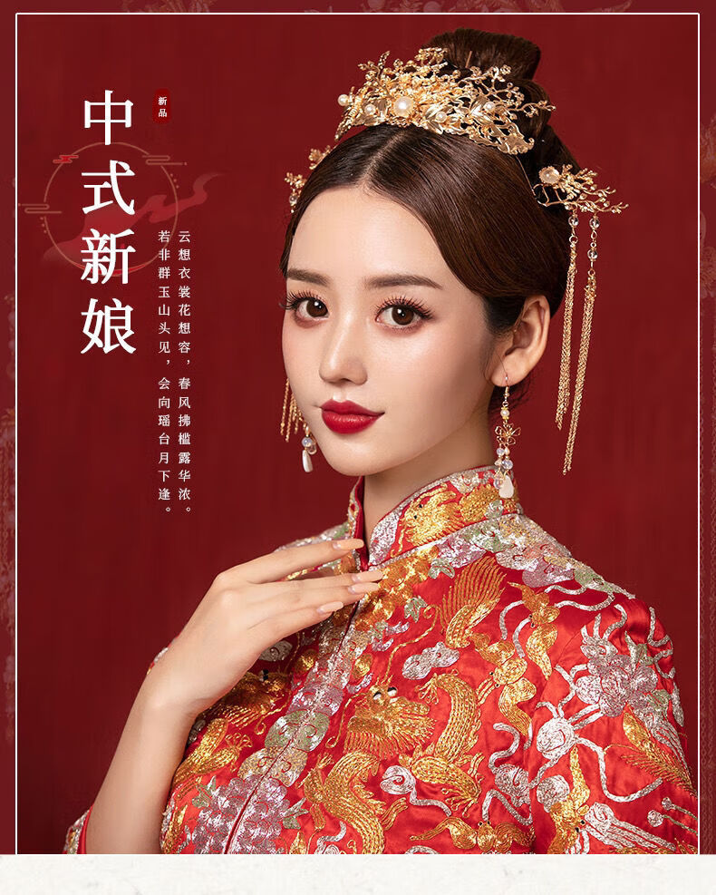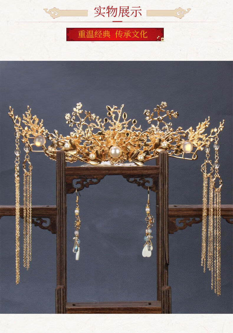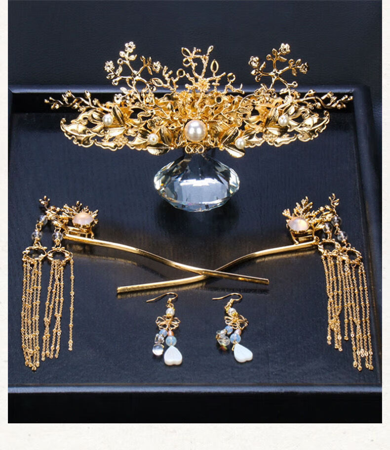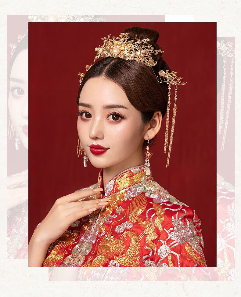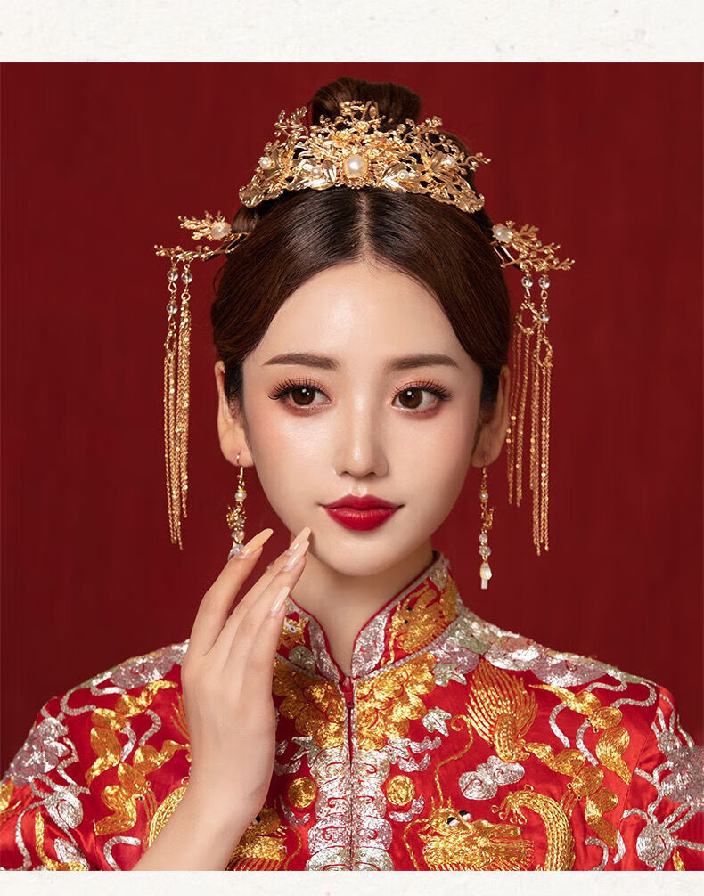 Ancient bridal Xiuhe headdress, golden phoenix crown, Chinese style wedding costume, tassel hair accessories, showy face, small Xiuhe clothing accessories, elegant romantic Xiuhe clothing and hair accessories set, ear clip style