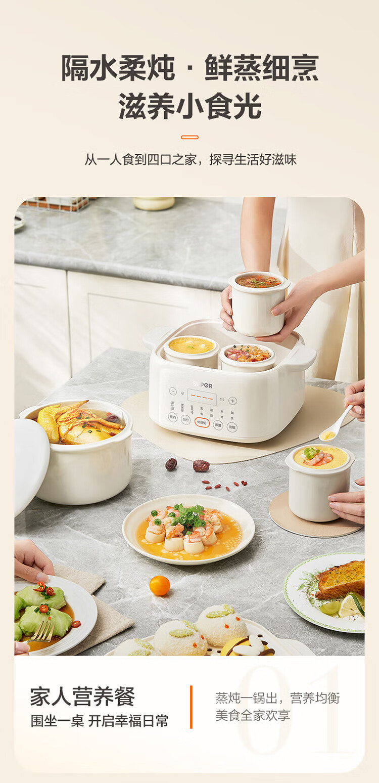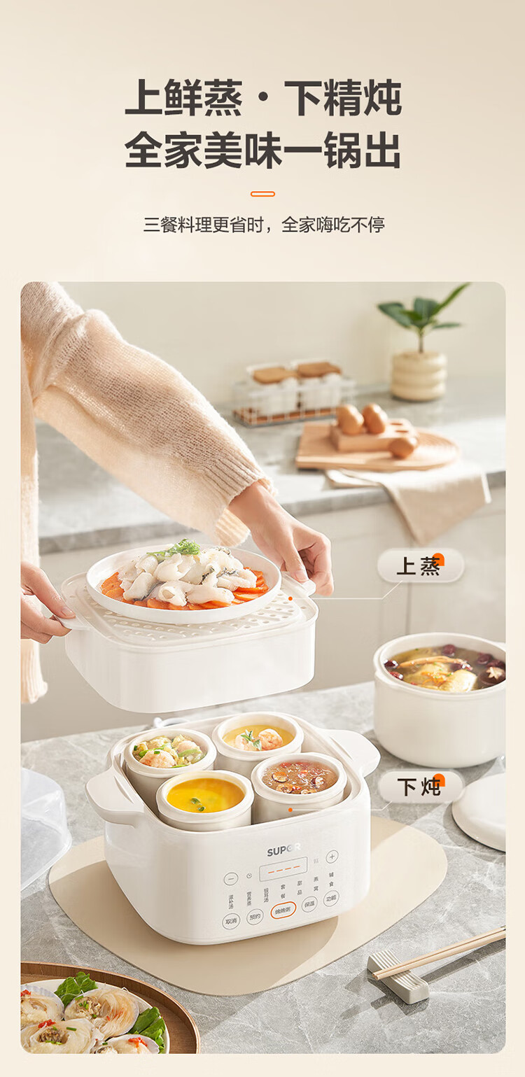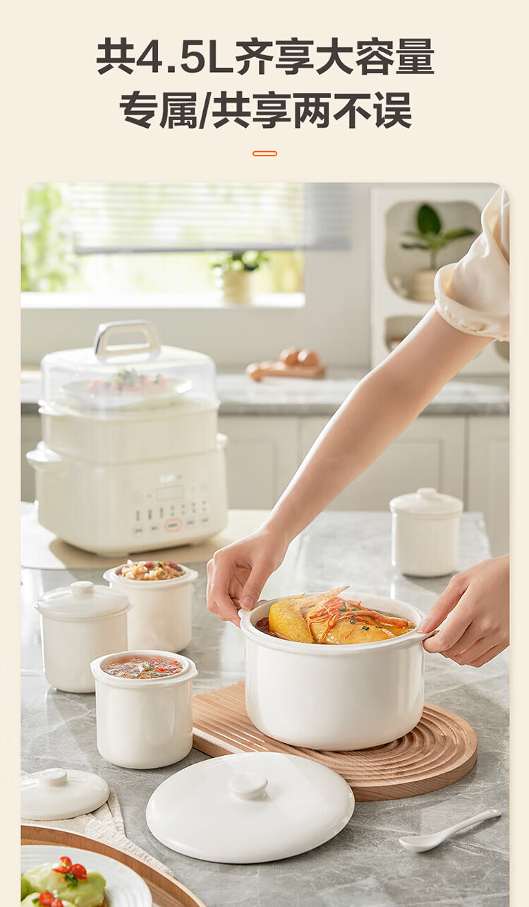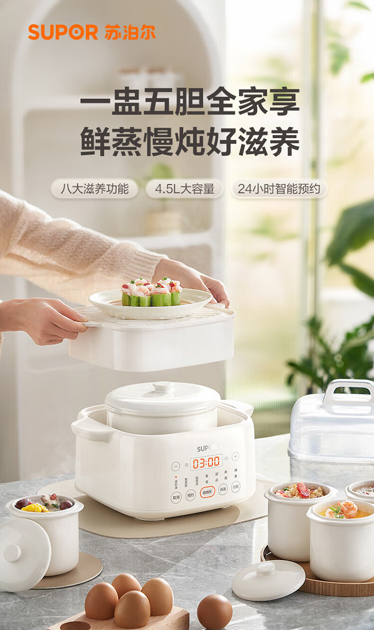 Supor electric stew pot, bird's nest stew pot, water-proof stew pot, household use for 3-4 people, stewed fish maw soup pot, white porcelain, 5 inner pots, stewing and steaming, multifunctional baby food supplement pot, porridge artifact, five pots in one pot + 24h smart appointment, 4.5L high quality white porcelain
