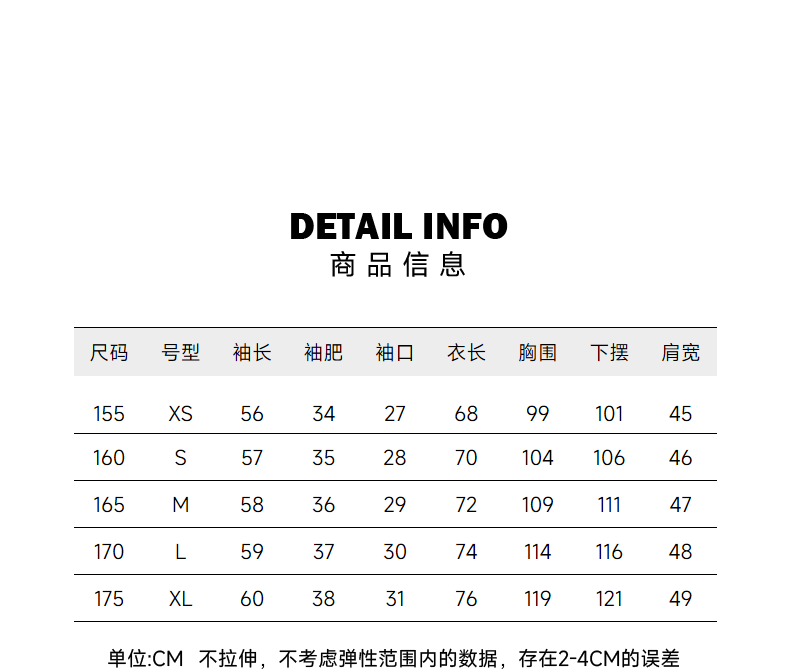 China (cm) 160-165/84-86 165-170 / 88-90 167-172 / 92-96 168-173 / 98-102 170-176 / 106-110
