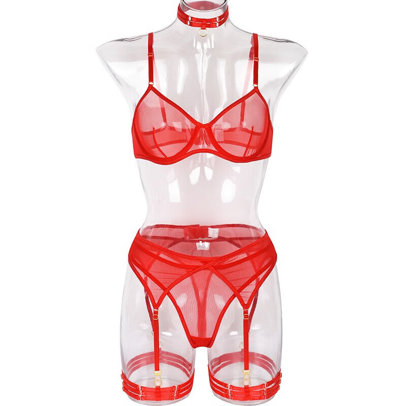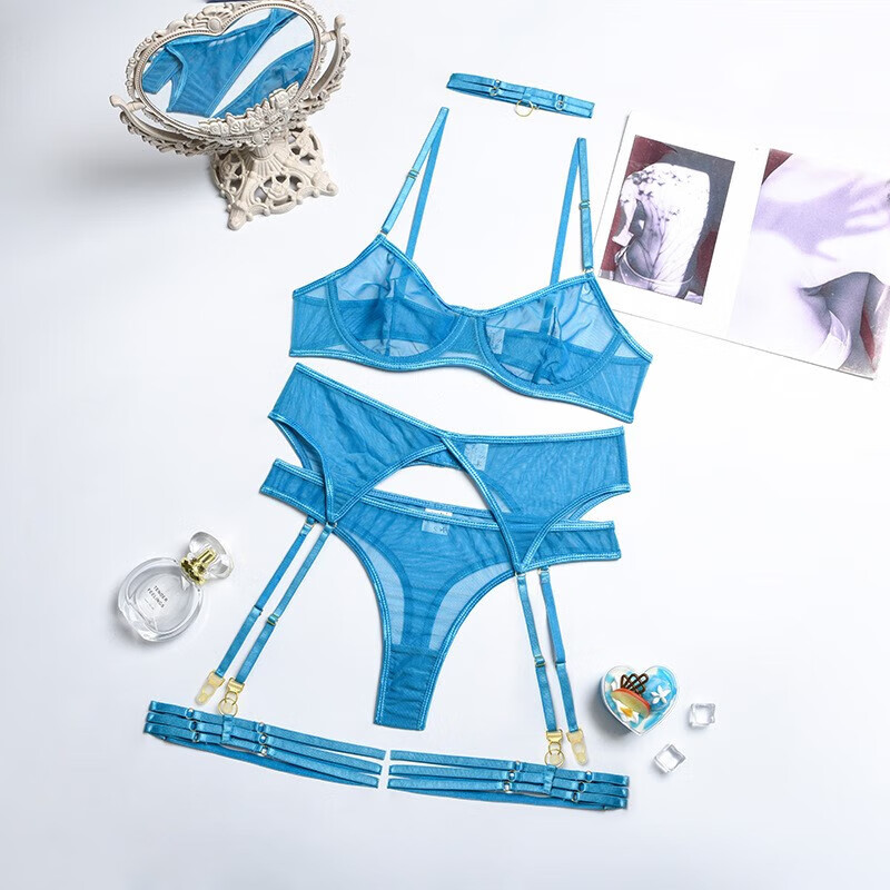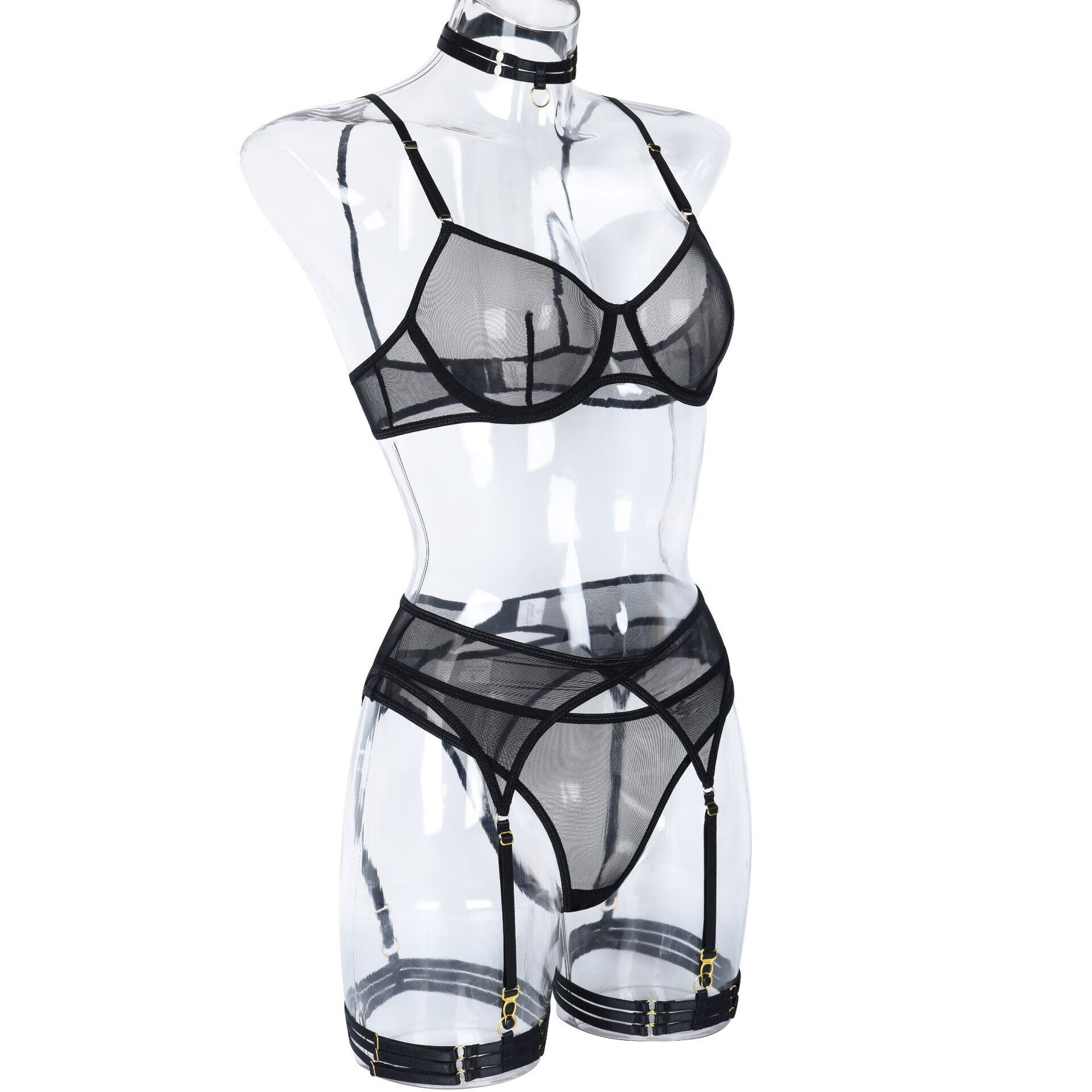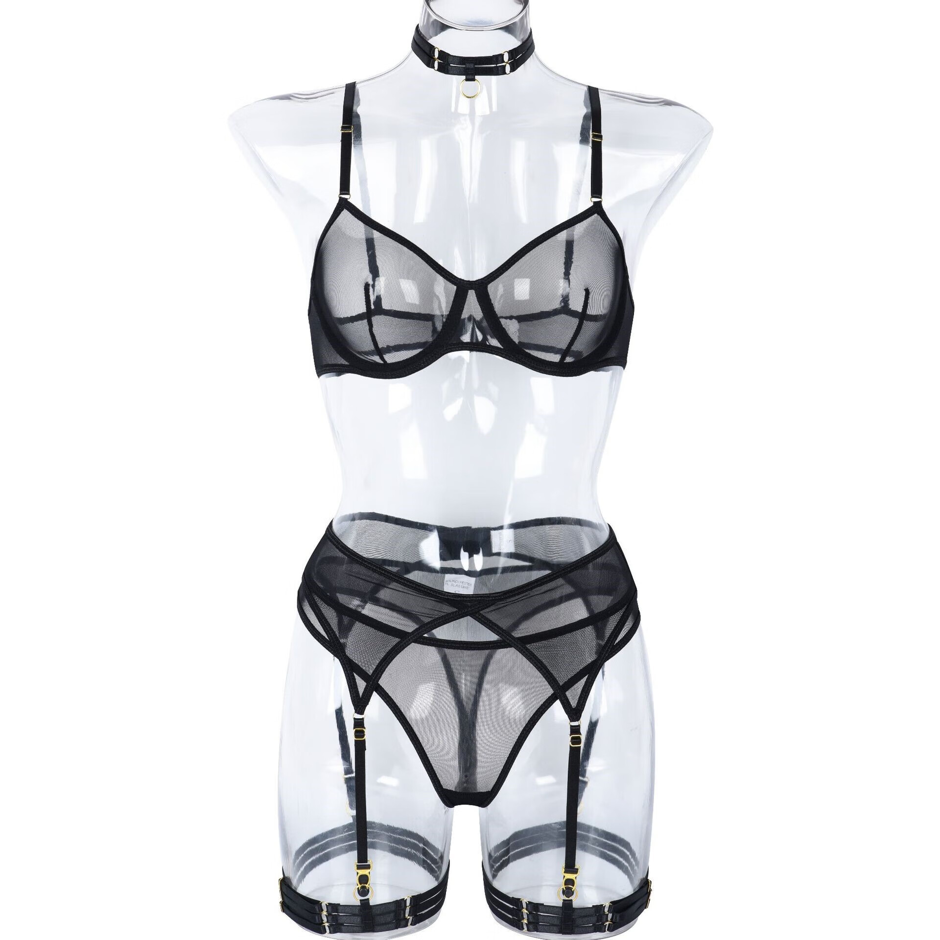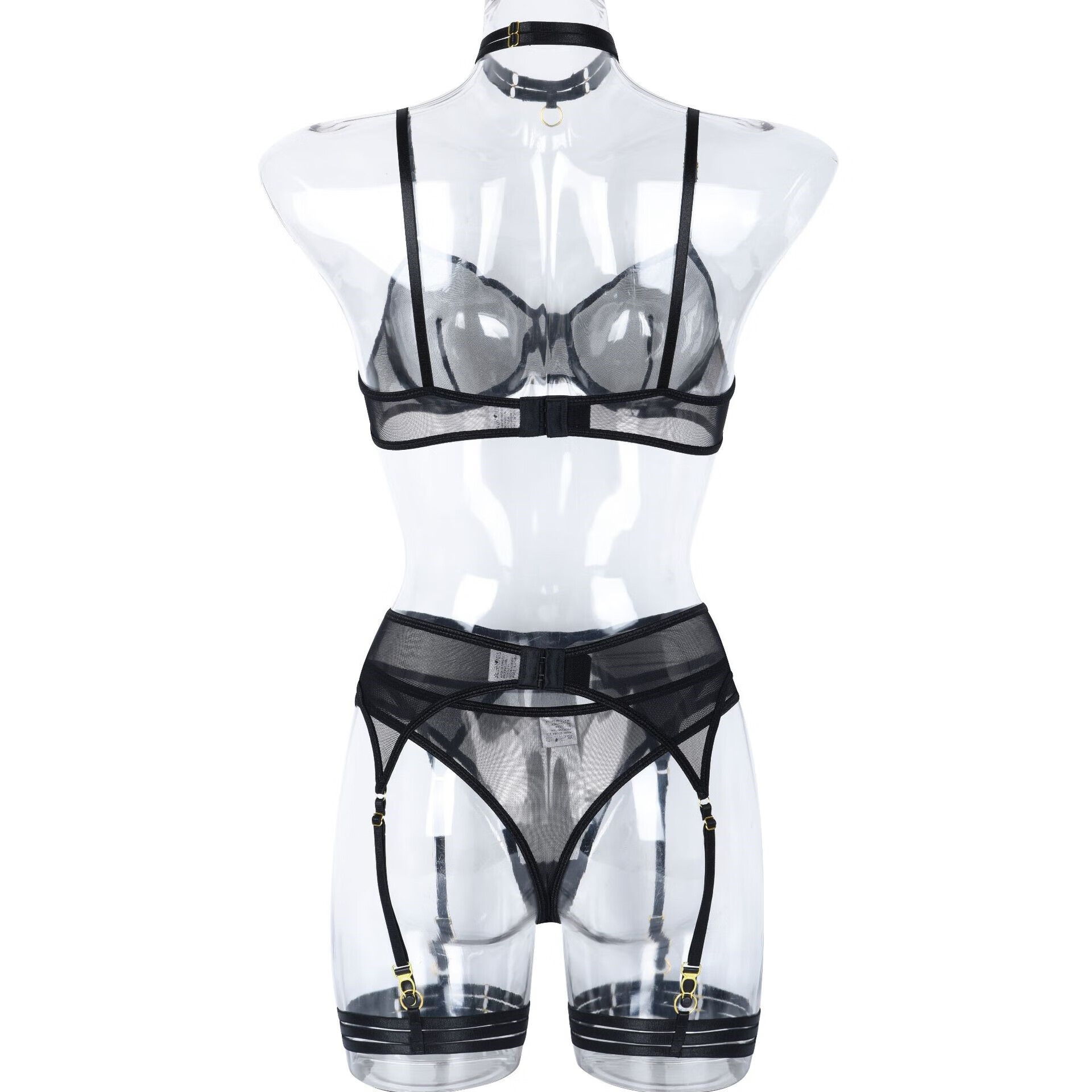CARVELOVESexy mesh sexy fourpiece set with steel ring four piece set black S