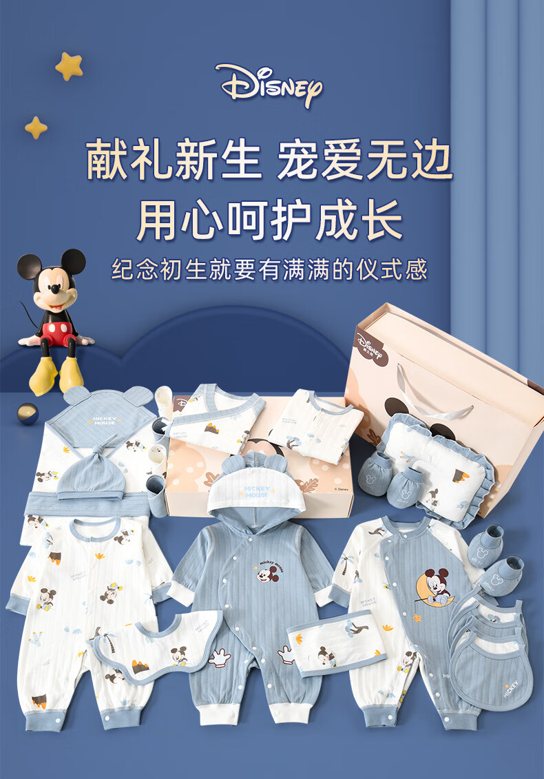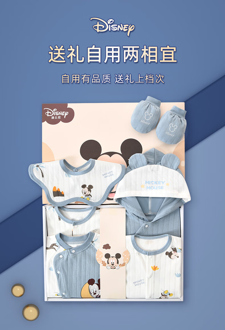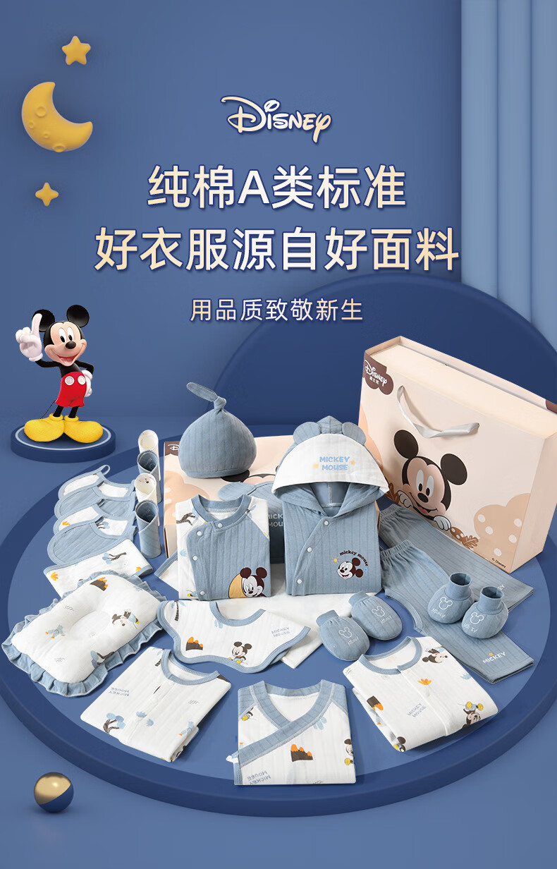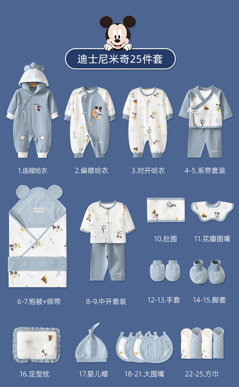 Disney Baby Clothes Newborn Gift Box Pure Cotton Autumn and Winter Newborn Set Newborn One-month-old Baby Meeting Gift Childlike Mickey Blue 25-piece Set Four Seasons 66cm (3-6 Months) Hundred Days Gift