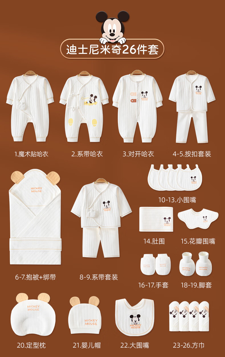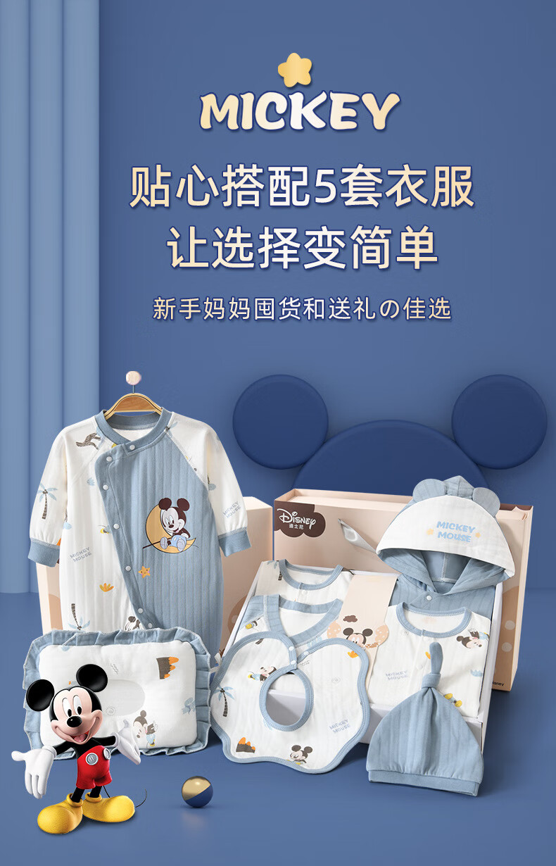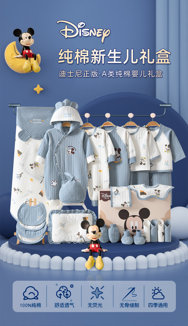 Disney Baby Clothes Newborn Gift Box Pure Cotton Autumn and Winter Newborn Set Newborn One-month-old Baby Meeting Gift Childlike Mickey Blue 25-piece Set Four Seasons 66cm (3-6 Months) Hundred Days Gift