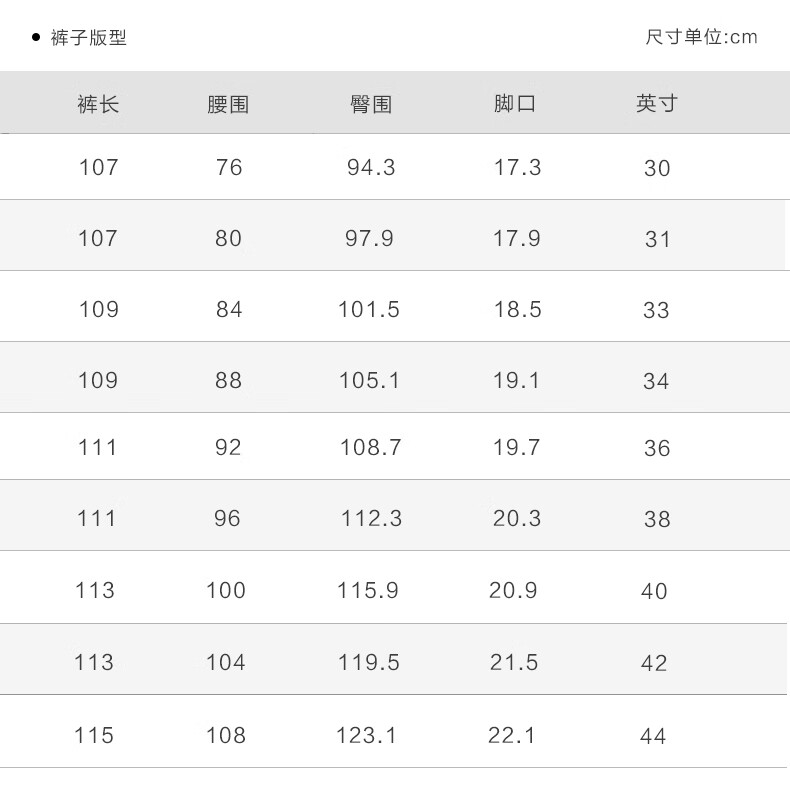 Outseam (cm) 99 cm 101.5 cm 104 cm 106.5 cm 109 cm
