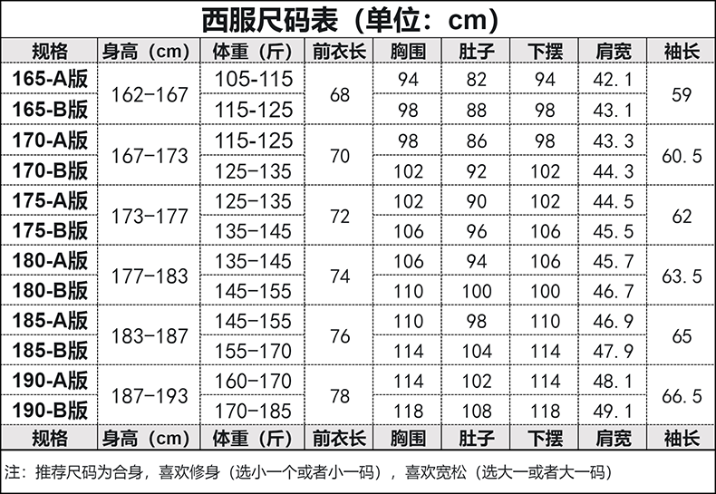 China (cm) 160-165/84-86 165-170 / 88-90 167-172 / 92-96 168-173 / 98-102 170-176 / 106-110