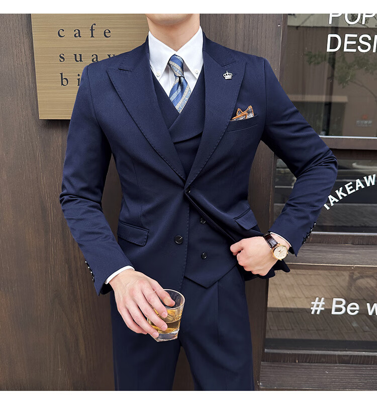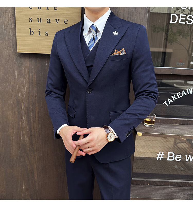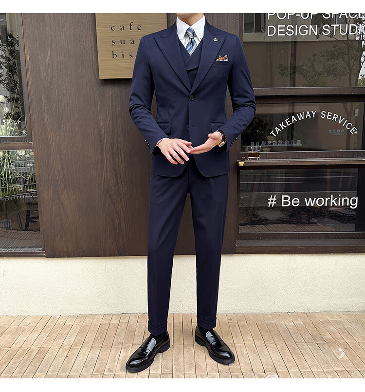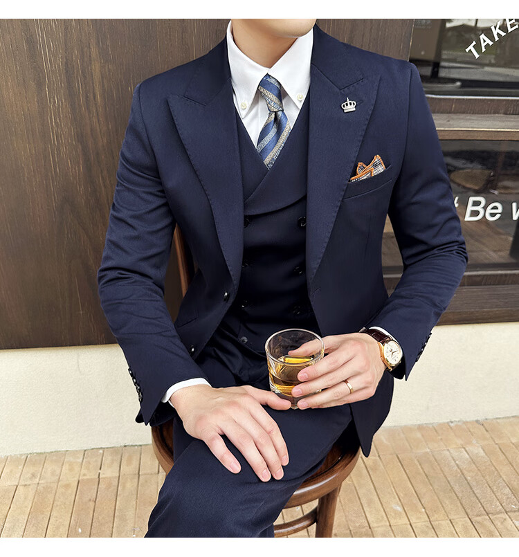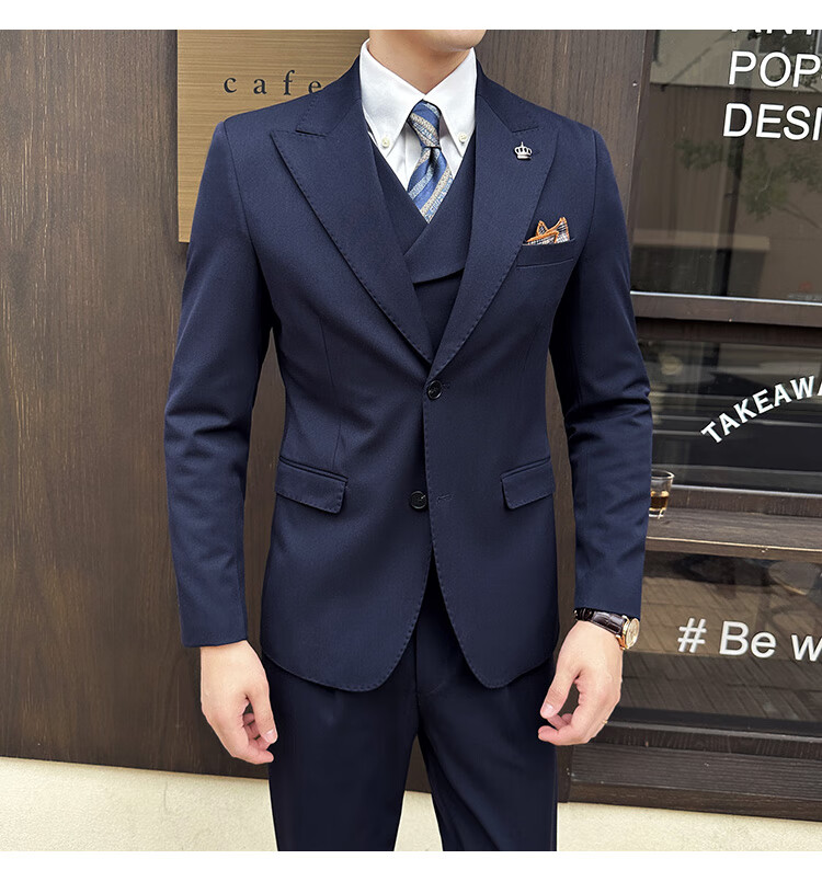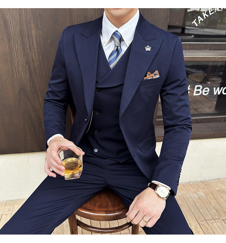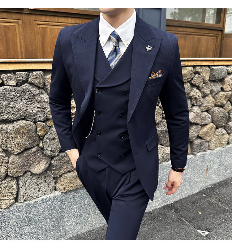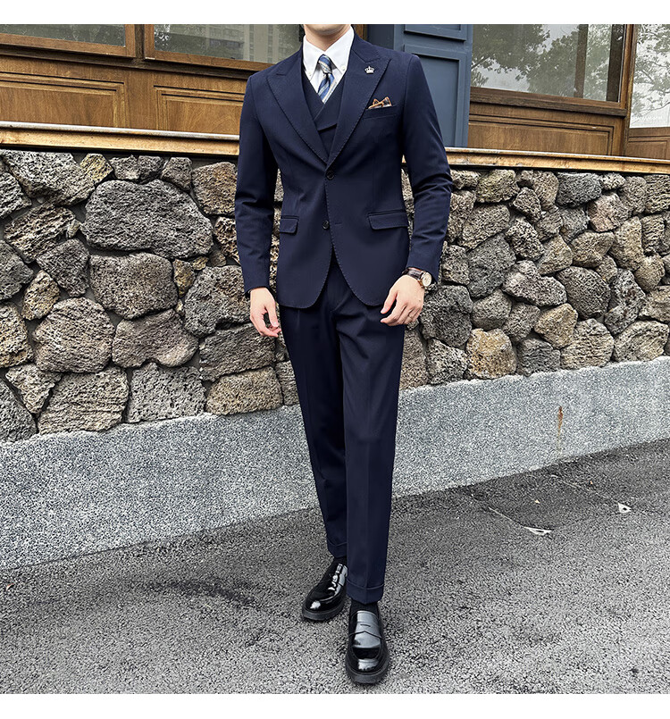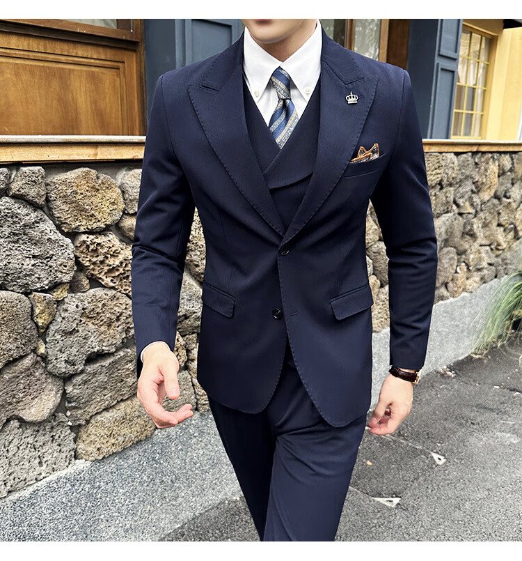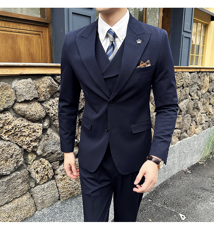 ROMON Italian groom suit men's wedding formal dress Korean style slim lapel business casual suit jacket 9002 navy blue (suit + vest + pants) XL