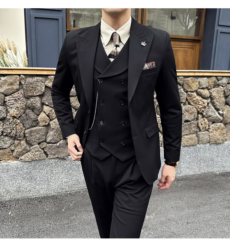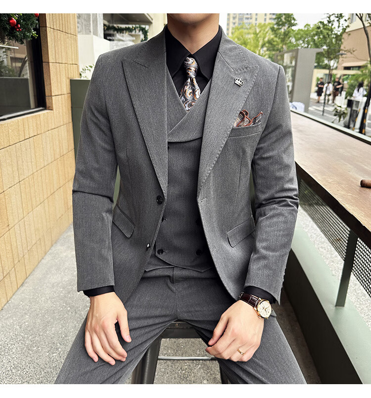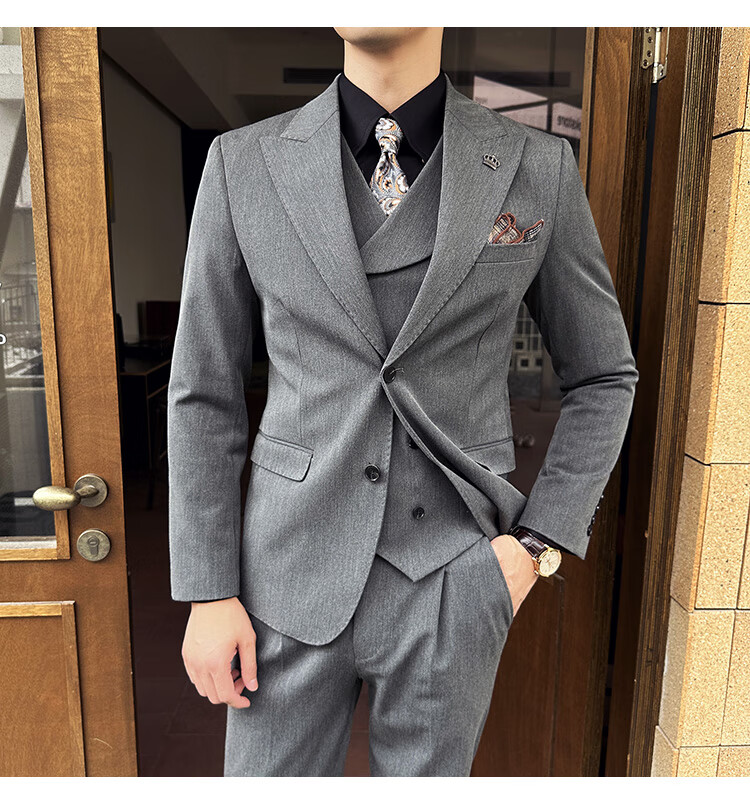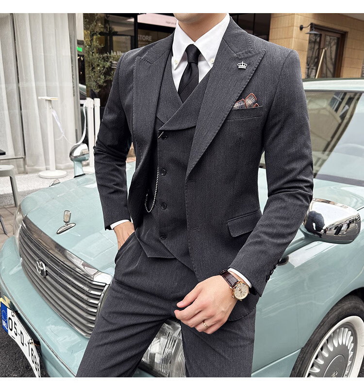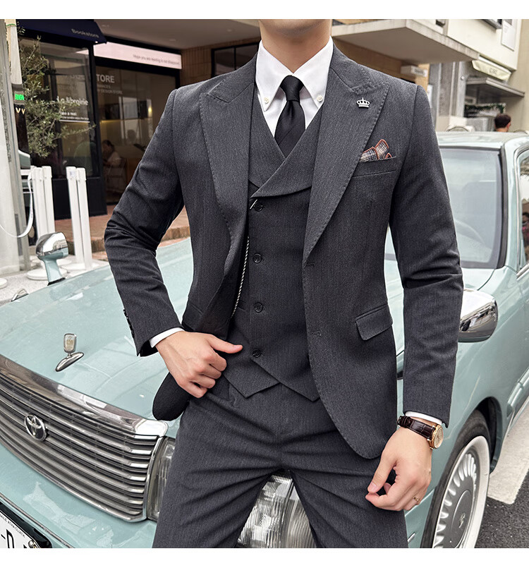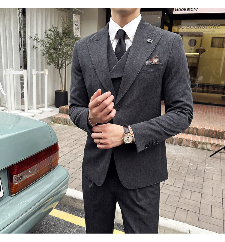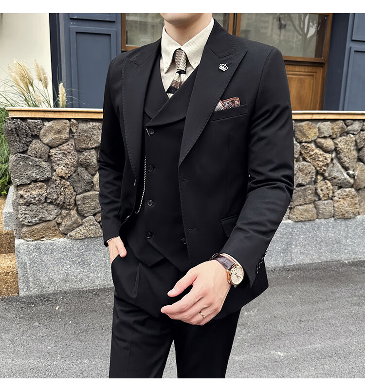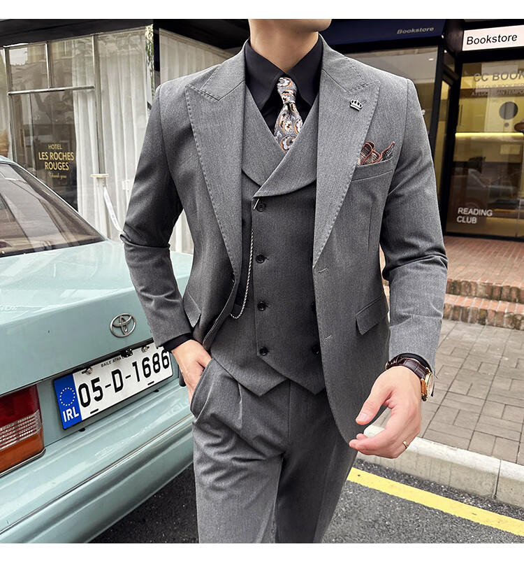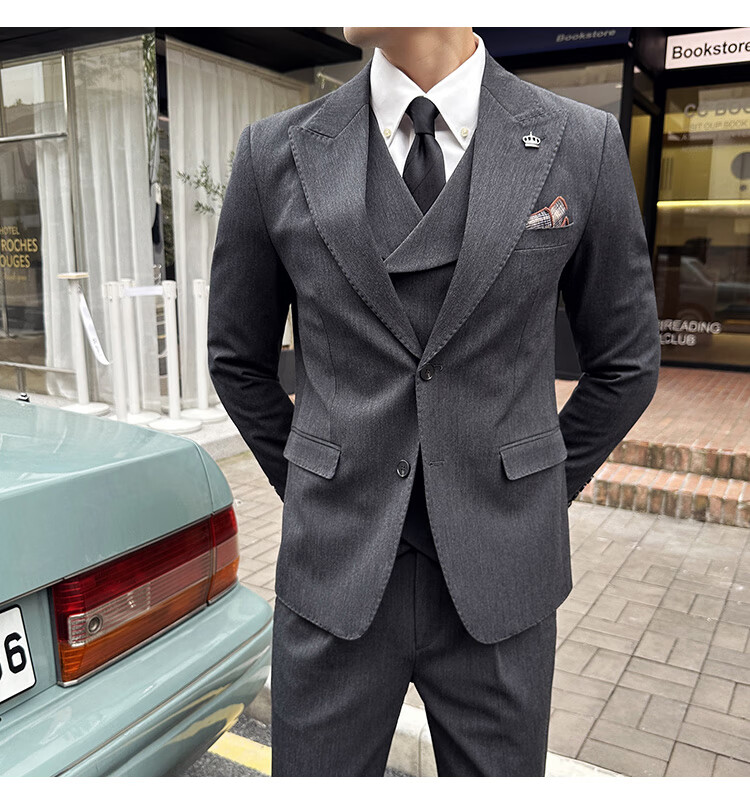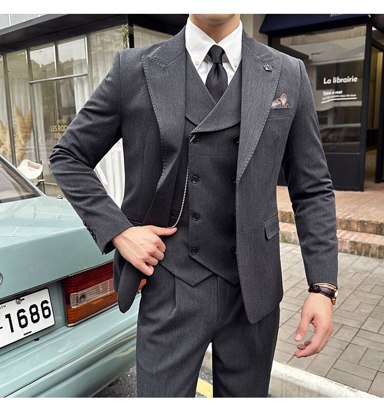 ROMON Italian groom suit men's wedding formal dress Korean style slim lapel business casual suit jacket 9002 navy blue (suit + vest + pants) XL