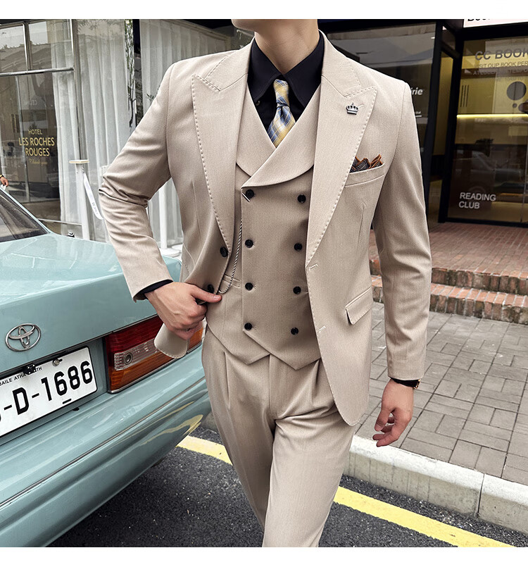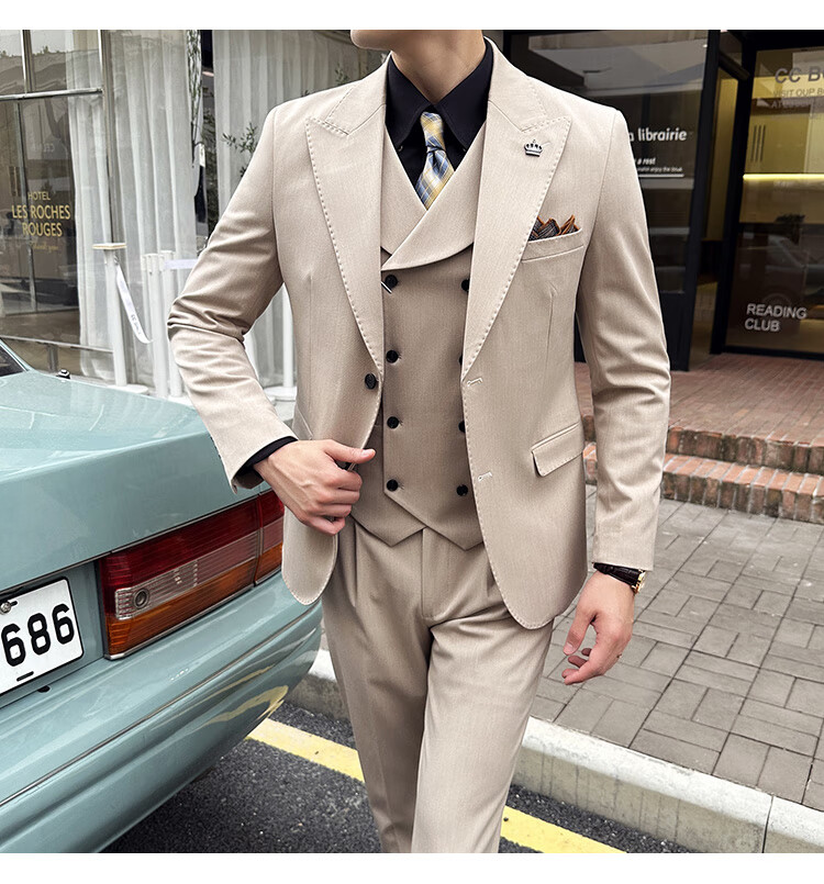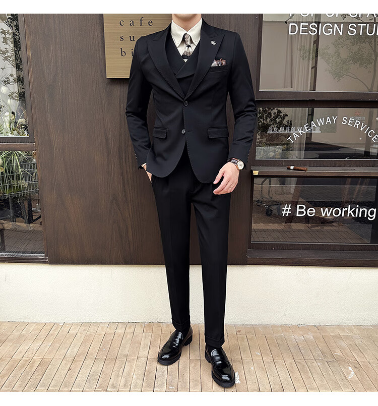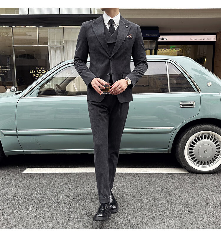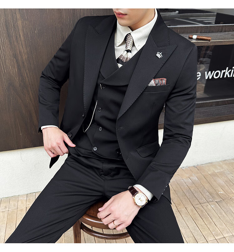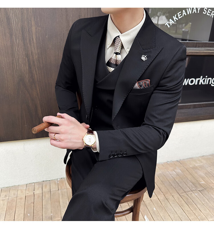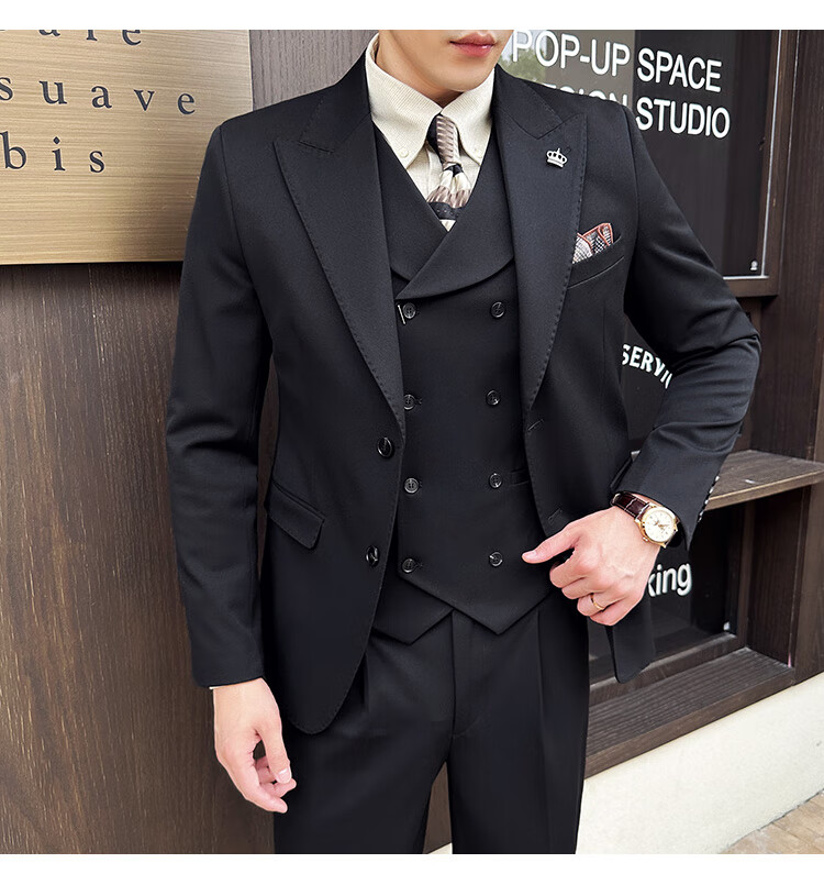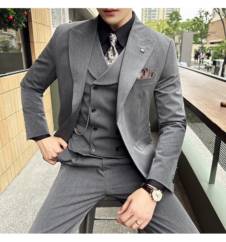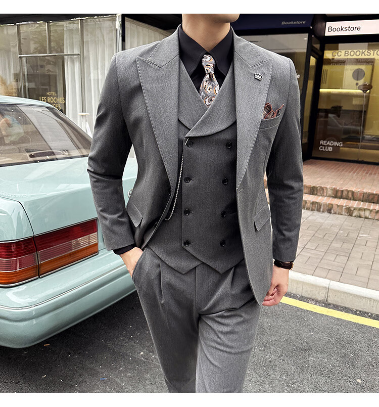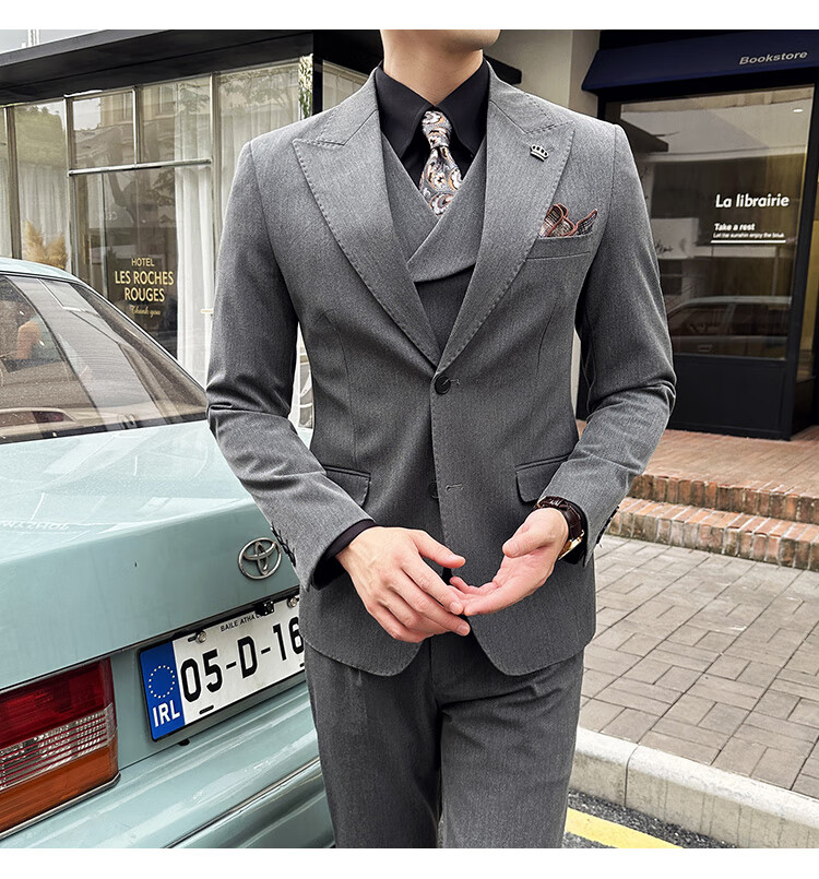 ROMON Italian groom suit men's wedding formal dress Korean style slim lapel business casual suit jacket 9002 navy blue (suit + vest + pants) XL