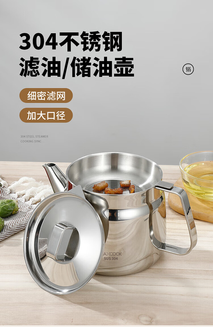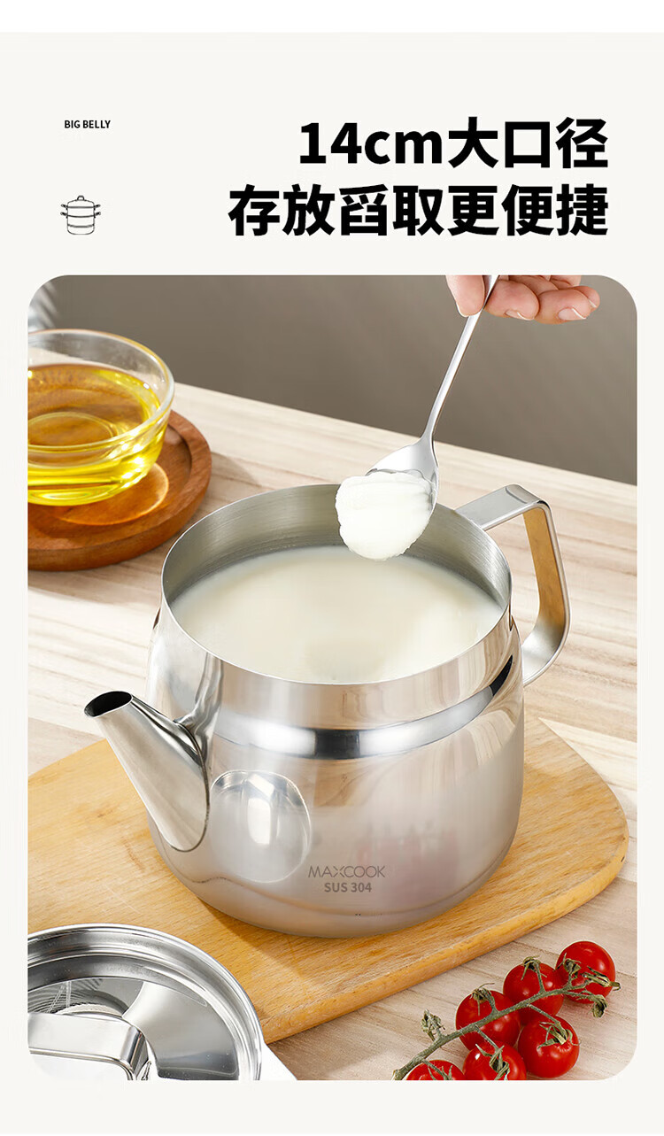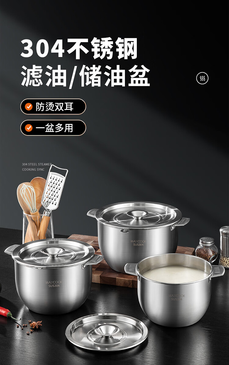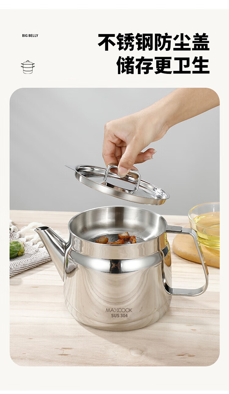 MAXCOOK lard tank 304 stainless steel oil basin with lid and high temperature resistance kitchen chili oil seasoning tank household storage filter oil pot with filter oil basin 2.8L MCWA9035