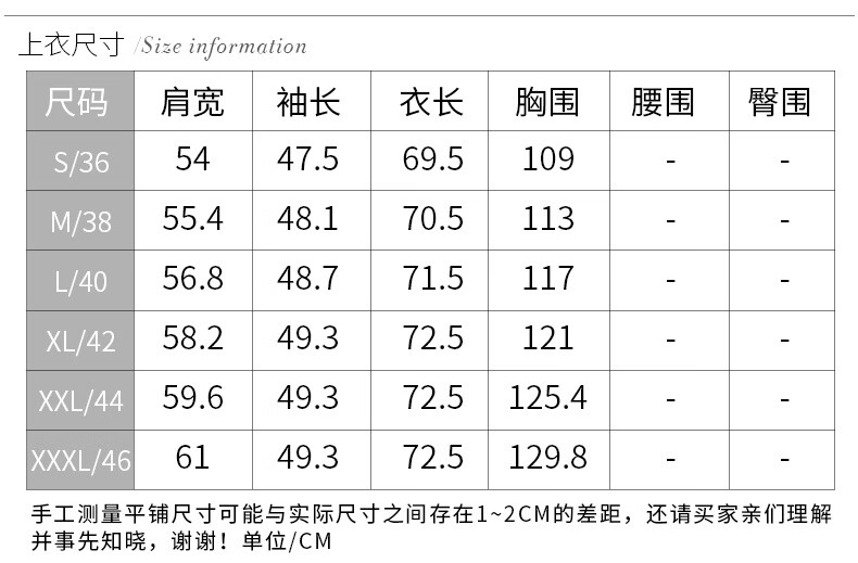 China (cm) 160-165/84-86 165-170 / 88-90 167-172 / 92-96 168-173 / 98-102 170-176 / 106-110