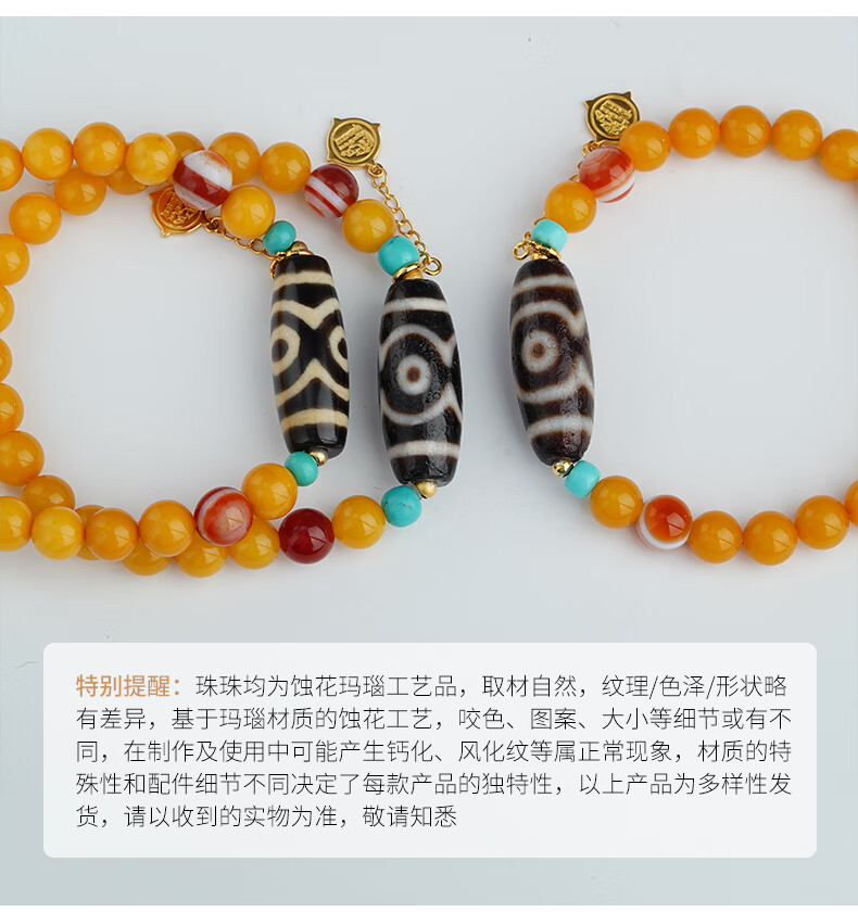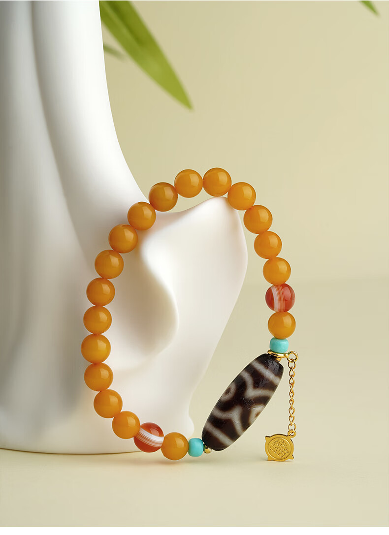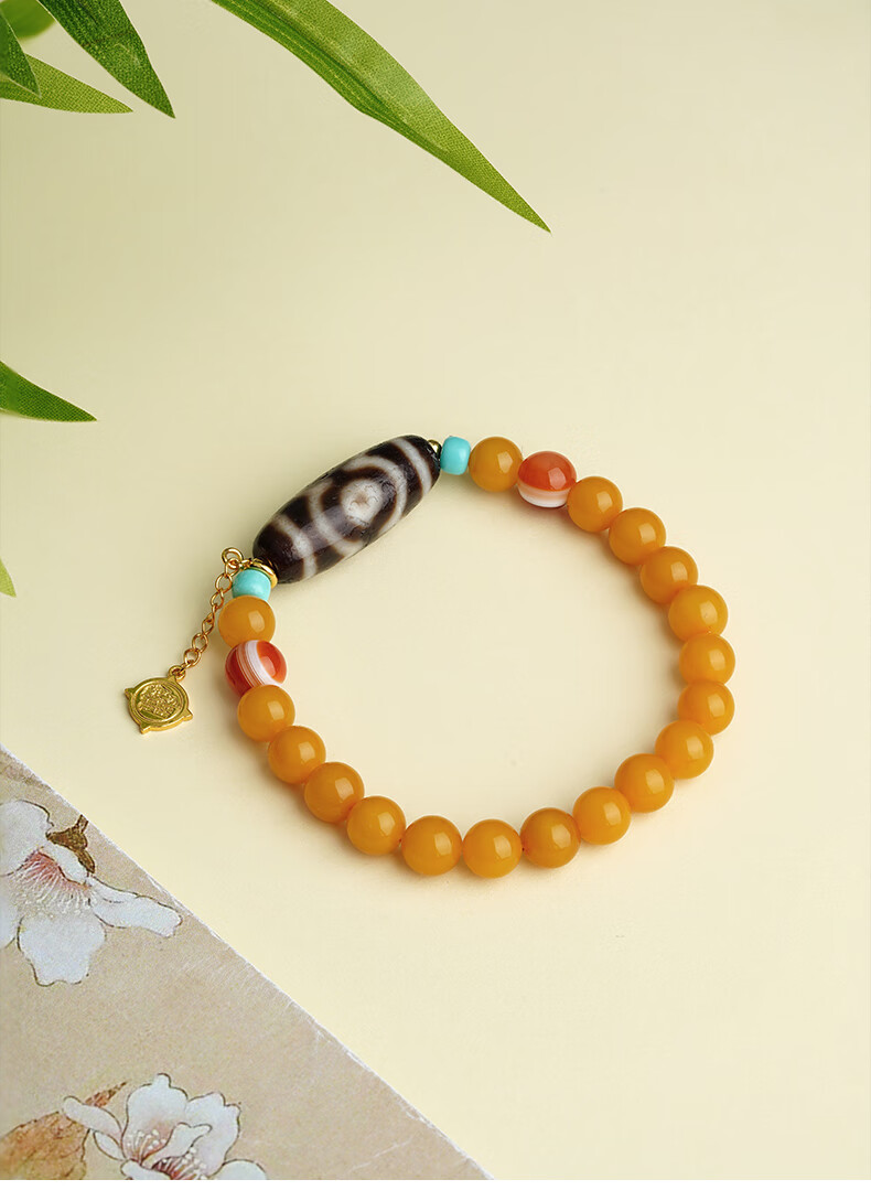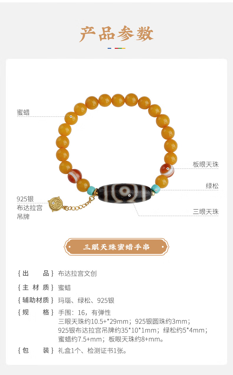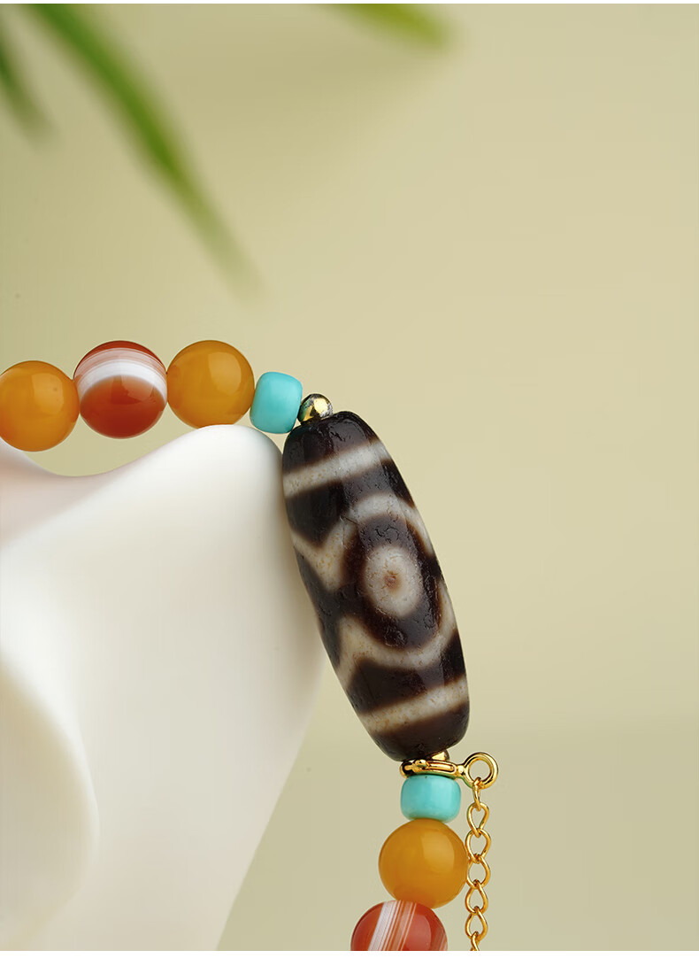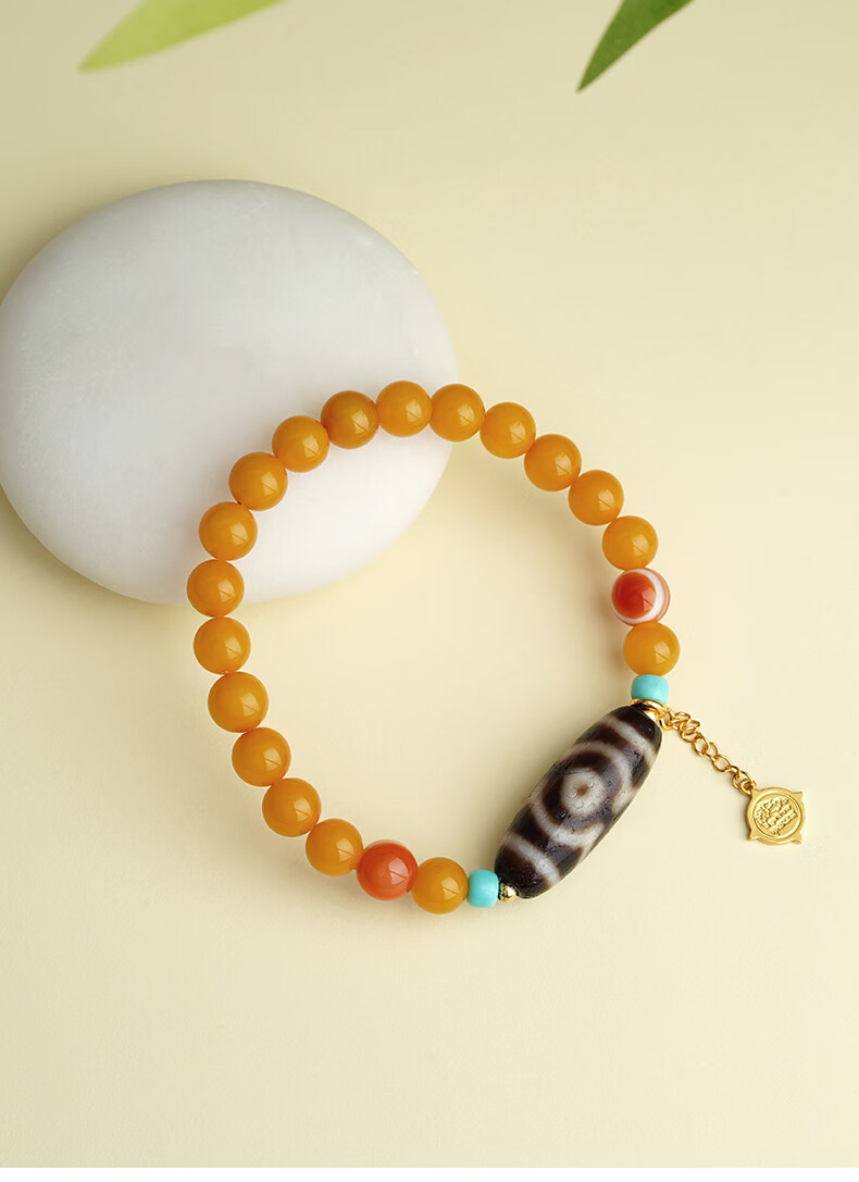 Potala Palace Three-Eyed Dzi Beads Beeswax Bracelet Agate Turquoise Transfer Bead Tibetan Birthday Gift for Girlfriend Three-Eyed Dzi Beads Beeswax Bracelet
