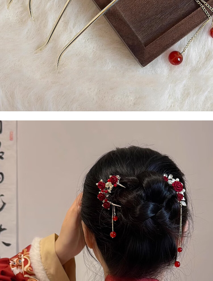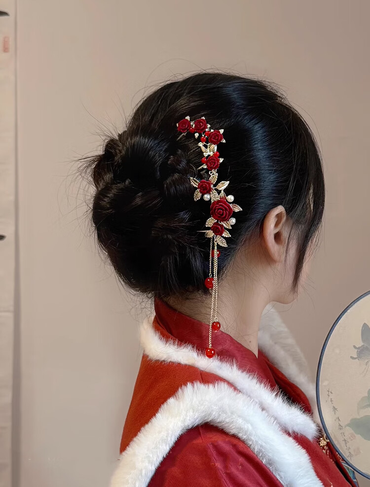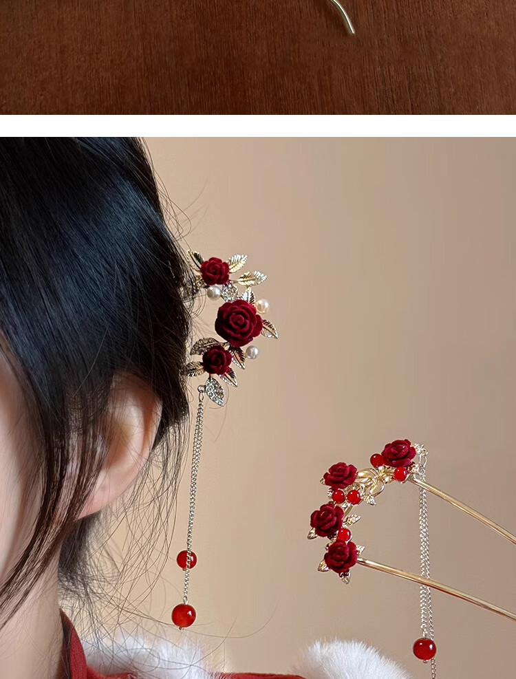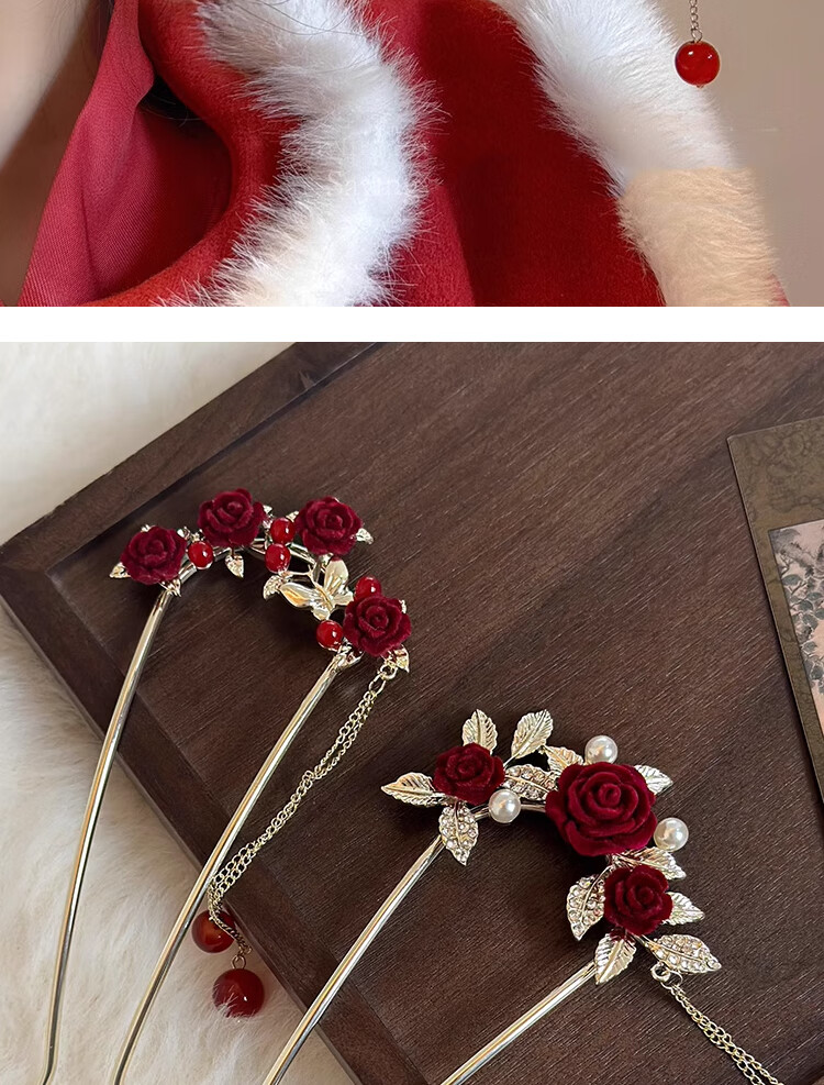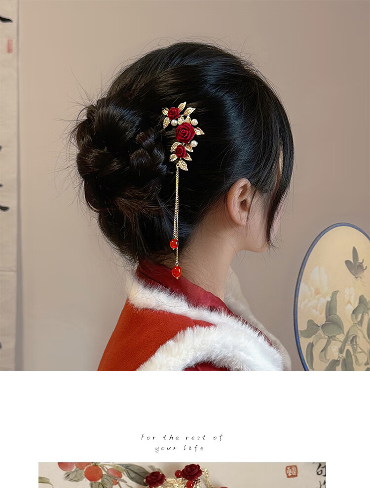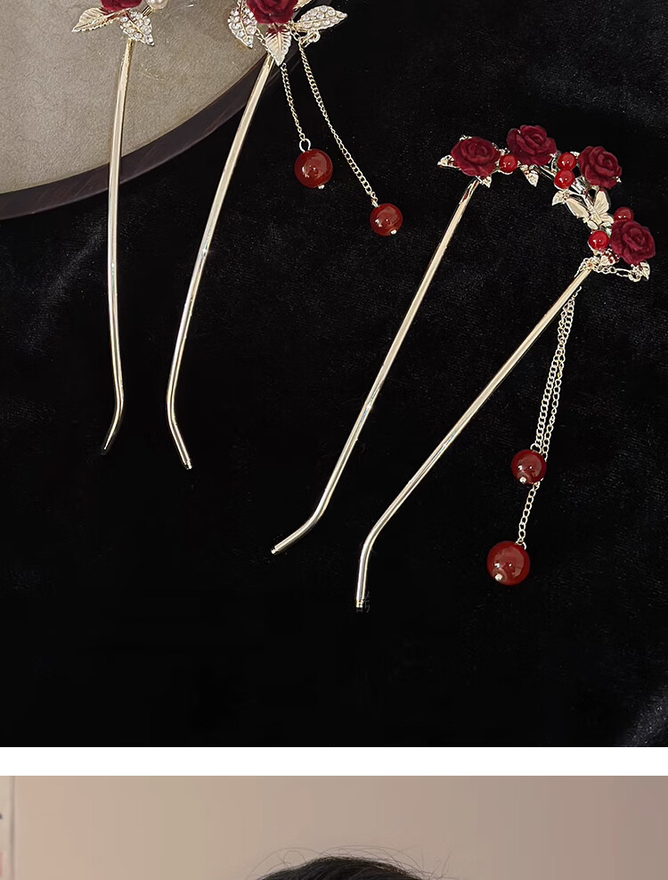 Happy Two Worlds Ancient Style Festive Red Rose Hairpin Women's New Chinese Xiuhe Clothing Toast Wedding Headwear Bridal Hair Accessories Hairpin Hairpin