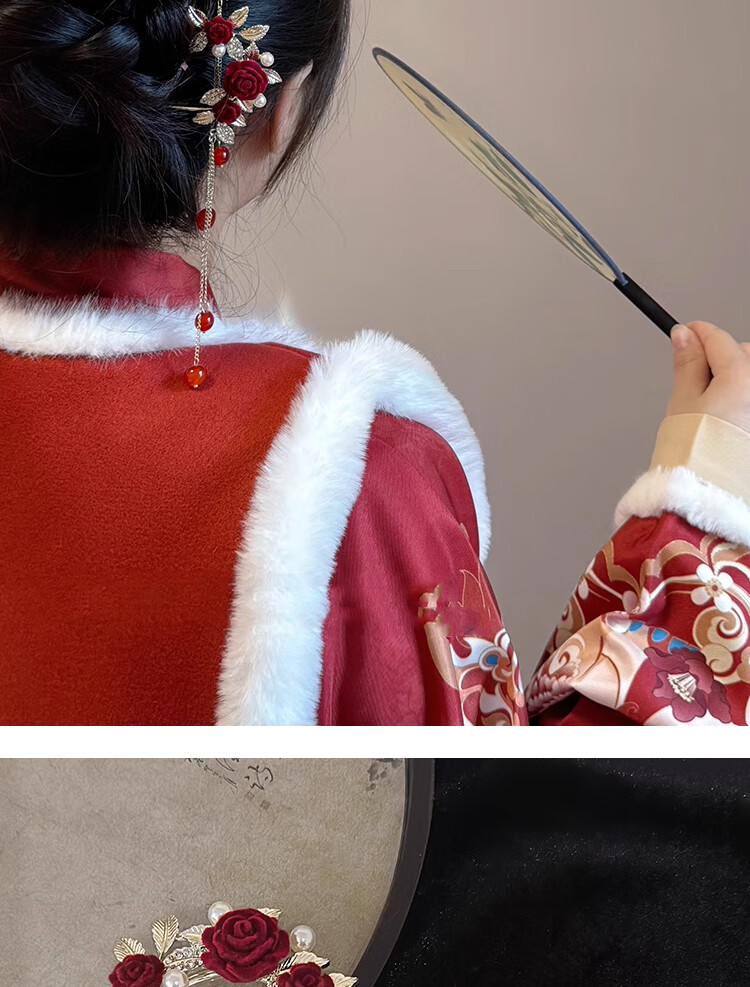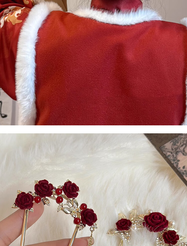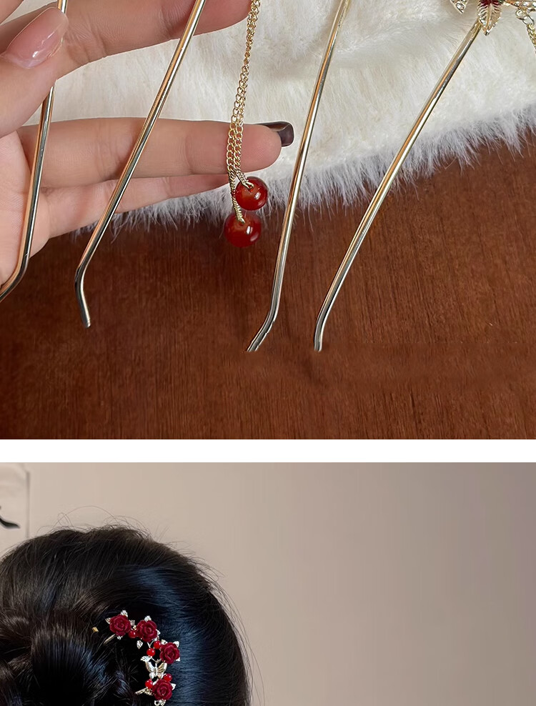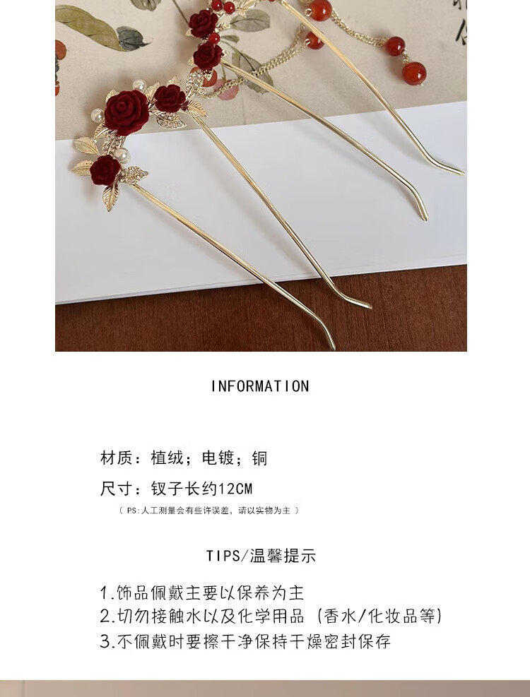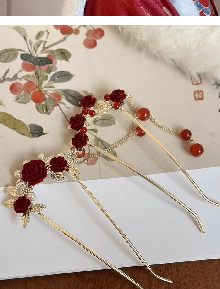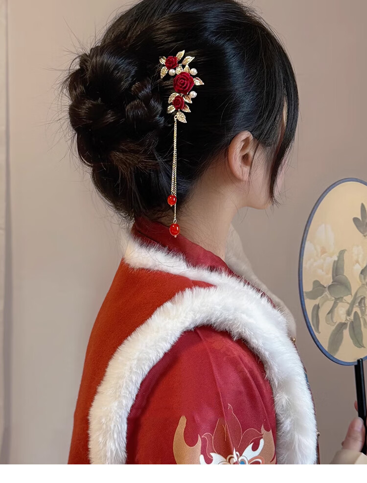 Happy Two Worlds Ancient Style Festive Red Rose Hairpin Women's New Chinese Xiuhe Clothing Toast Wedding Headwear Bridal Hair Accessories Hairpin Hairpin
