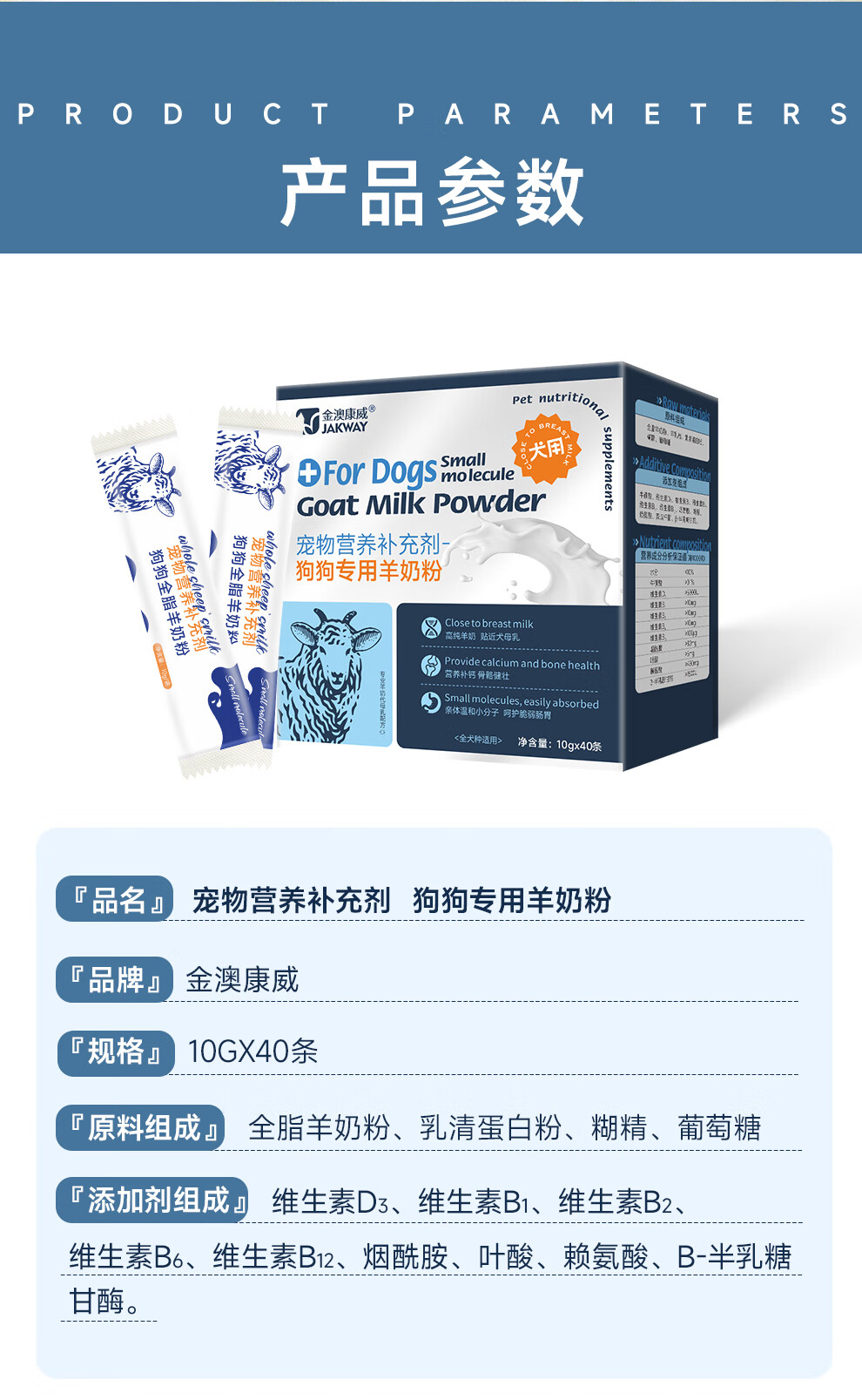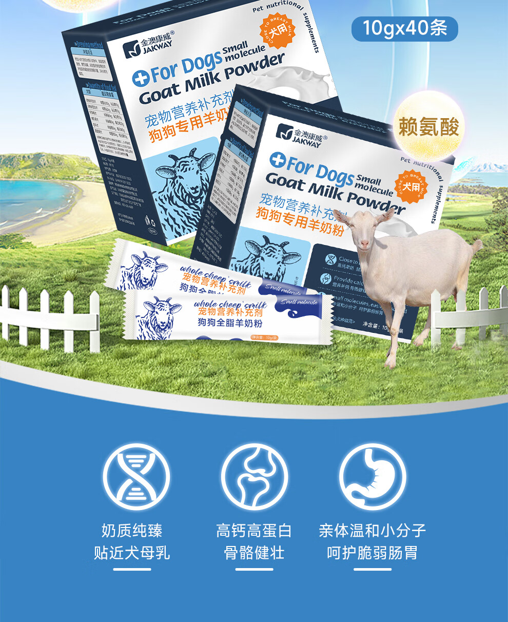 Jinao Kangwei Pet Dog Goat Milk Powder Newborn, Juvenile and Adult Postpartum Nutritional Calcium Supplement, Bone Strengthening, High Nutritional Conditioning, Gastrointestinal Conditioning, All Stages Goat Milk Powder for Dogs 10g*40/box