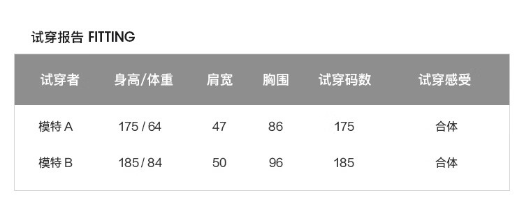 China (cm) 165 / 88-90 170 / 96-98 175 / 108-110 180 / 118-122 185 / 126-130