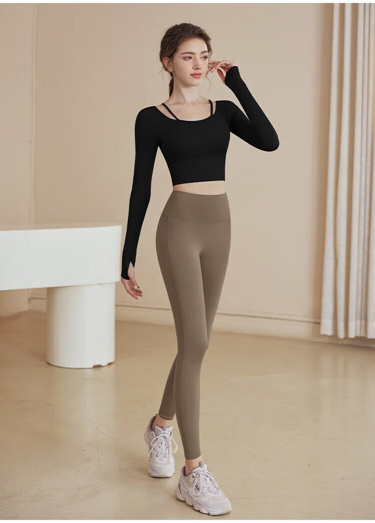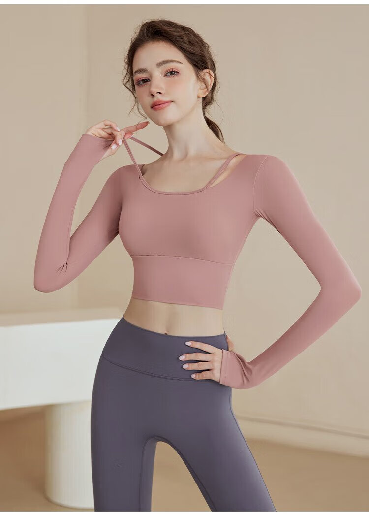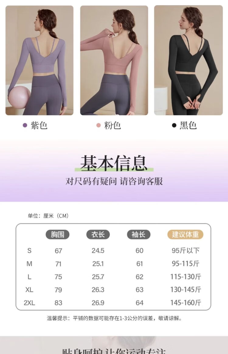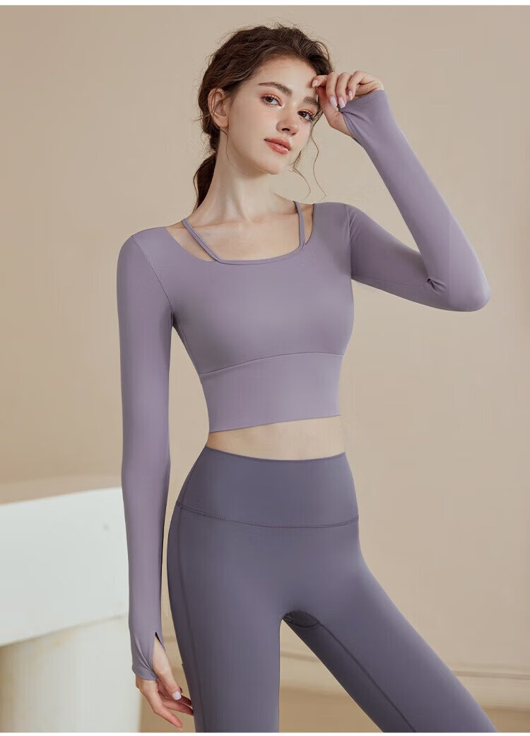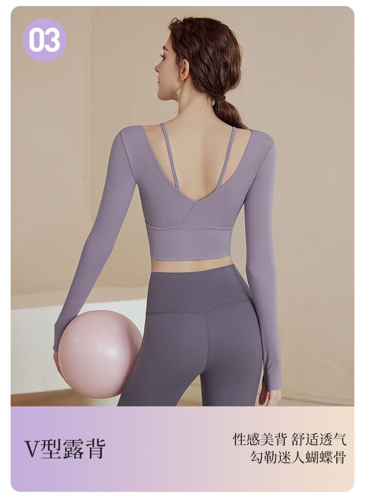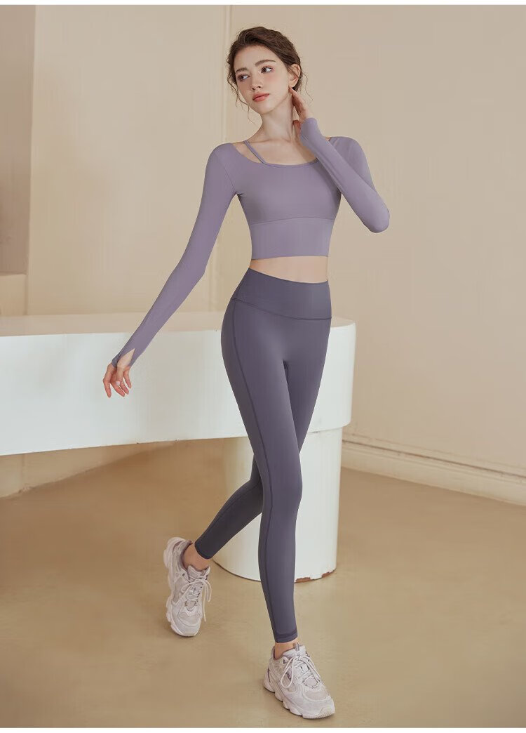 Yoga girl yoga clothing women's suit new long-sleeved sports top professional running training Pilates fitness clothing purple top + gray purple trousers M (95-110Jin Jin equals 0.5 kg)
