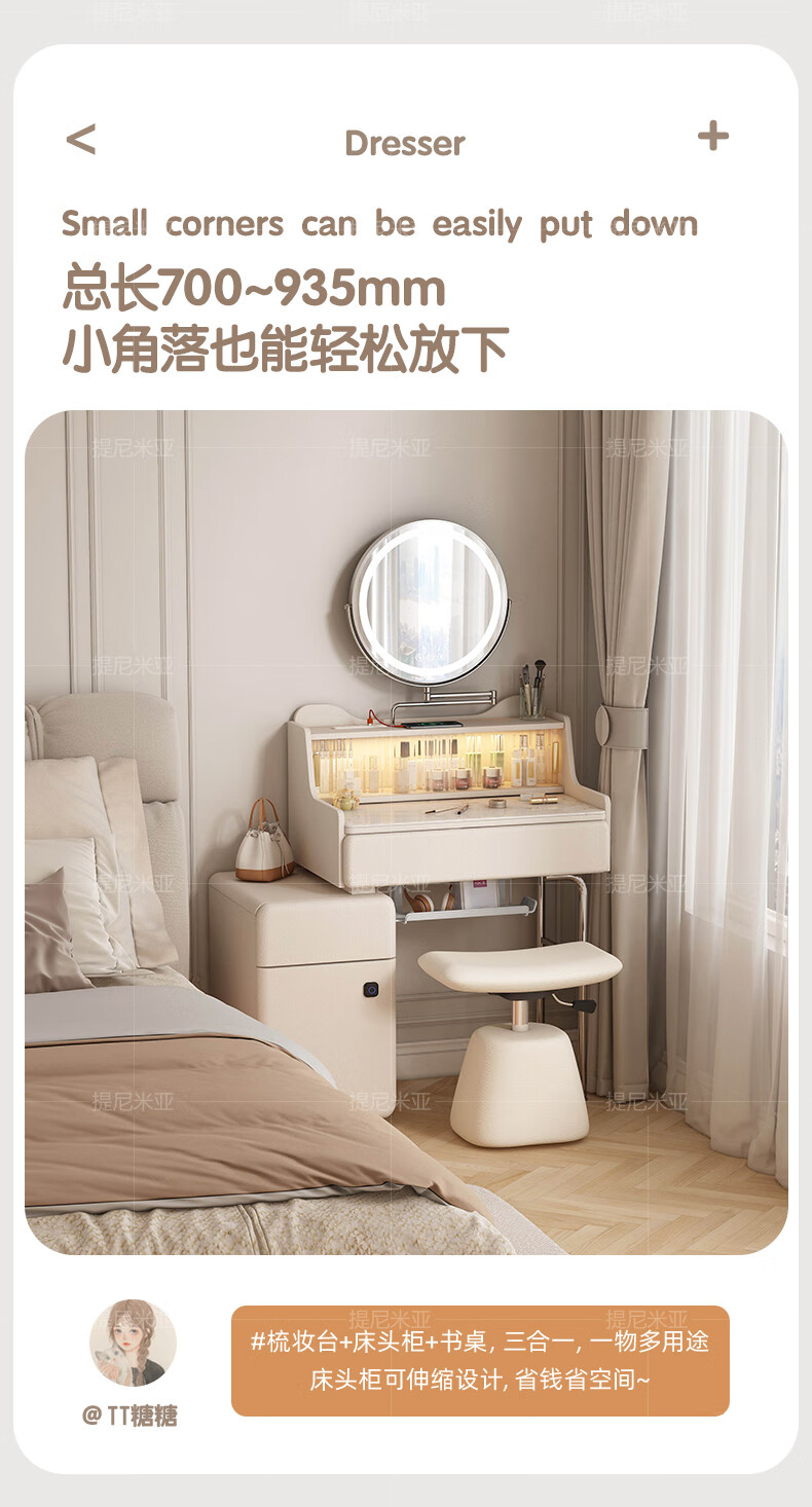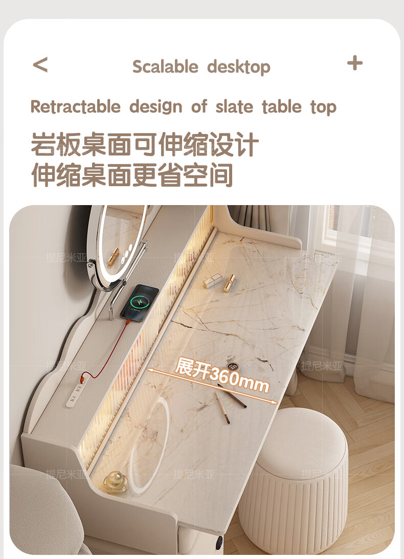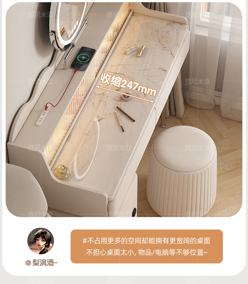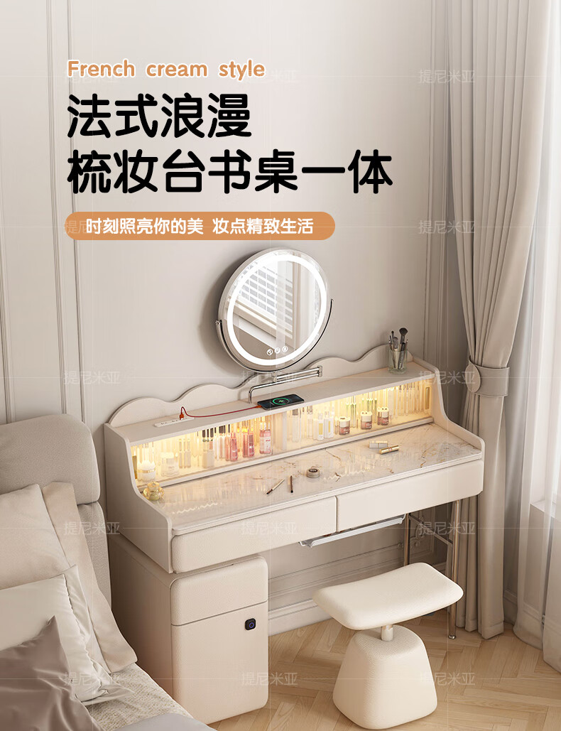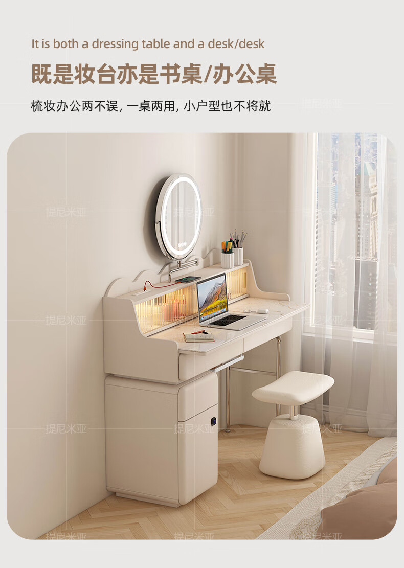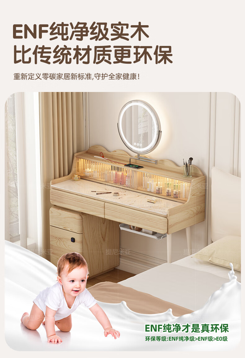 Tinymiya light cream style dressing table for bedroom small apartment 80cm wide storage cabinet bedside table integrated slate dressing table 60cm丨ENF all solid wood丨socket + air pressure lifting stool