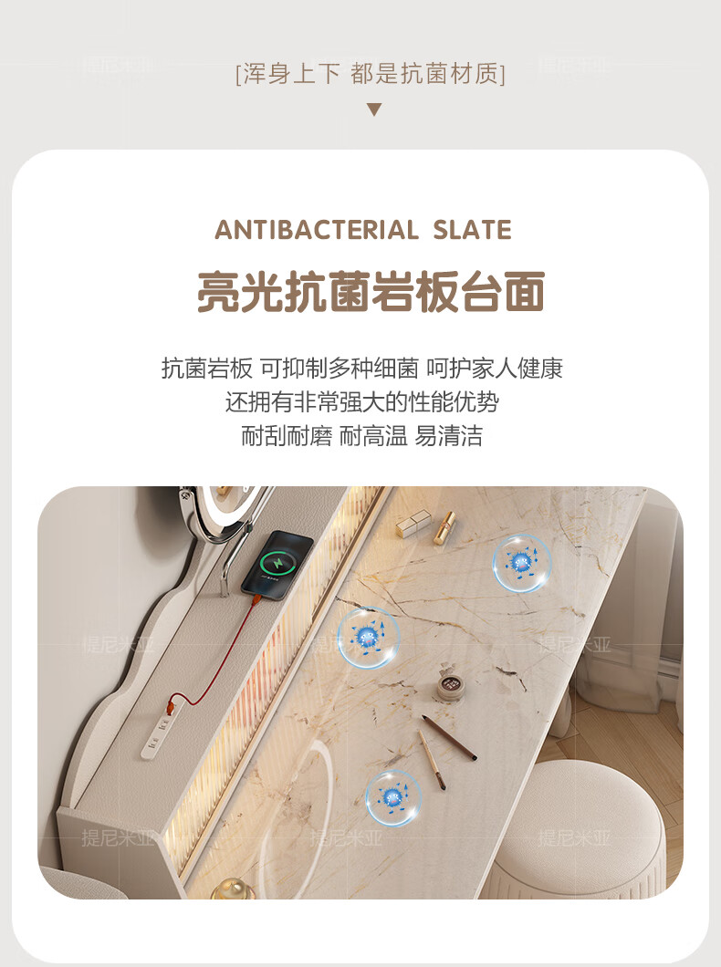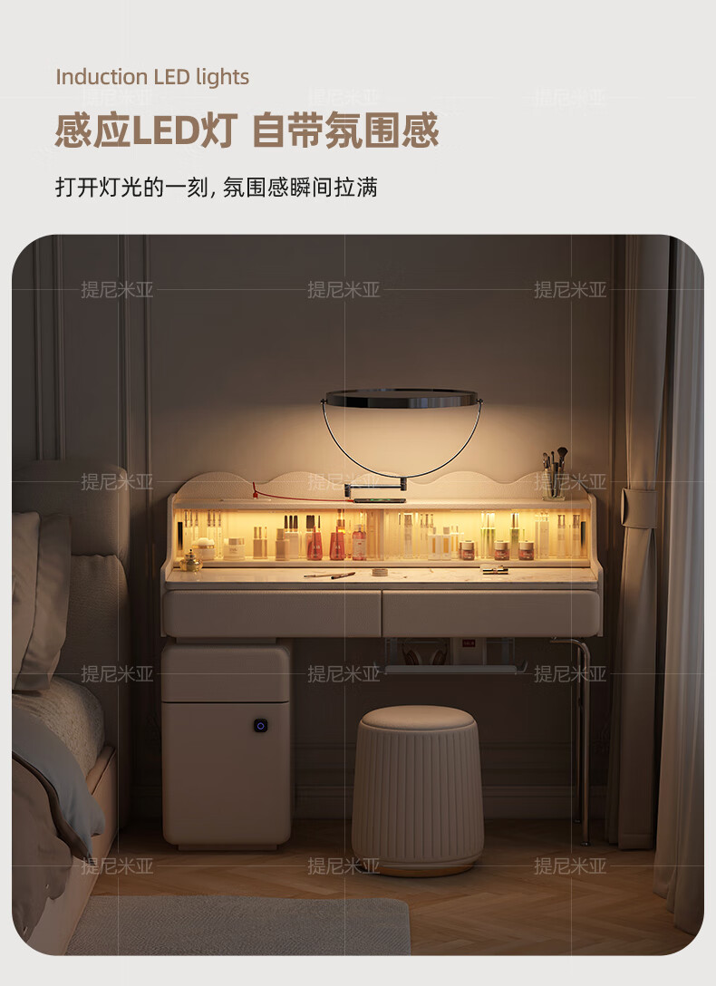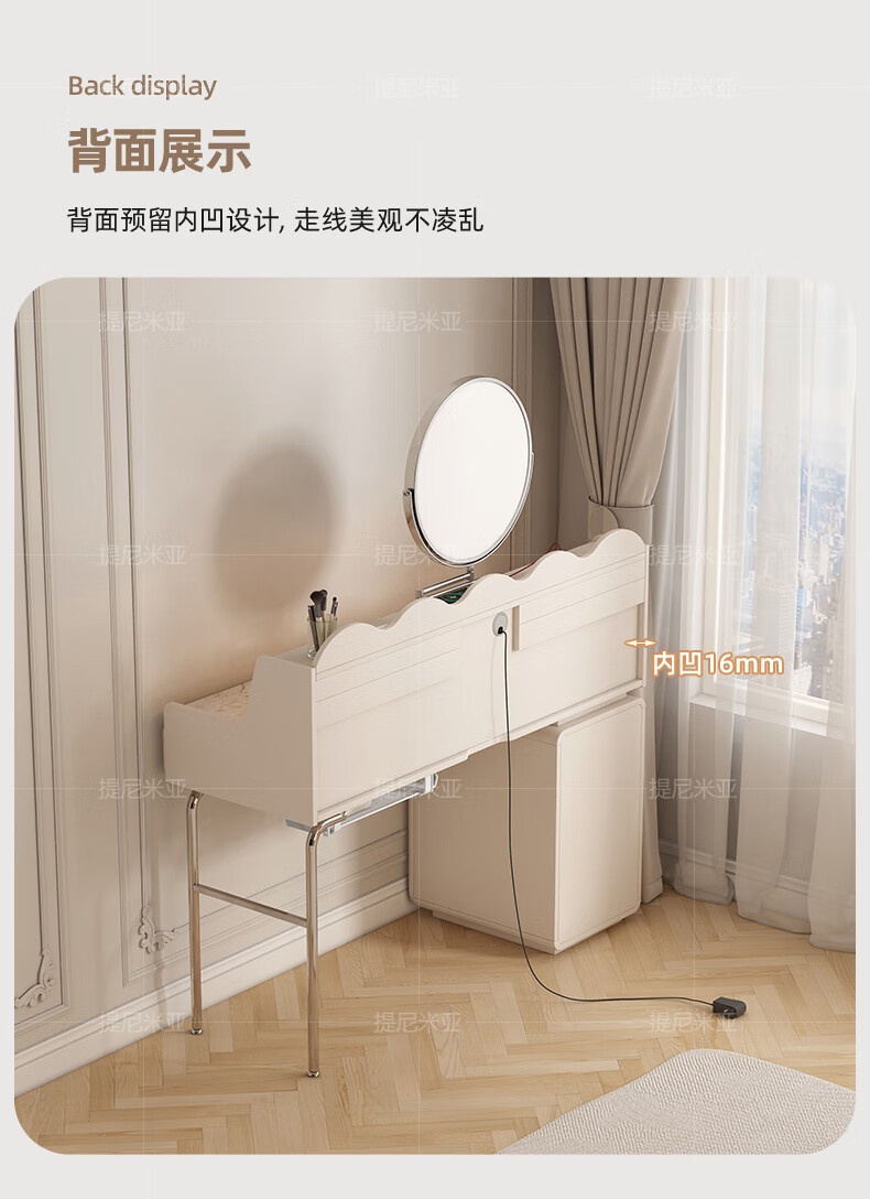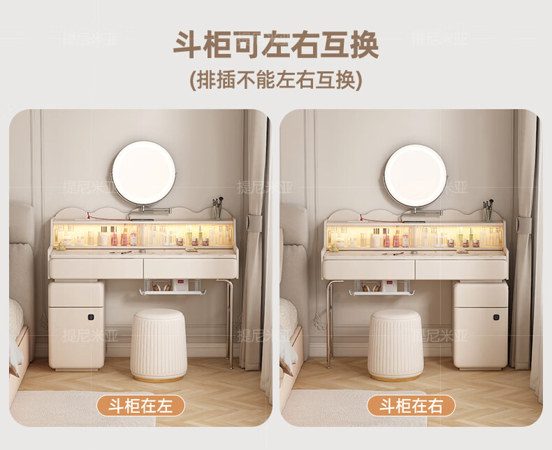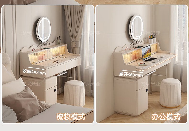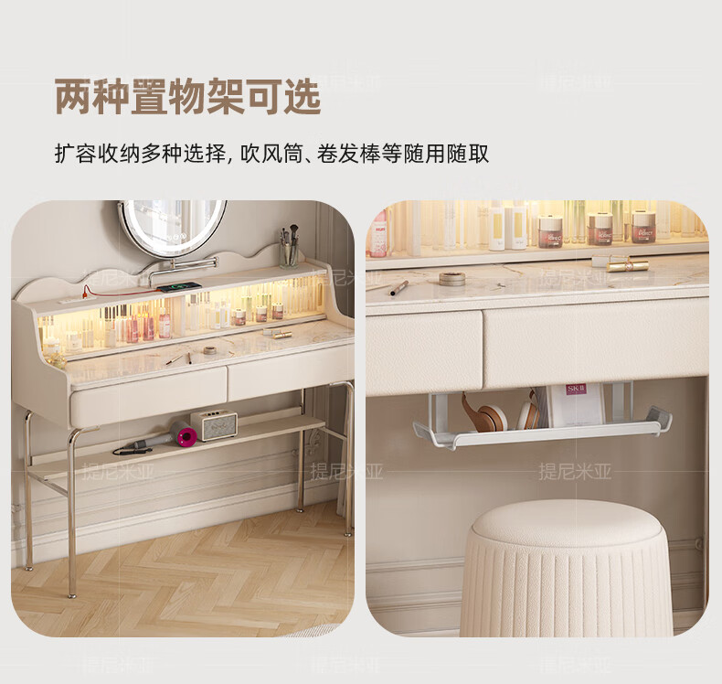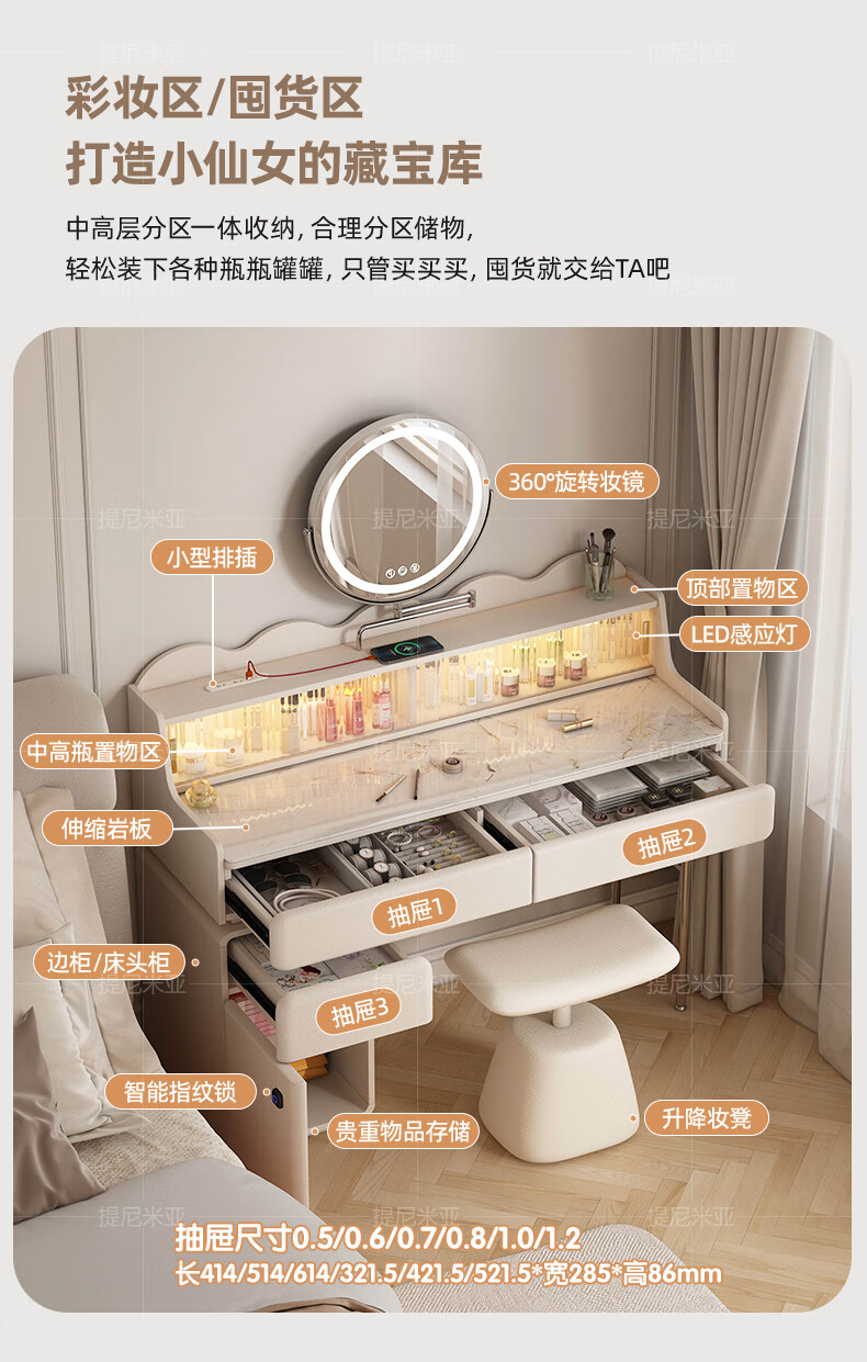 Tinymiya light cream style dressing table for bedroom small apartment 80cm wide storage cabinet bedside table integrated slate dressing table 60cm丨ENF all solid wood丨socket + air pressure lifting stool
