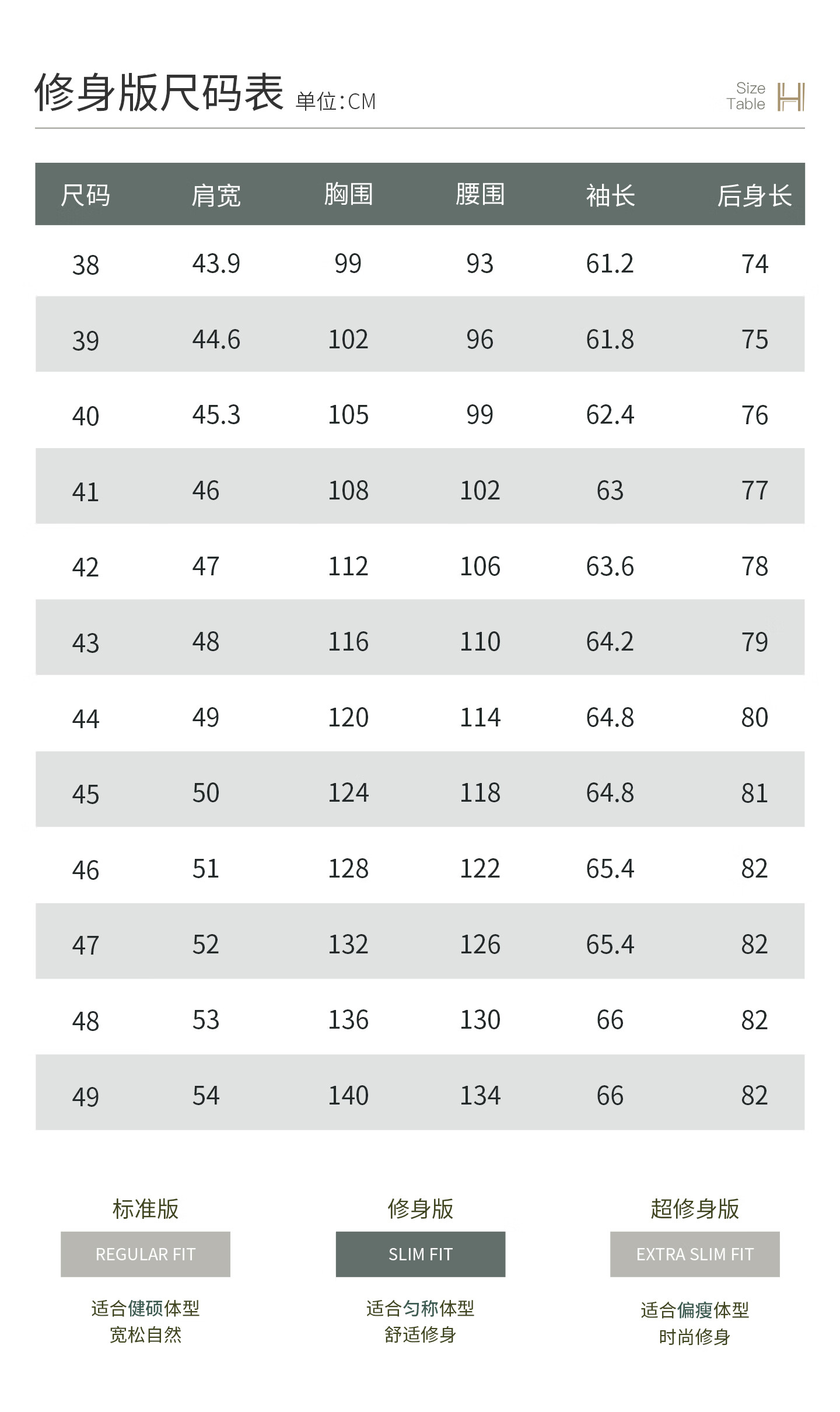 China (cm) 160-165/84-86 165-170 / 88-90 167-172 / 92-96 168-173 / 98-102 170-176 / 106-110