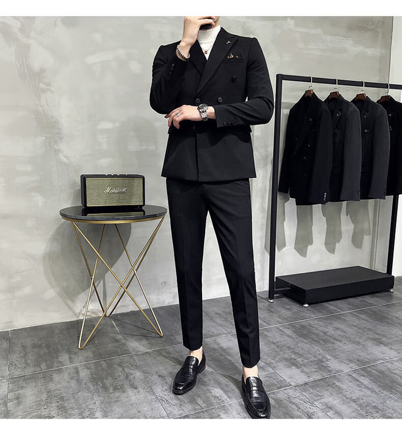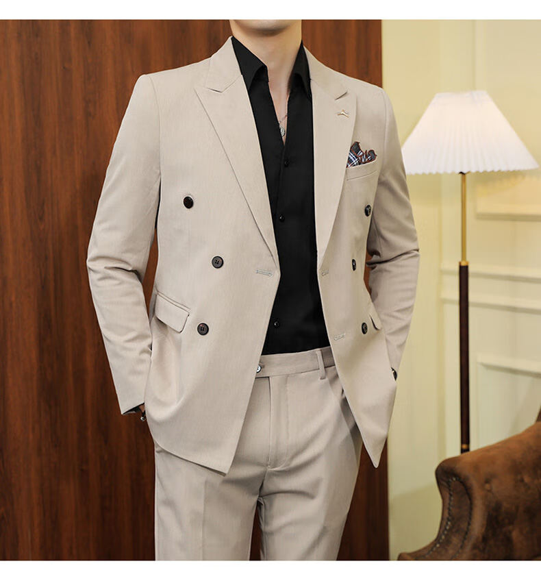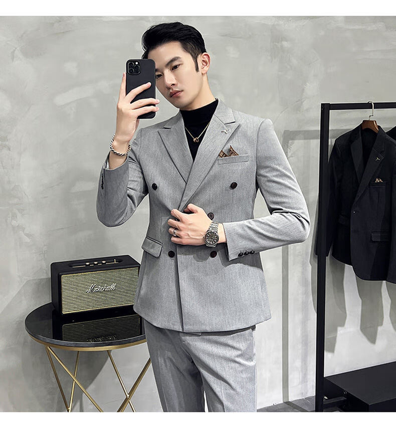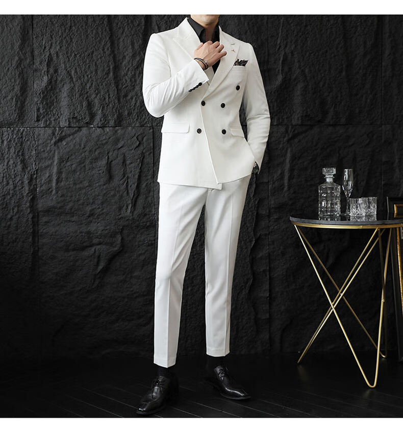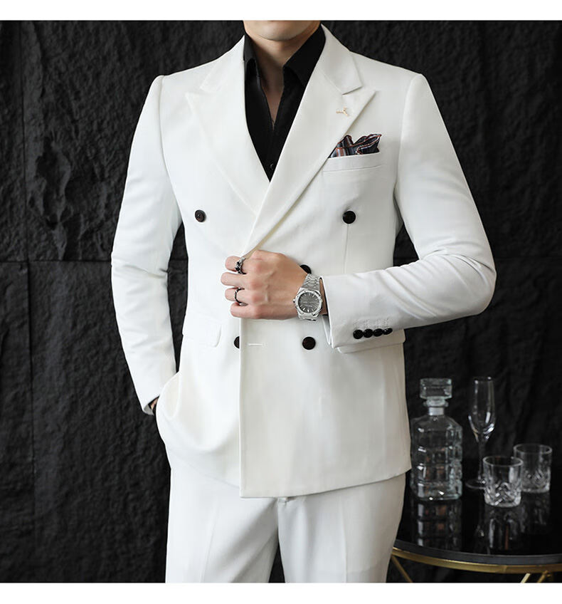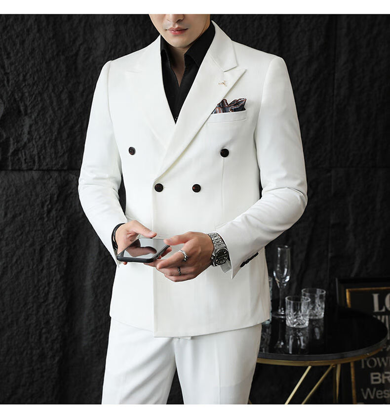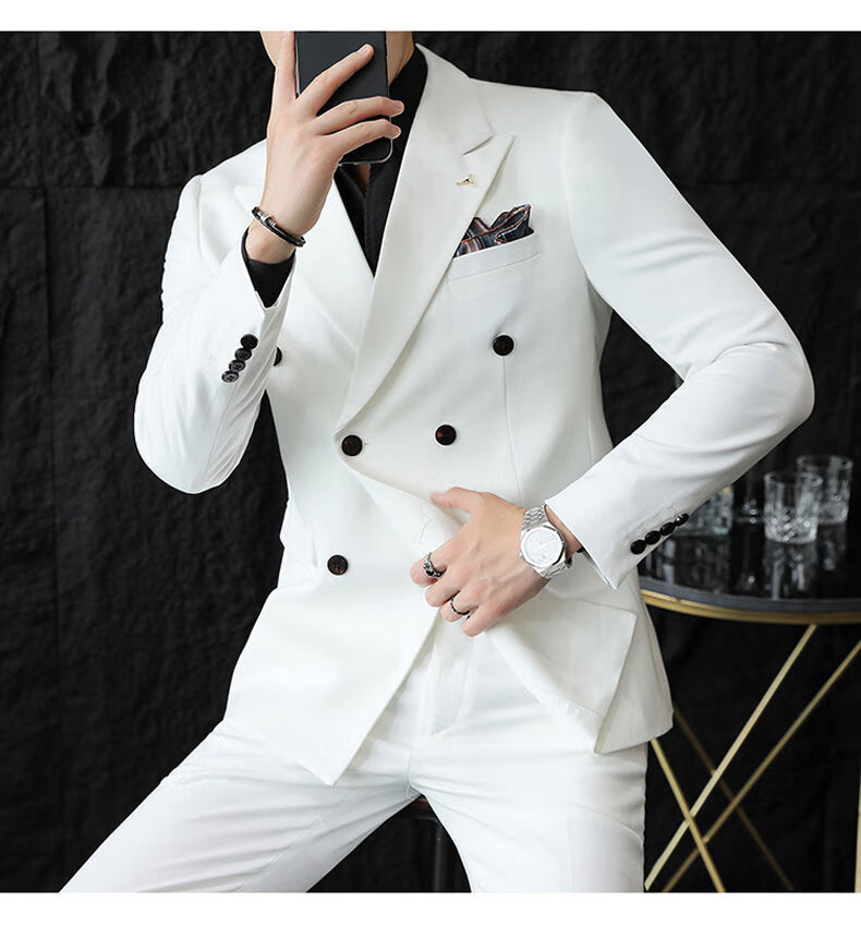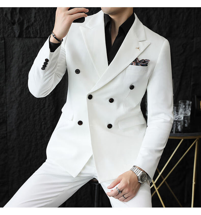 ROMON white double-breasted small suit men's suit Korean version slim casual high-end suit jacket groom wedding dress white two-piece set XL