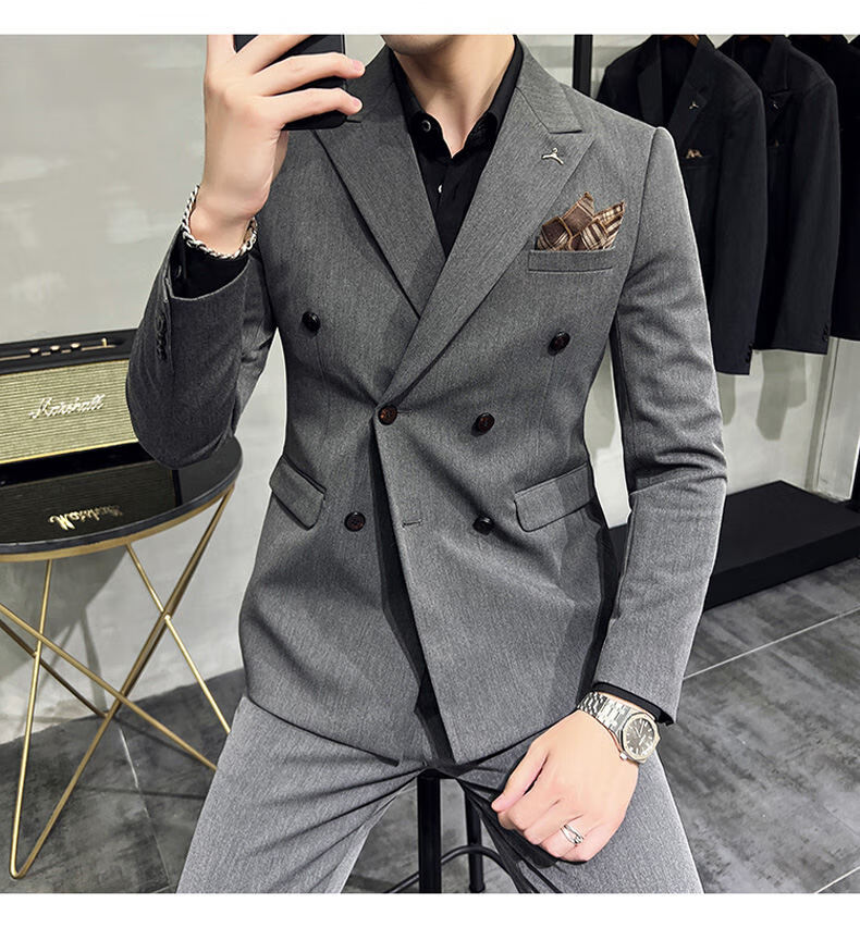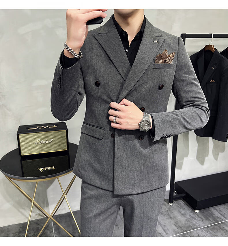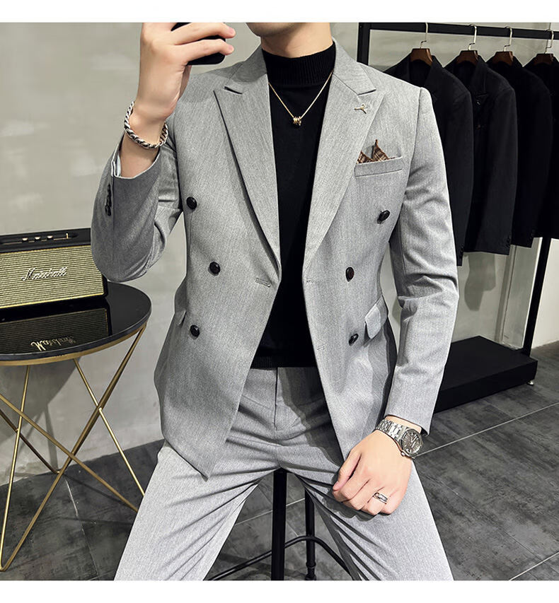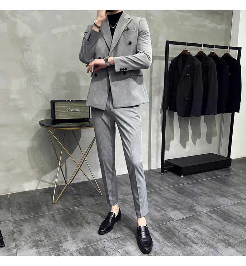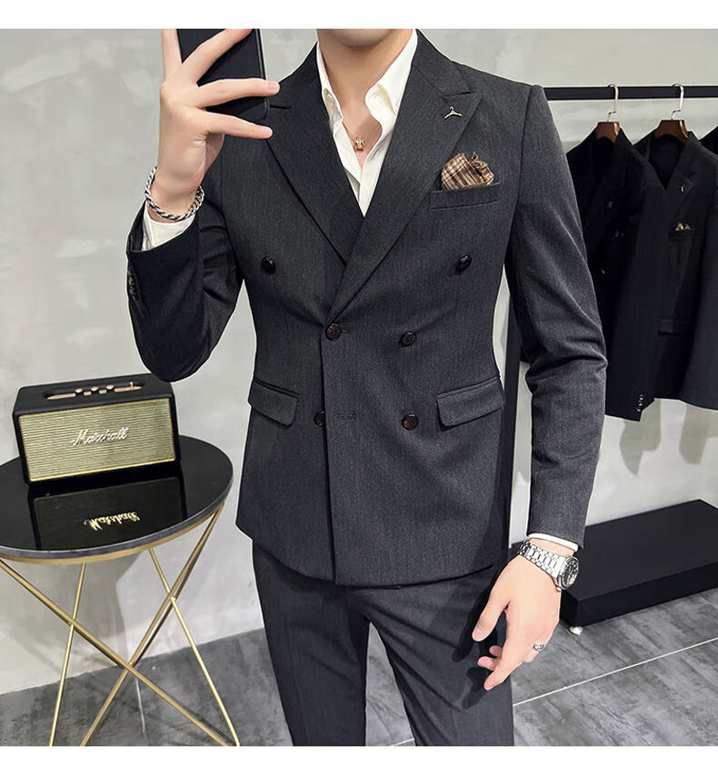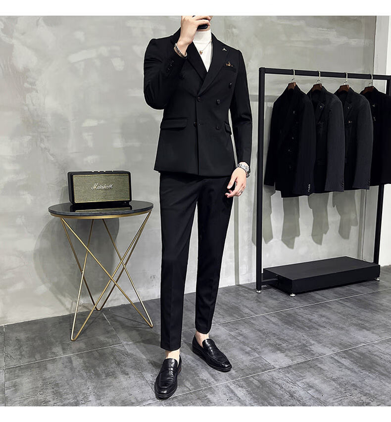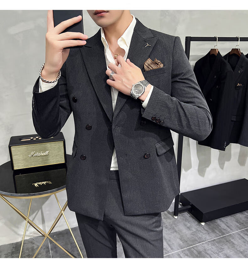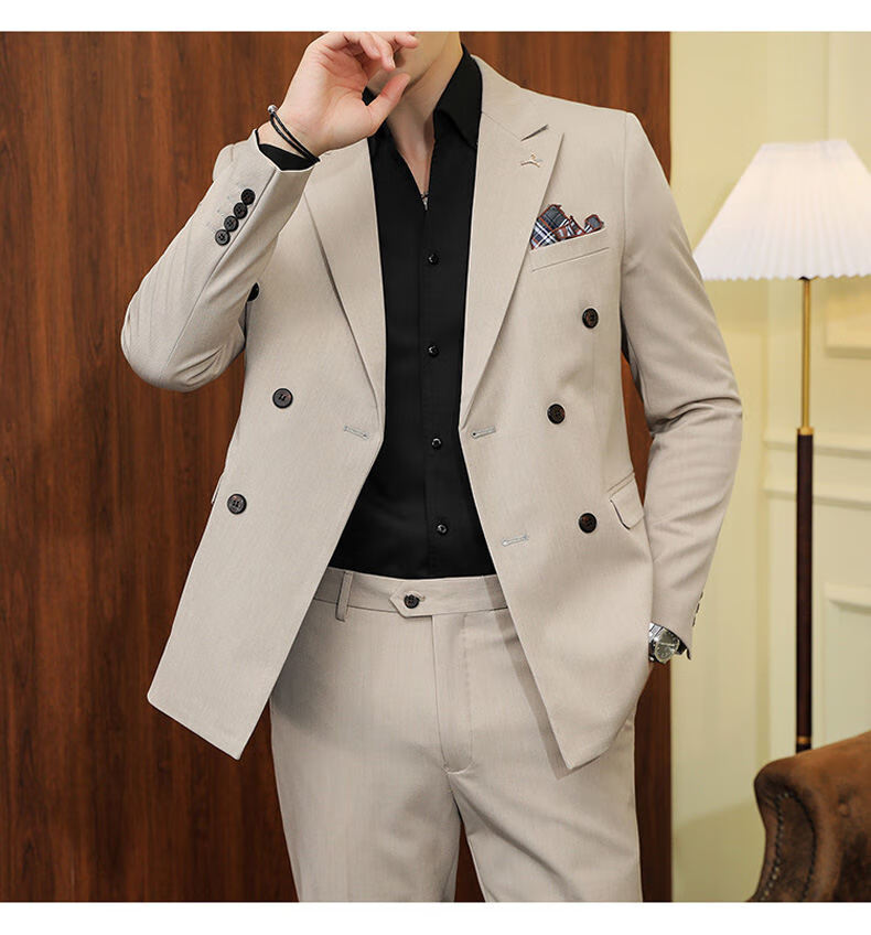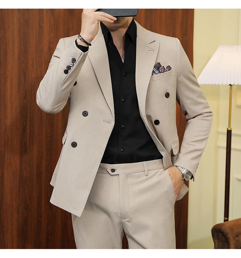 ROMON white double-breasted small suit men's suit Korean version slim casual high-end suit jacket groom wedding dress white two-piece set XL