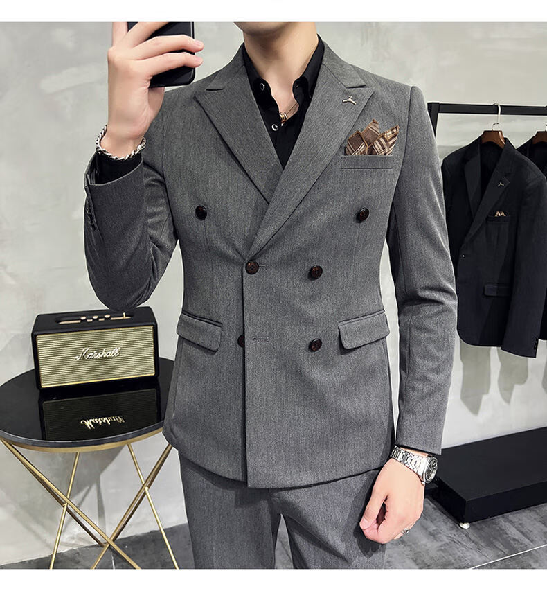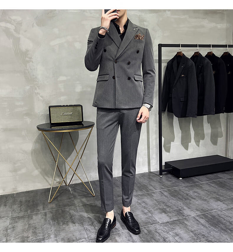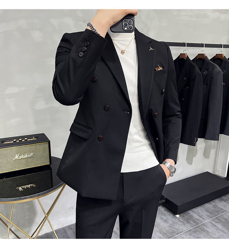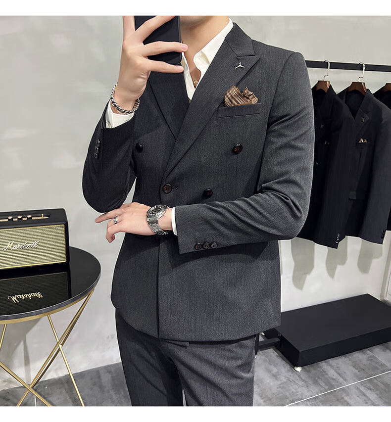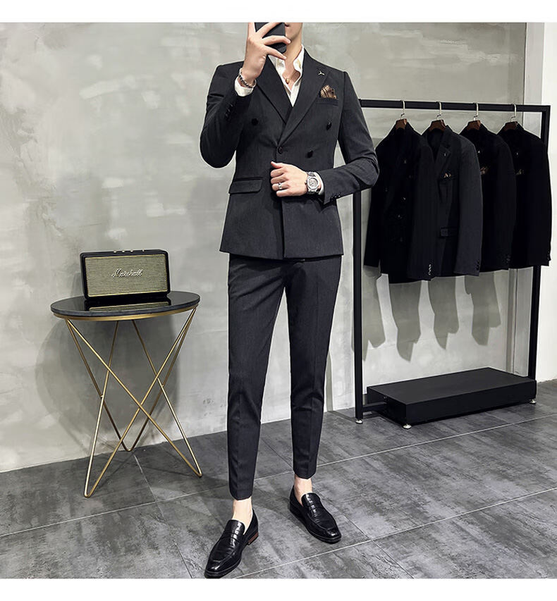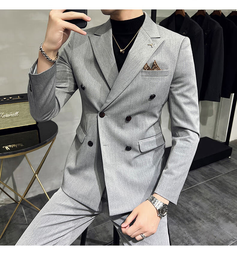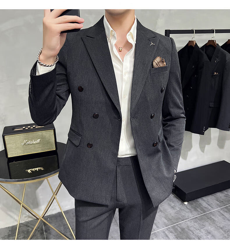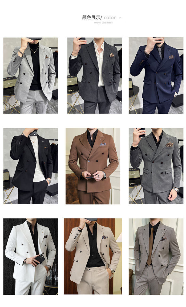 ROMON white double-breasted small suit men's suit Korean version slim casual high-end suit jacket groom wedding dress white two-piece set XL