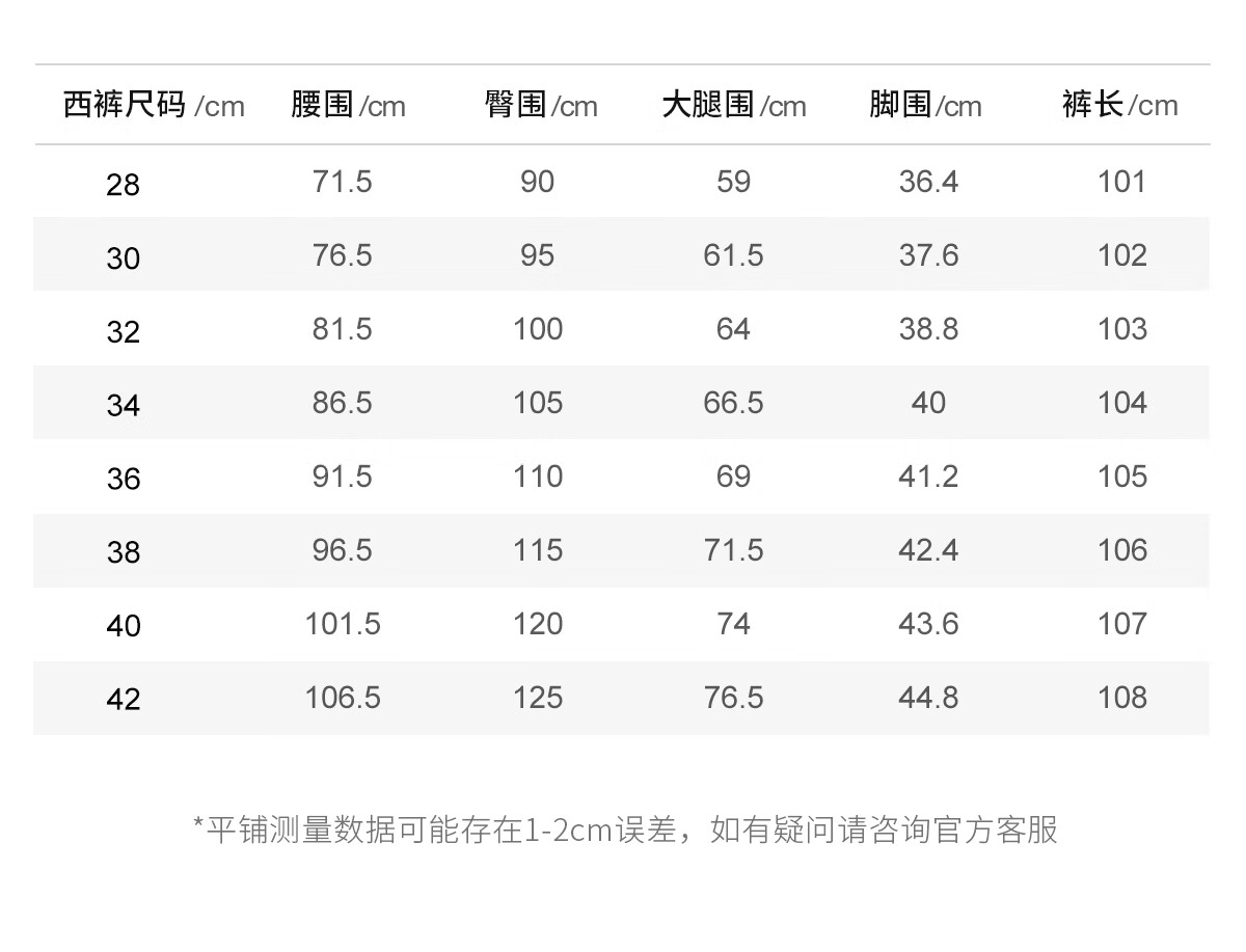 Outseam (cm) 99 cm 101.5 cm 104 cm 106.5 cm 109 cm
