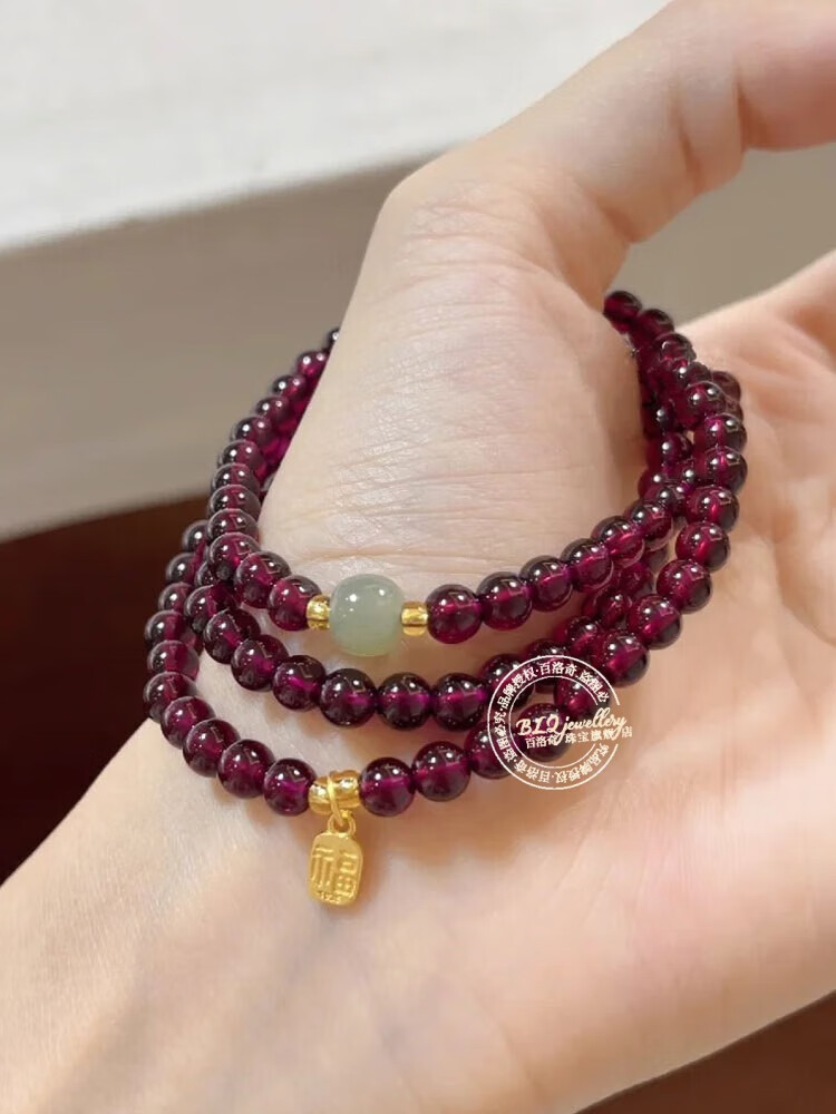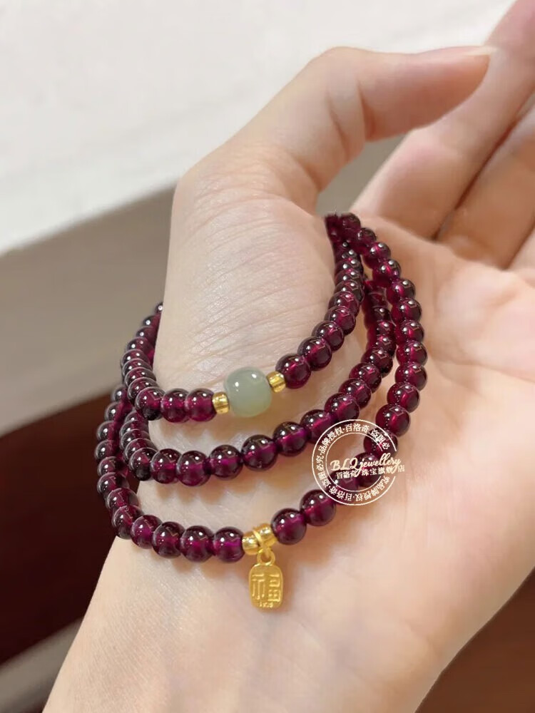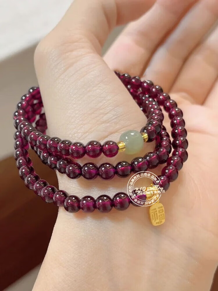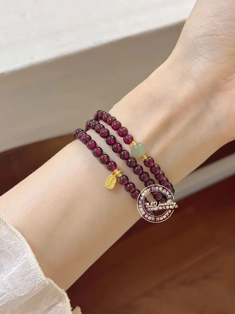 Bailuoqi Burgundy Garnet Bracelet Three Circles 999 Jinfu Bracelet Raw Stone Crystal Women's Bead Diameter 6mm