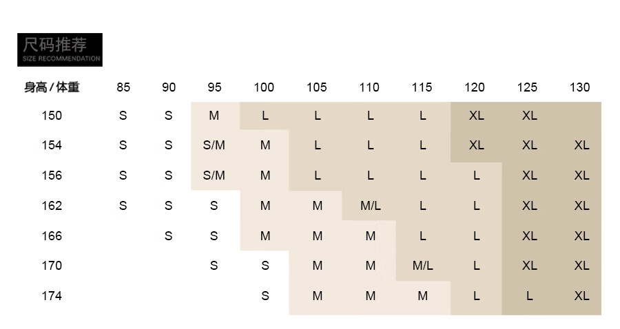 China (cm) 160-165/84-86 165-170 / 88-90 167-172 / 92-96 168-173 / 98-102 170-176 / 106-110