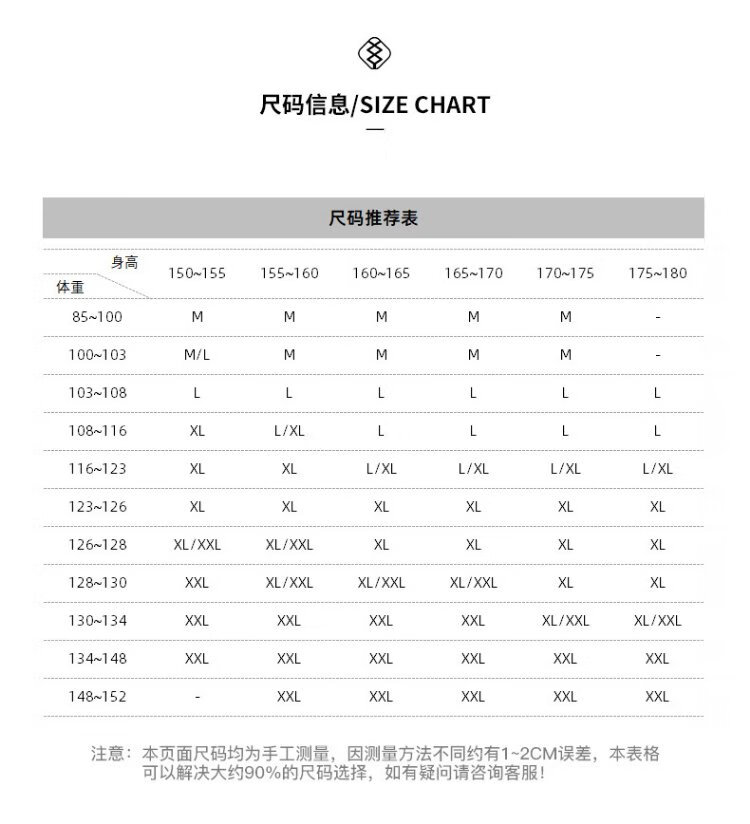 China (cm) 160-165/84-86 165-170 / 88-90 167-172 / 92-96 168-173 / 98-102 170-176 / 106-110